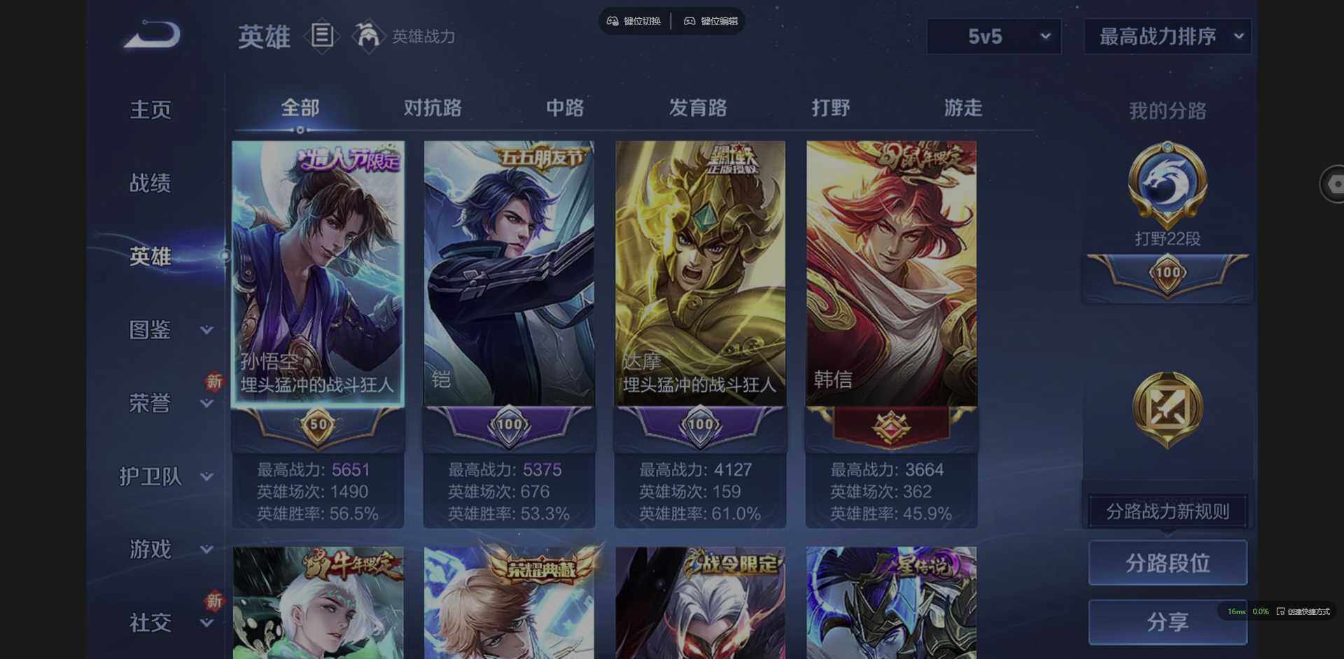 贵族等级: V7 英雄数: 126 皮肤数: 186 荣耀水晶: 鸣剑·曳影