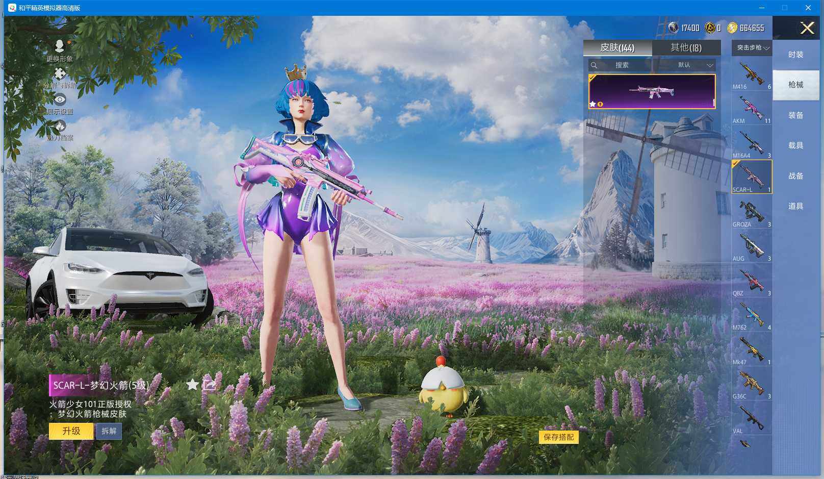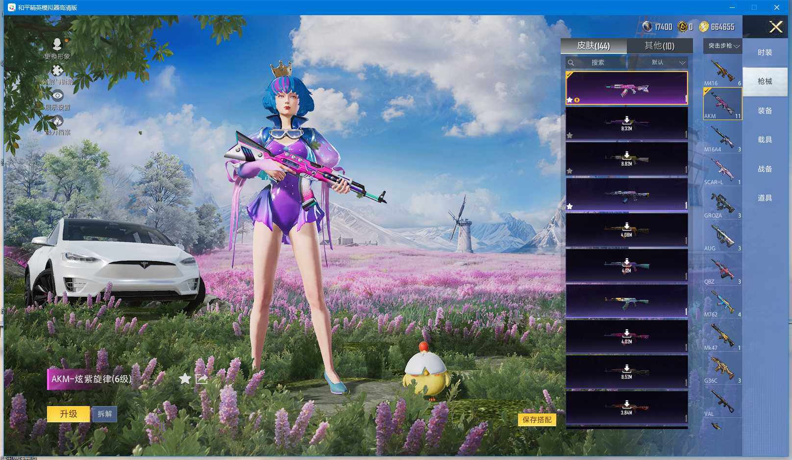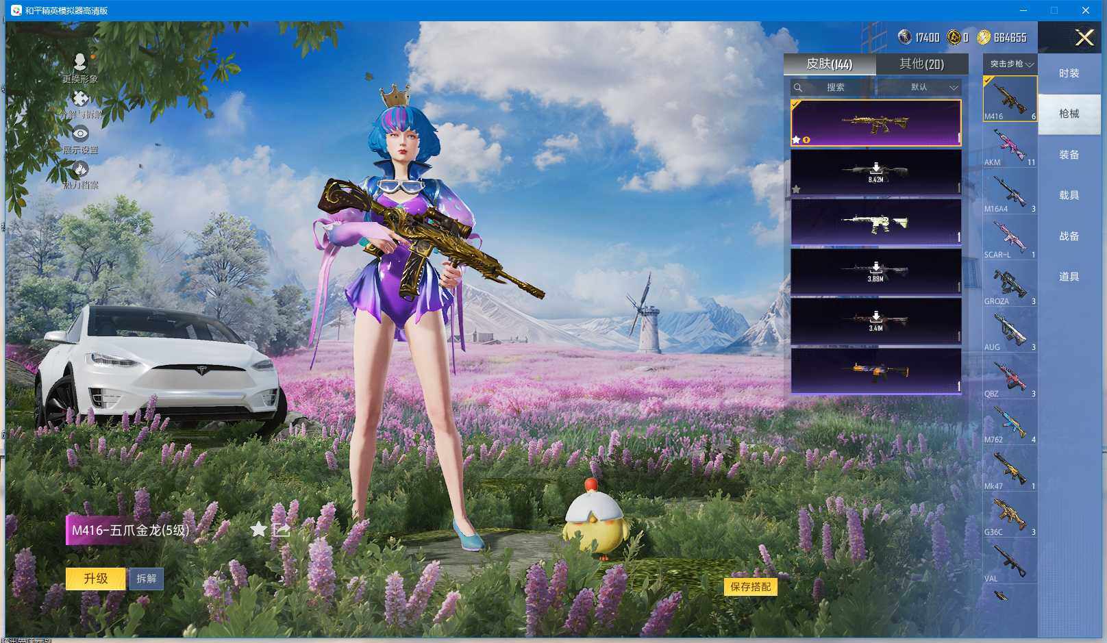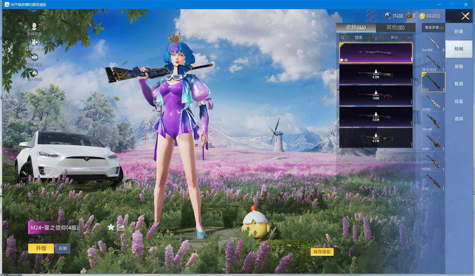 时装数: 136 载具数: 3 枪械数: 144 战备数: 102 热门装扮: 蝶舞迷情,星之信仰,深海曼妙,水曜玄武,精灵迷巫 载具: 玛莎拉蒂Ghibli(粉),双人摩托-梦幻火箭,特斯拉Model X(珍珠白) 稀有枪皮: AKM-炫紫旋律(六级),SCAR-L-梦幻火箭(五级),M416-五爪金龙(五级),Kar98K-巳巳如意(四级),M24-星之信仰(四级),Mini14-龙虾霸霸(