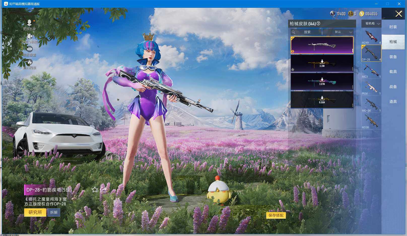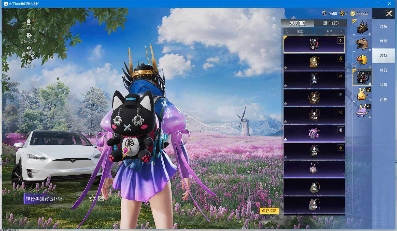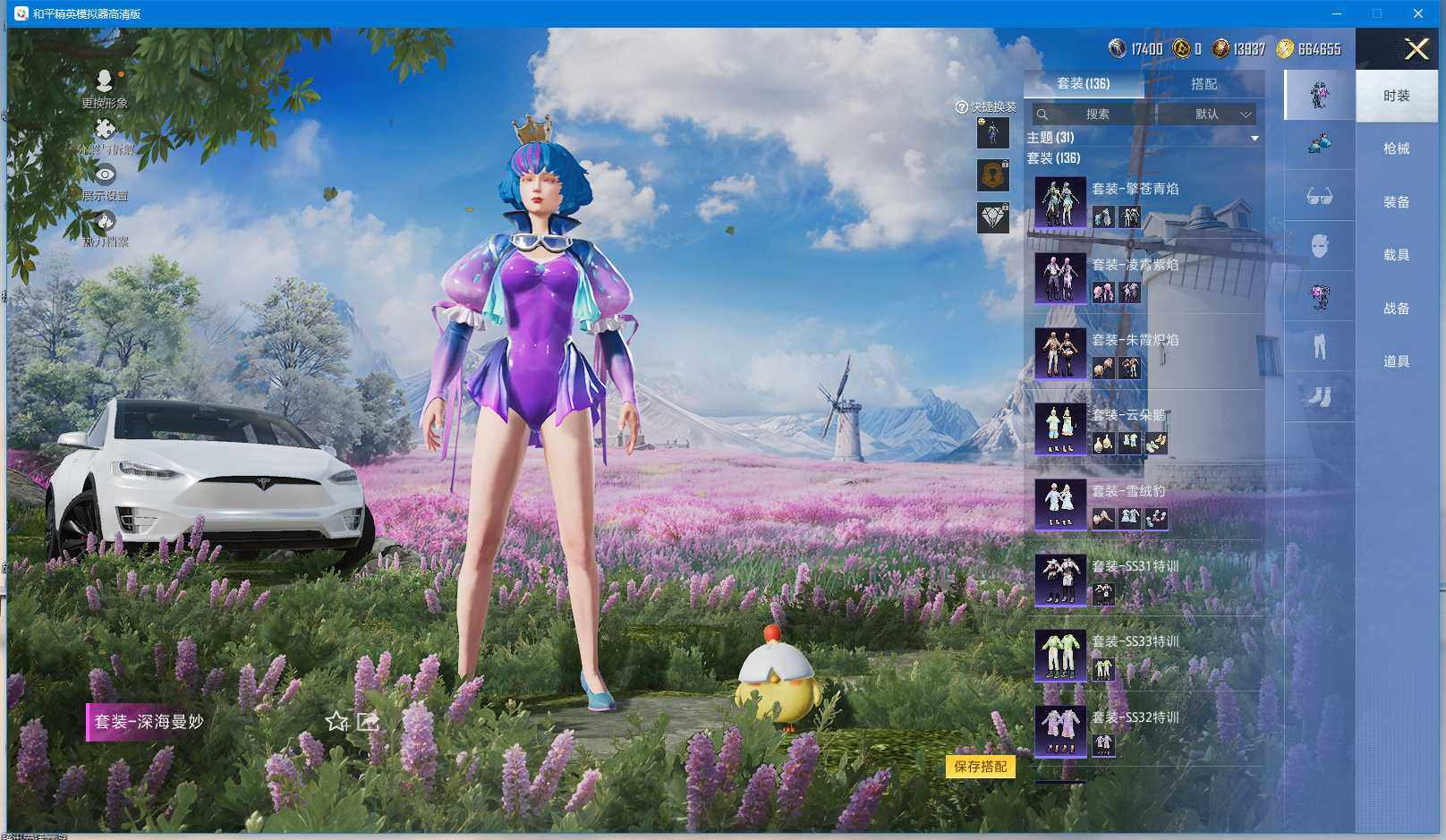 时装数: 136 载具数: 3 枪械数: 144 战备数: 102 热门装扮: 蝶舞迷情,星之信仰,深海曼妙,水曜玄武,精灵迷巫 载具: 玛莎拉蒂Ghibli(粉),双人摩托-梦幻火箭,特斯拉Model X(珍珠白) 稀有枪皮: AKM-炫紫旋律(六级),SCAR-L-梦幻火箭(五级),M416-五爪金龙(五级),Kar98K-巳巳如意(四级),M24-星之信仰(四级),Mini14-龙虾霸霸(