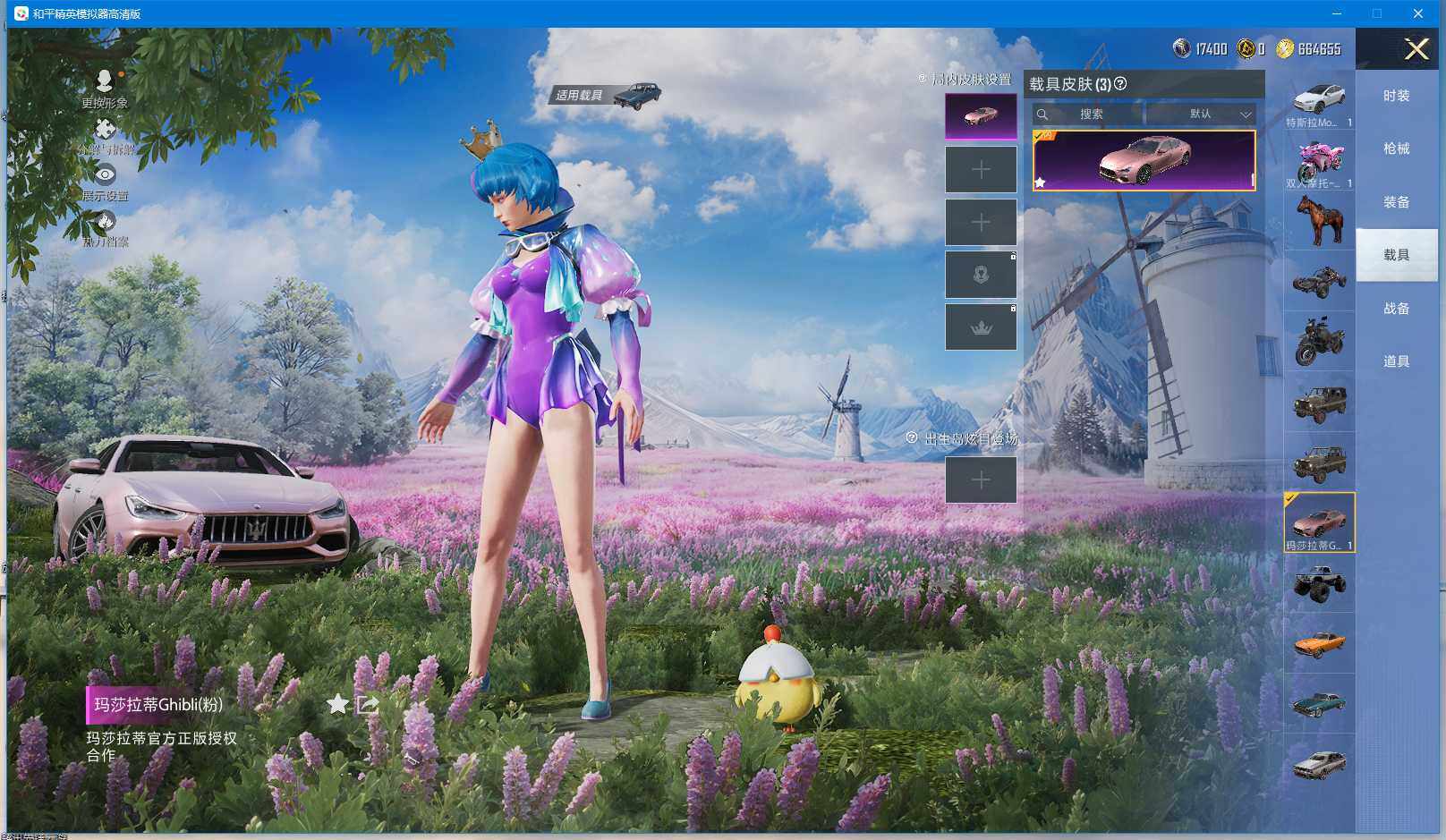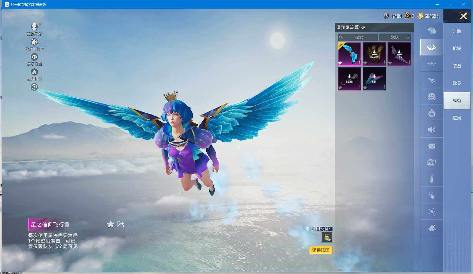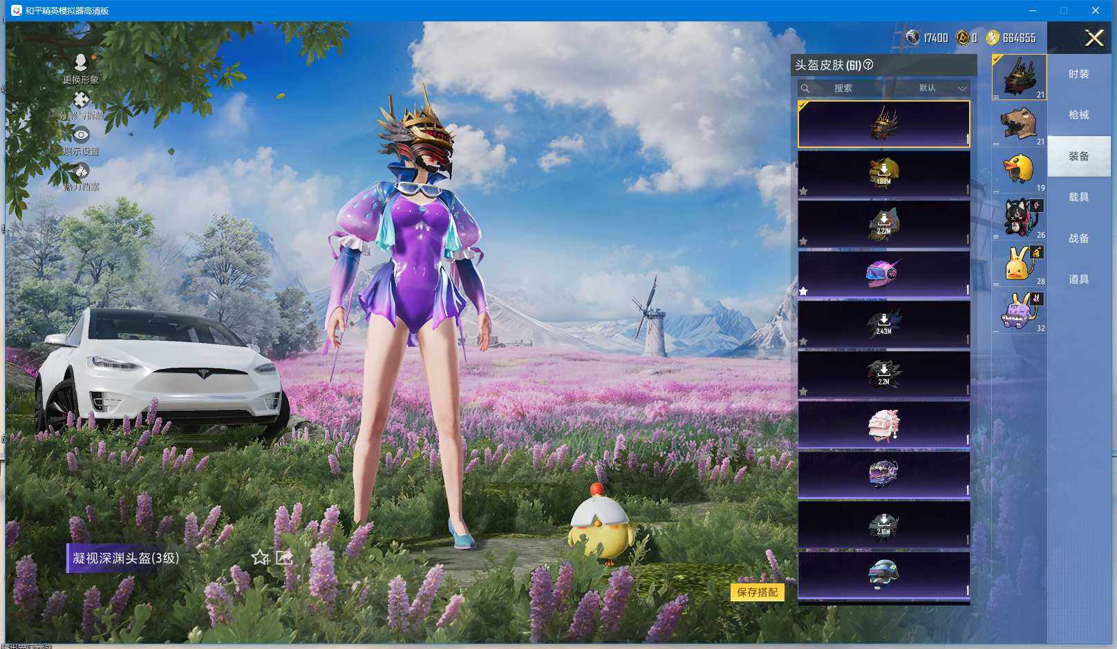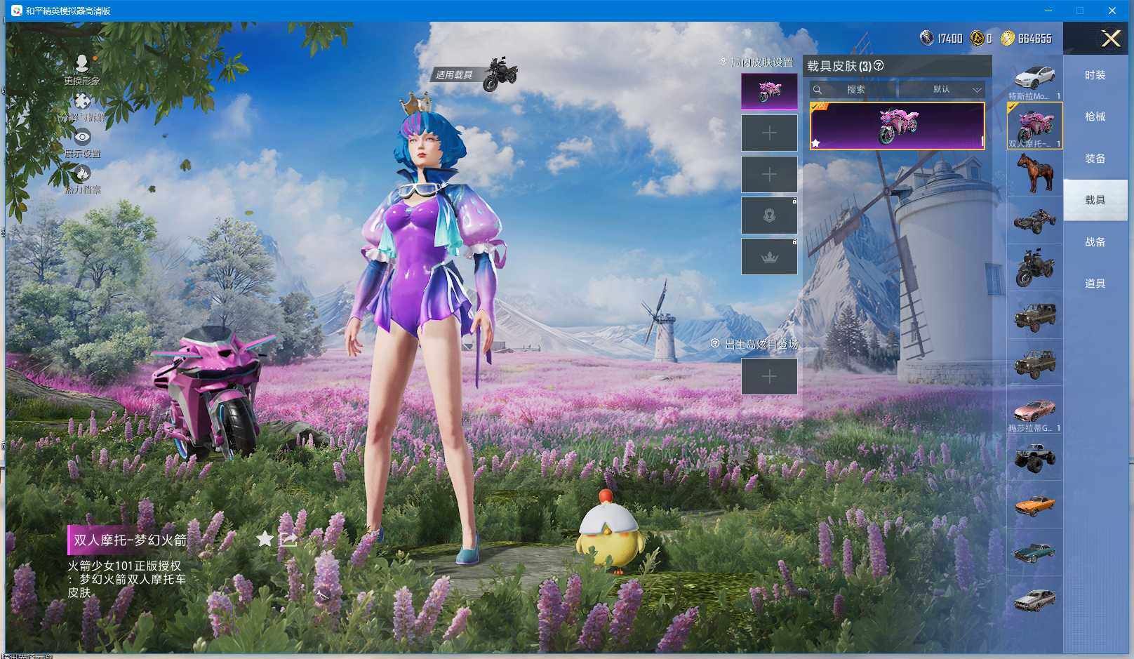 时装数: 136 载具数: 3 枪械数: 144 战备数: 102 热门装扮: 蝶舞迷情,星之信仰,深海曼妙,水曜玄武,精灵迷巫 载具: 玛莎拉蒂Ghibli(粉),双人摩托-梦幻火箭,特斯拉Model X(珍珠白) 稀有枪皮: AKM-炫紫旋律(六级),SCAR-L-梦幻火箭(五级),M416-五爪金龙(五级),Kar98K-巳巳如意(四级),M24-星之信仰(四级),Mini14-龙虾霸霸(