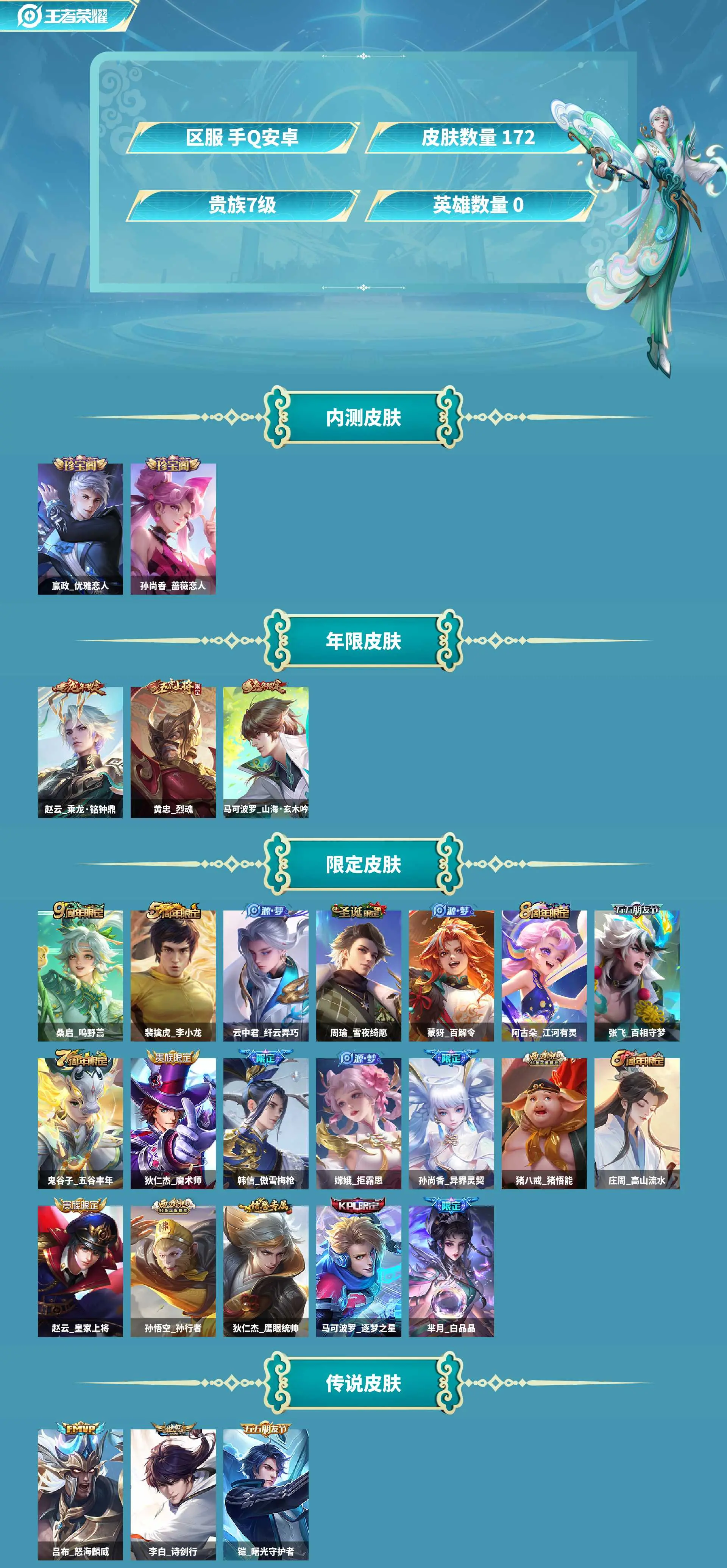 2市标皮肤数172传说皮肤数6史诗皮肤数64英雄数121贵族