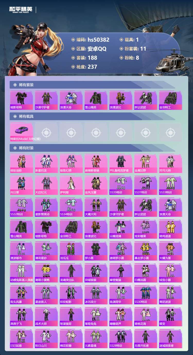 hs50382 安卓手Q-17王牌印记-有战神框-11粉装-8特效枪-1载具-90592热力值-18