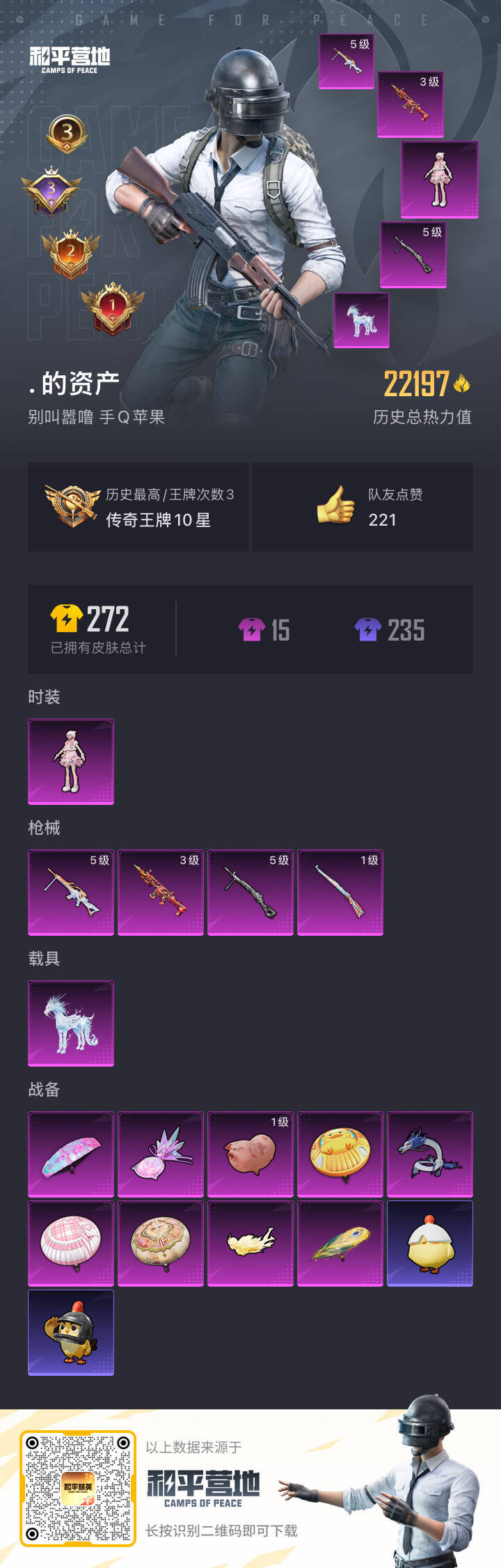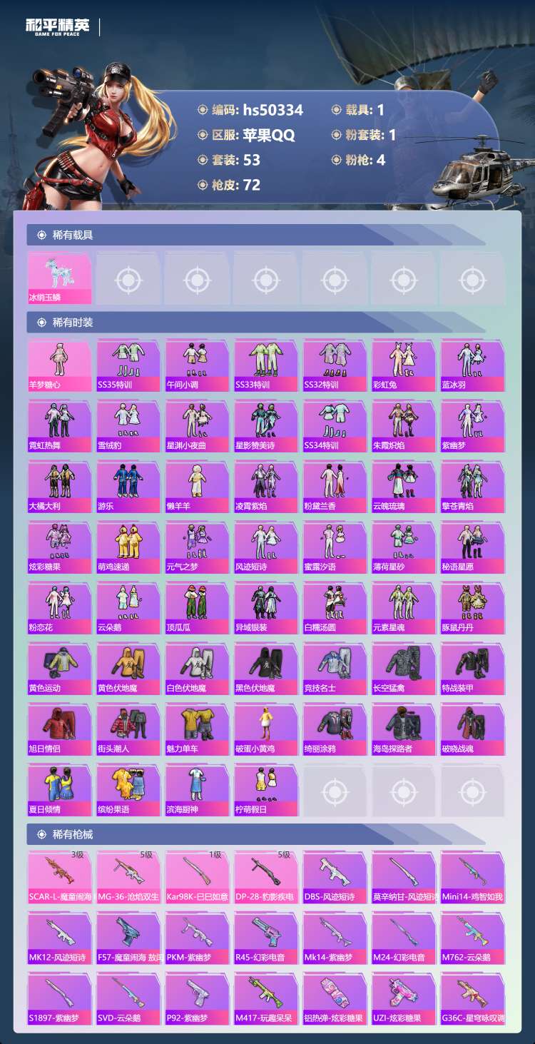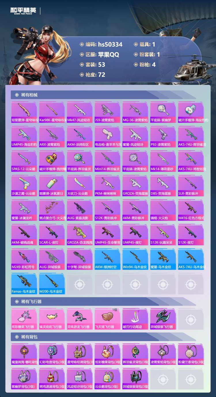 hs50334 苹果手Q-3王牌印记-1粉装-4特效枪-1载具-22197热力值-53套装-72枪皮