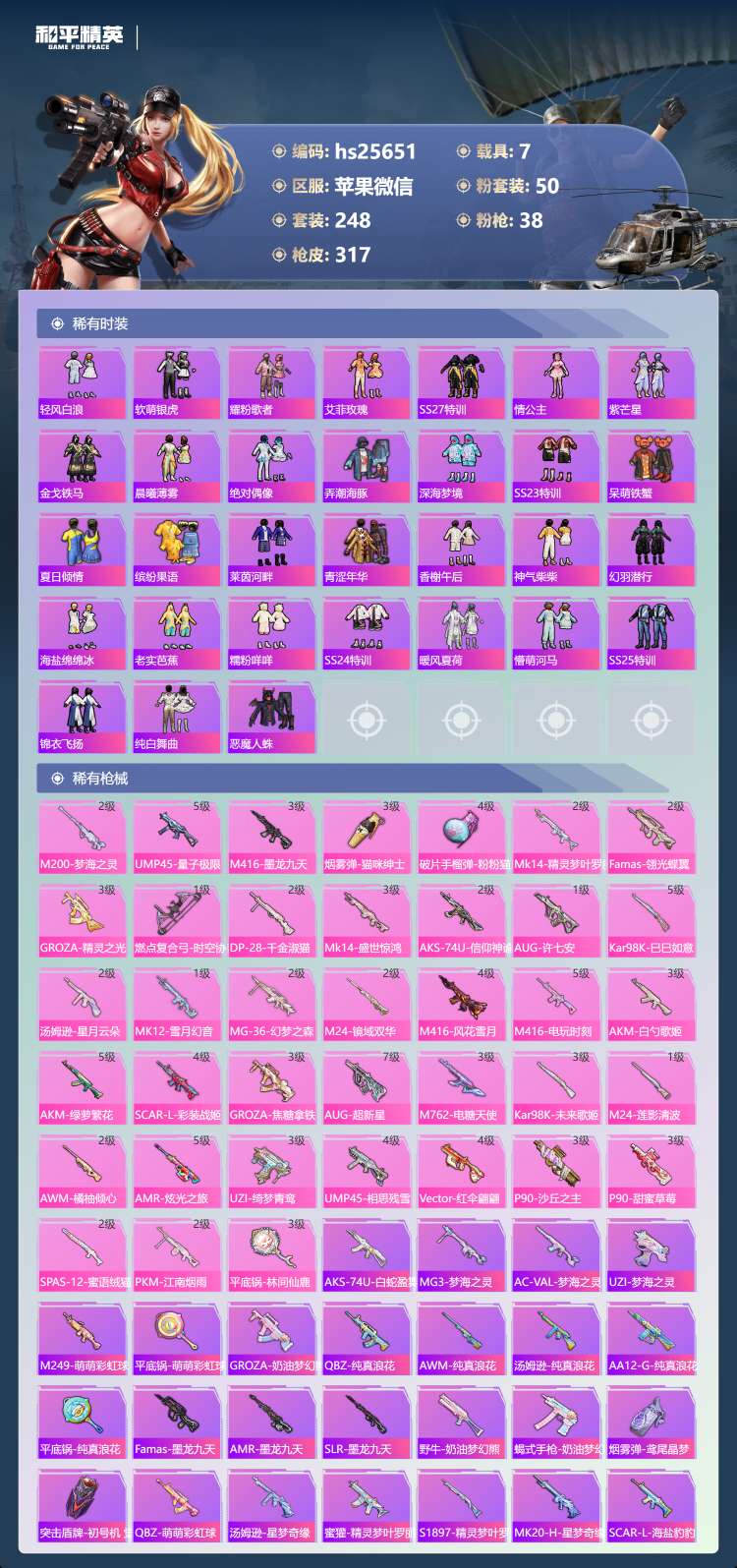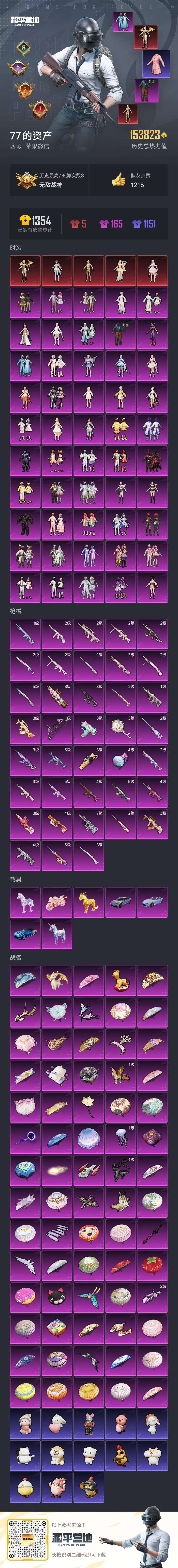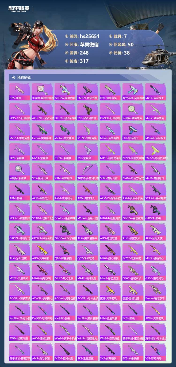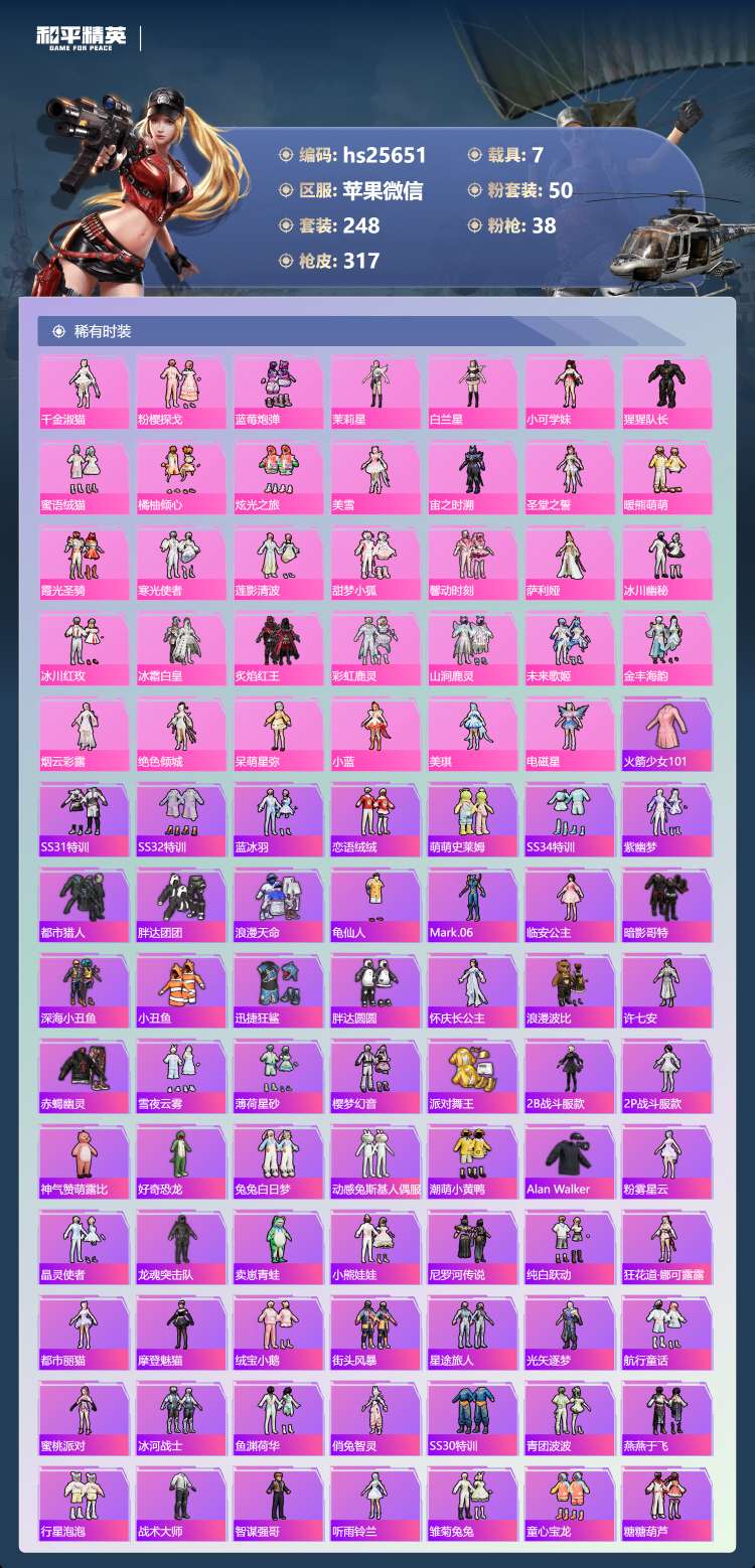 苹果微-8王牌印记-有战神框-5红装-50粉装-38特效枪-7载具-153823热力值hs2565