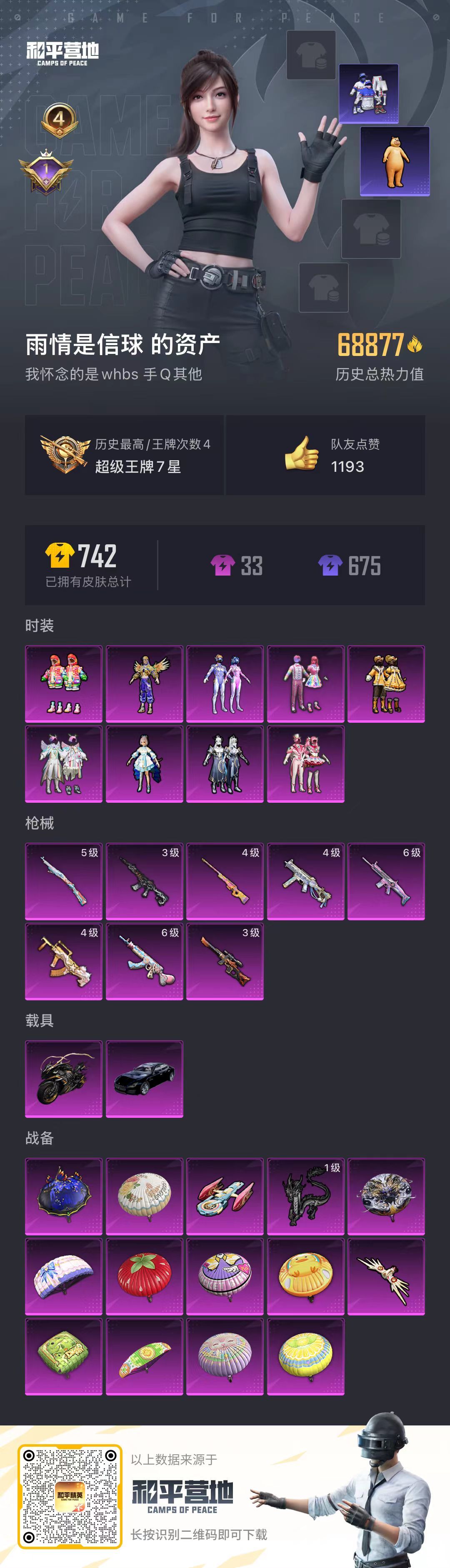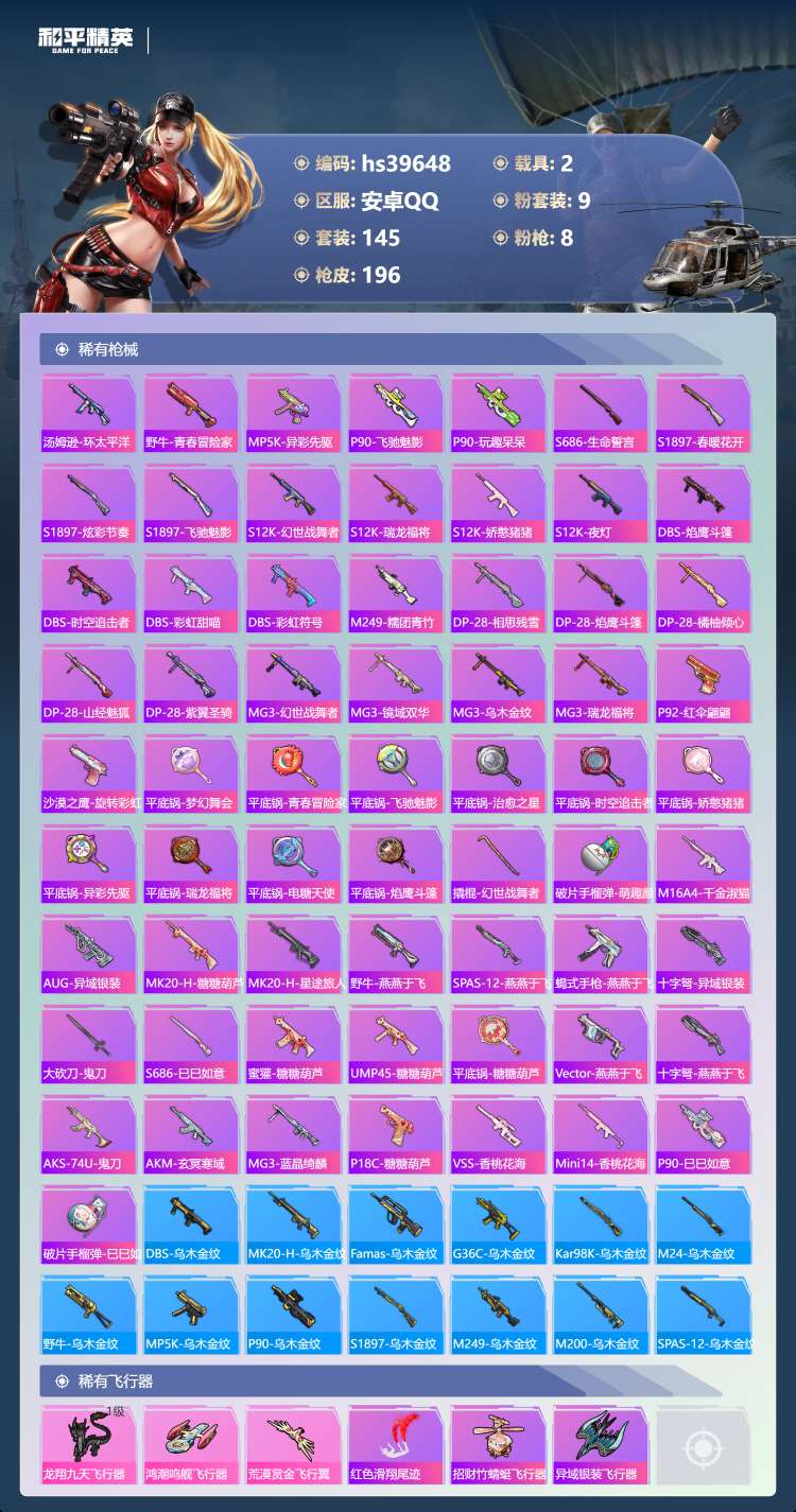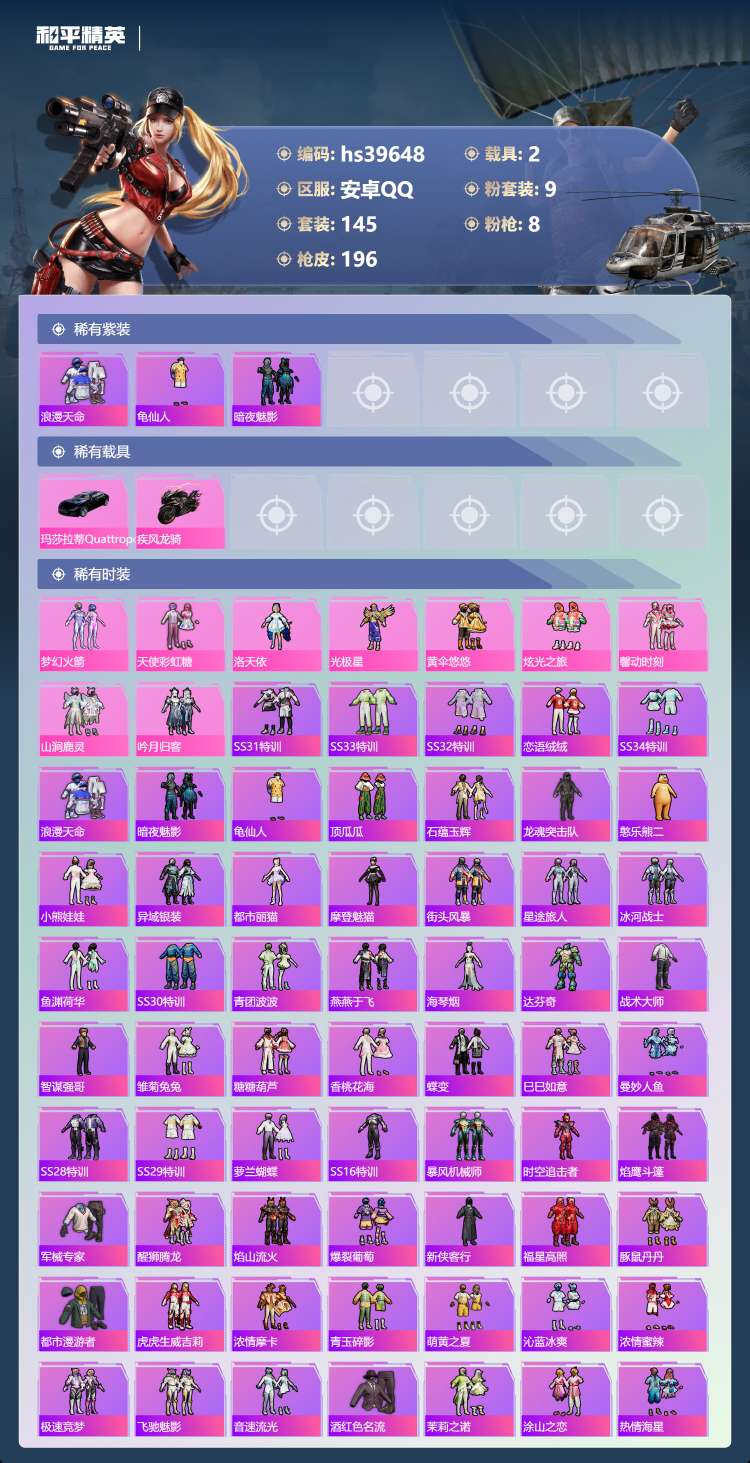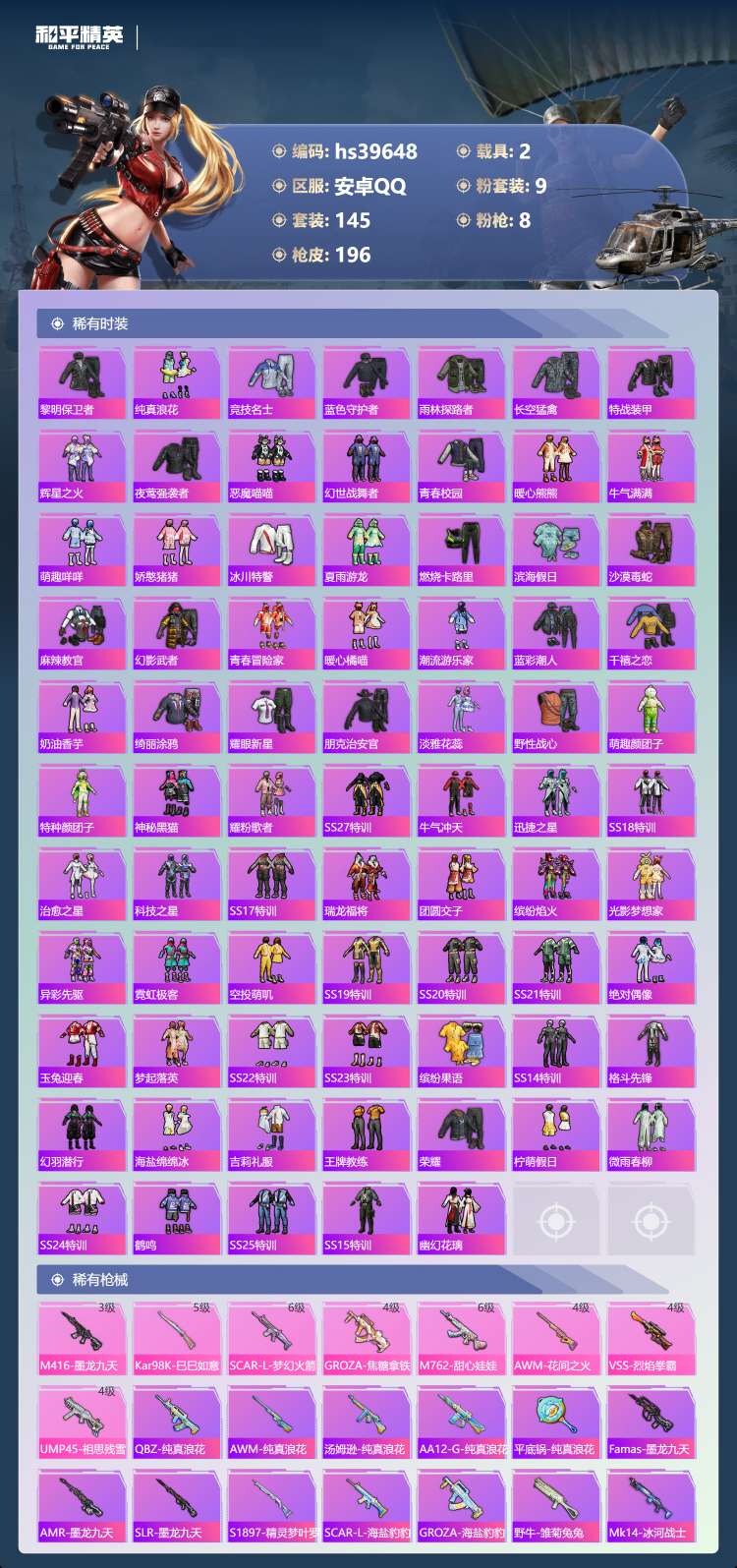 hs39648 安卓手Q-4王牌印记-9粉装-8特效枪-2载具-68988热力值-145套装-196
