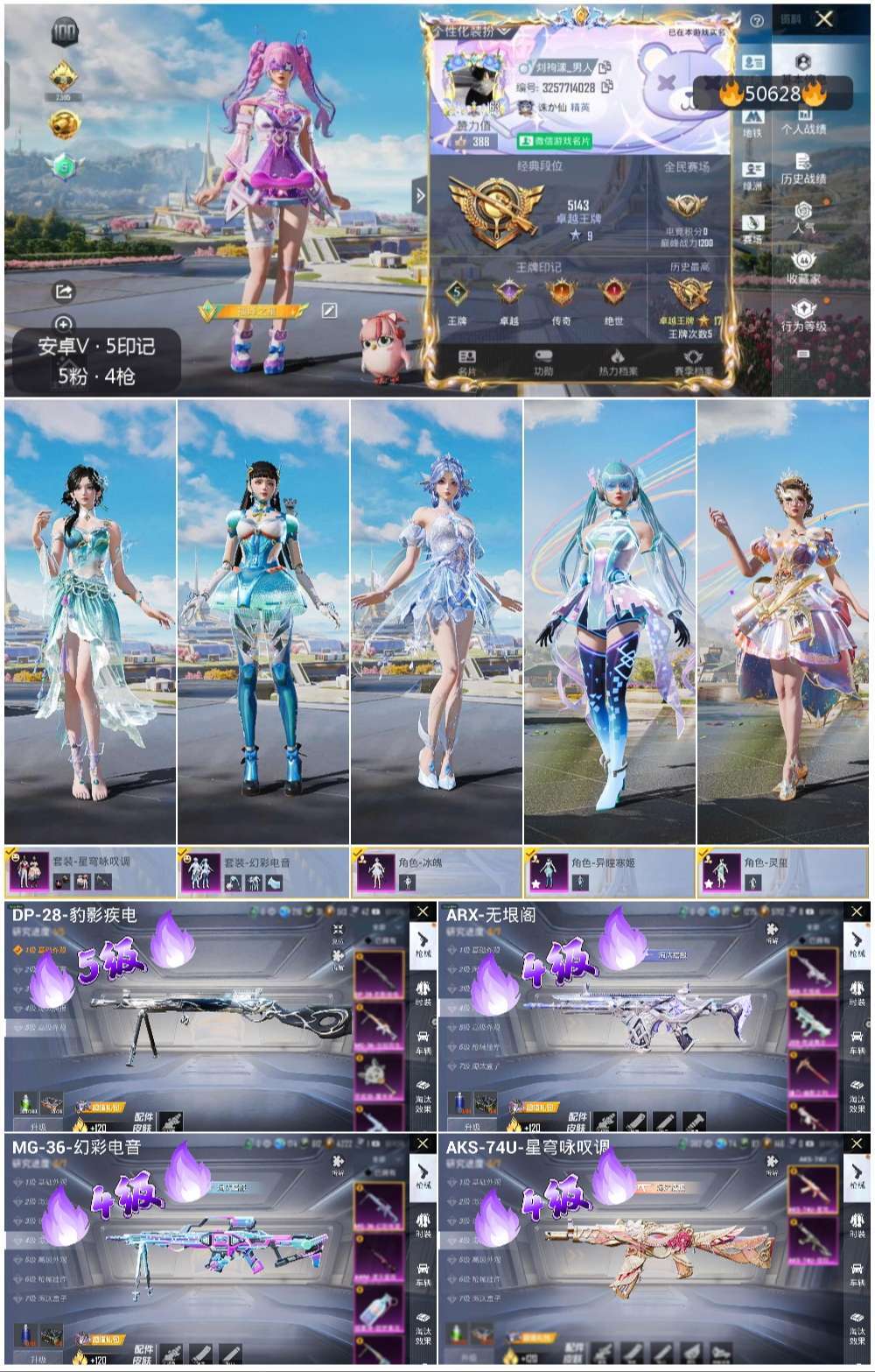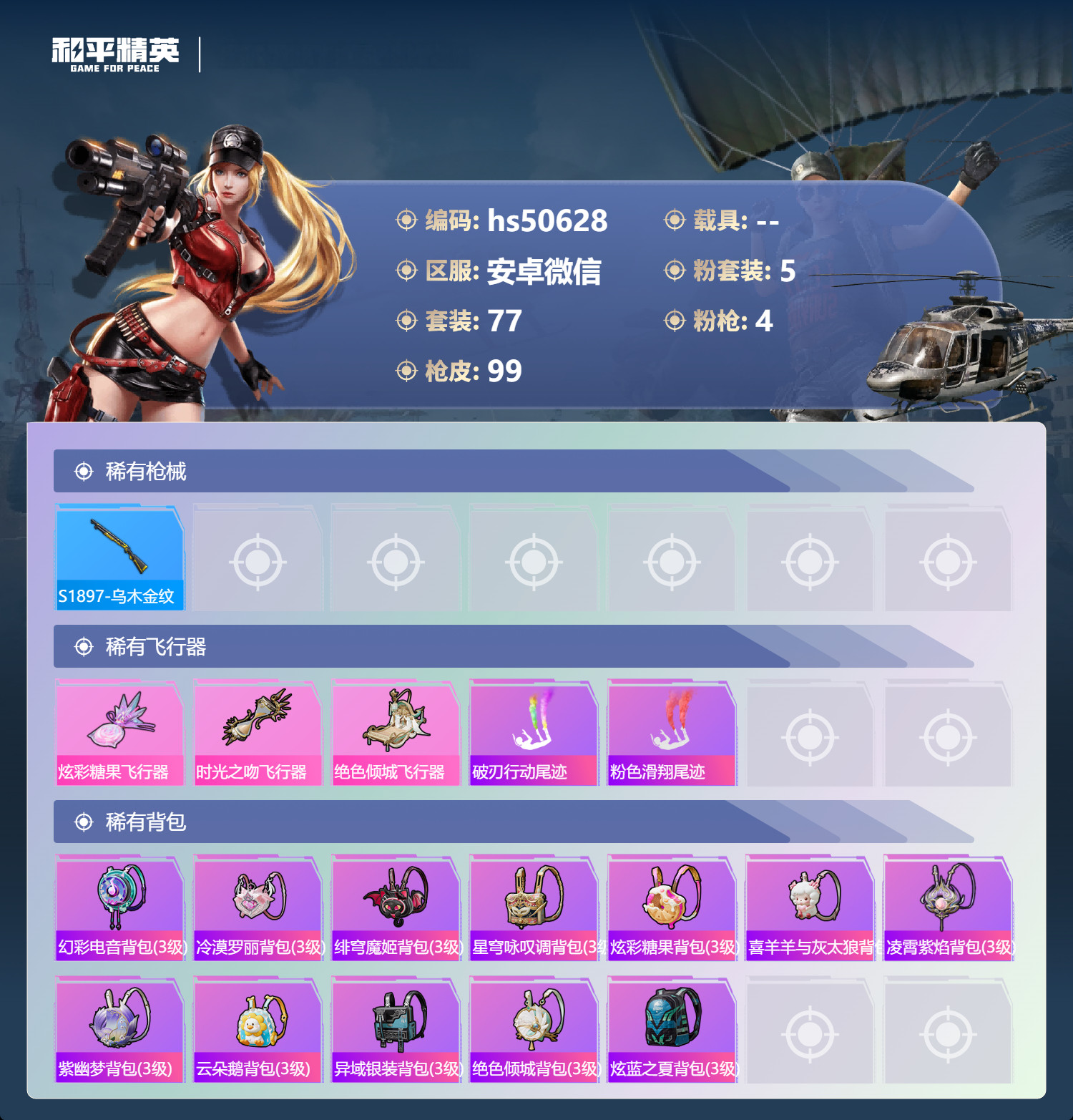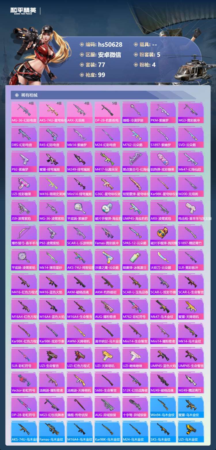hs50628 安卓微-5王牌印记-5粉装-4特效枪-29424热力值-77套装-99枪皮-4卓越