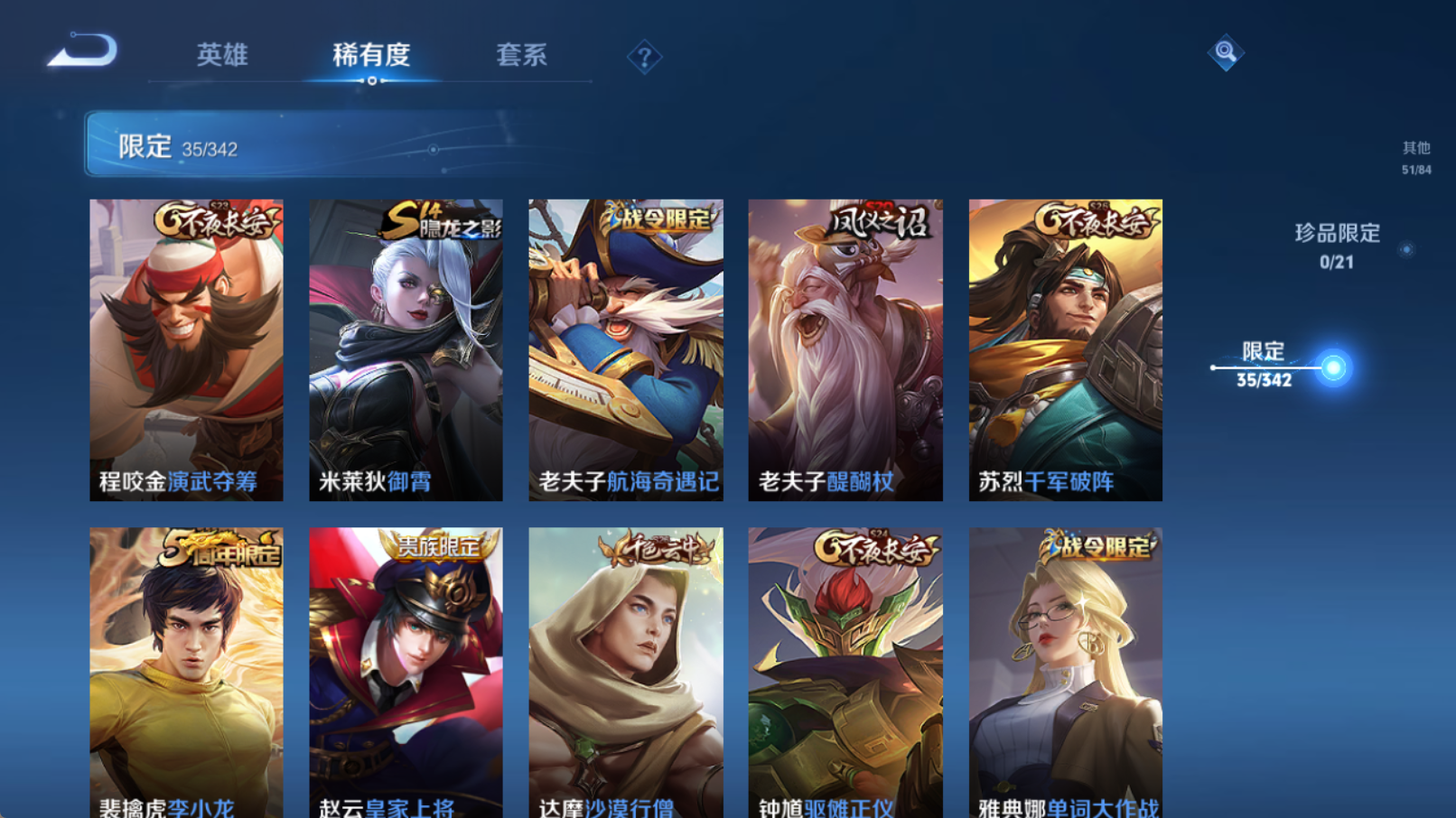 【史诗皮肤】 傲雪梅枪 谧流熔炉 琥珀纪元 拒霜思 魅力维加斯 魔术师 鹰眼统帅 白龙吟 水晶猎龙者 曙光守护者 航海奇遇记 德古拉伯爵 天才门将 金属风暴 梁祝 李小龙 水果甜心 蔷薇恋人 乘风破浪 苍穹之光 摇滚巨星 纤云弄巧 乱世虎臣 皇家上将 冰雪圆舞曲 黄金分割率 高山流水 节奏热浪 特工魅影