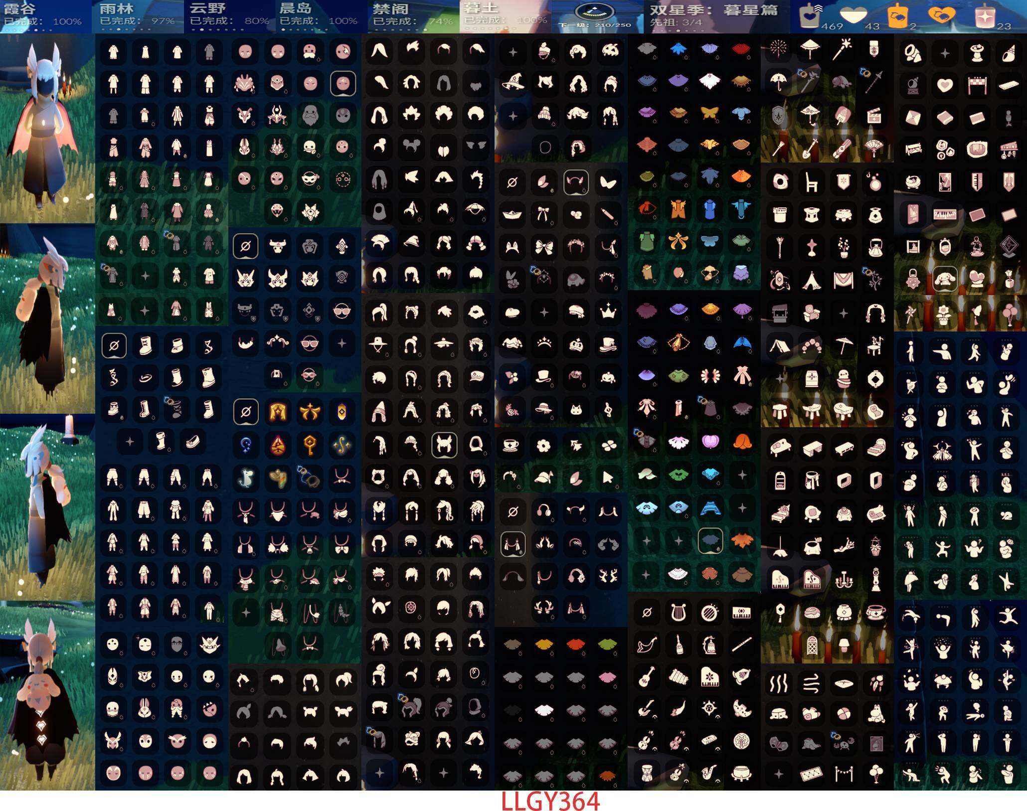 地图:霞谷 晨岛 墓土 季节:表演季 欧若拉季 夜行季 归巢季 筑巢季 二重奏季 姆明季 彩染季 蜡烛数量:469爱心:43翼数量:210热门物品:妮妮长裙 武士裤 矮人面具 黑脸 麻花辫 学生头 姆明尾巴 狮子头 卡卡 平菇 龙骨 书虫 箬笠 花环 斜太 正太 虚荣 白枭 樱花 巫师帽 猫猫头 蝴蝶结 99玉兔发饰 四叶草 耳机 耳钉 白斗 欧若