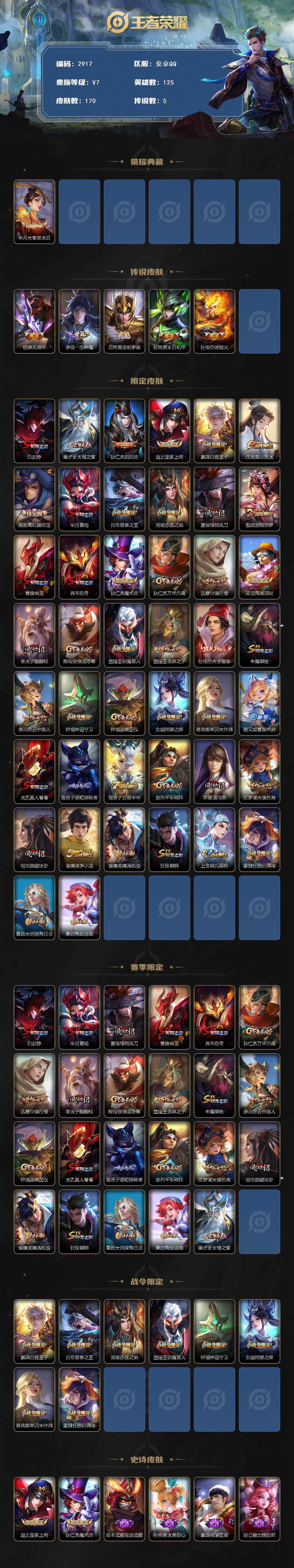 安卓Q-V1-尊贵铂金II段位-125英雄-170皮肤-1典藏-0珍品无双-0