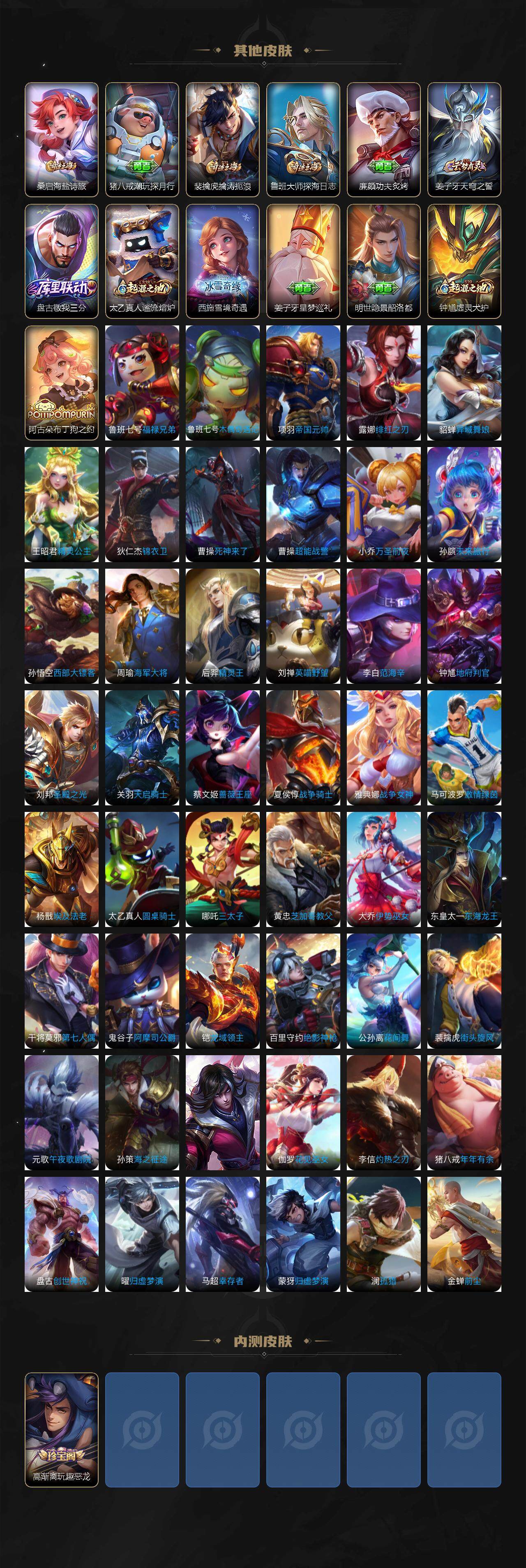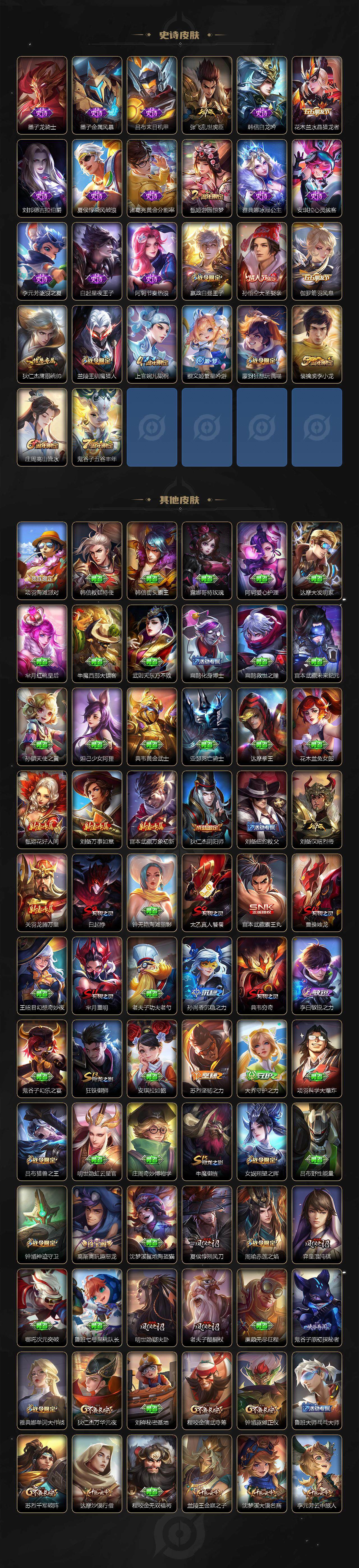 【限定皮肤】:白起狰,姜子牙天穹之誓,狄仁杰阴阳师,赵云皇家上将,嬴政白昼王子,庄周高山流水,高渐离玩趣恶龙,芈月重明,吕布猎兽之王,周瑜