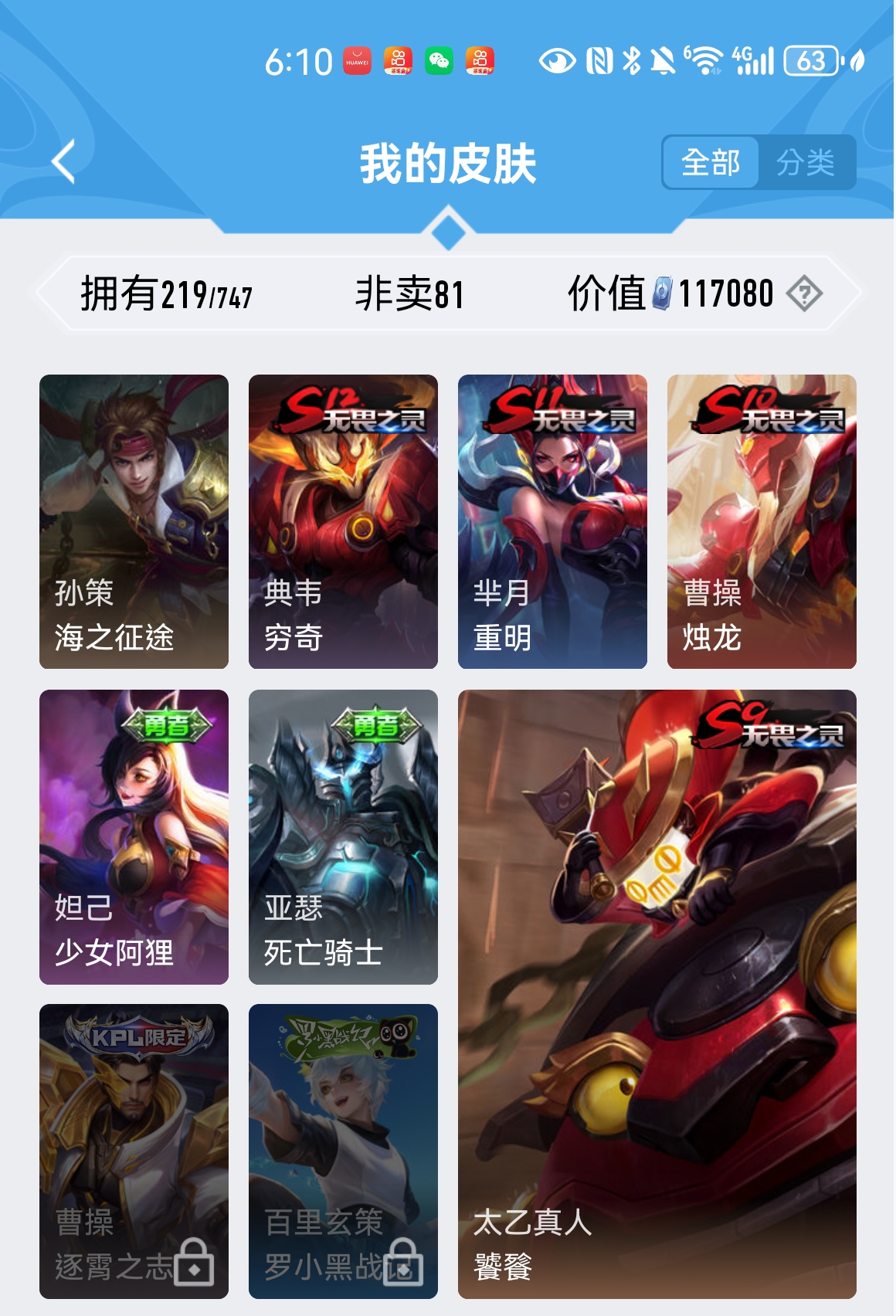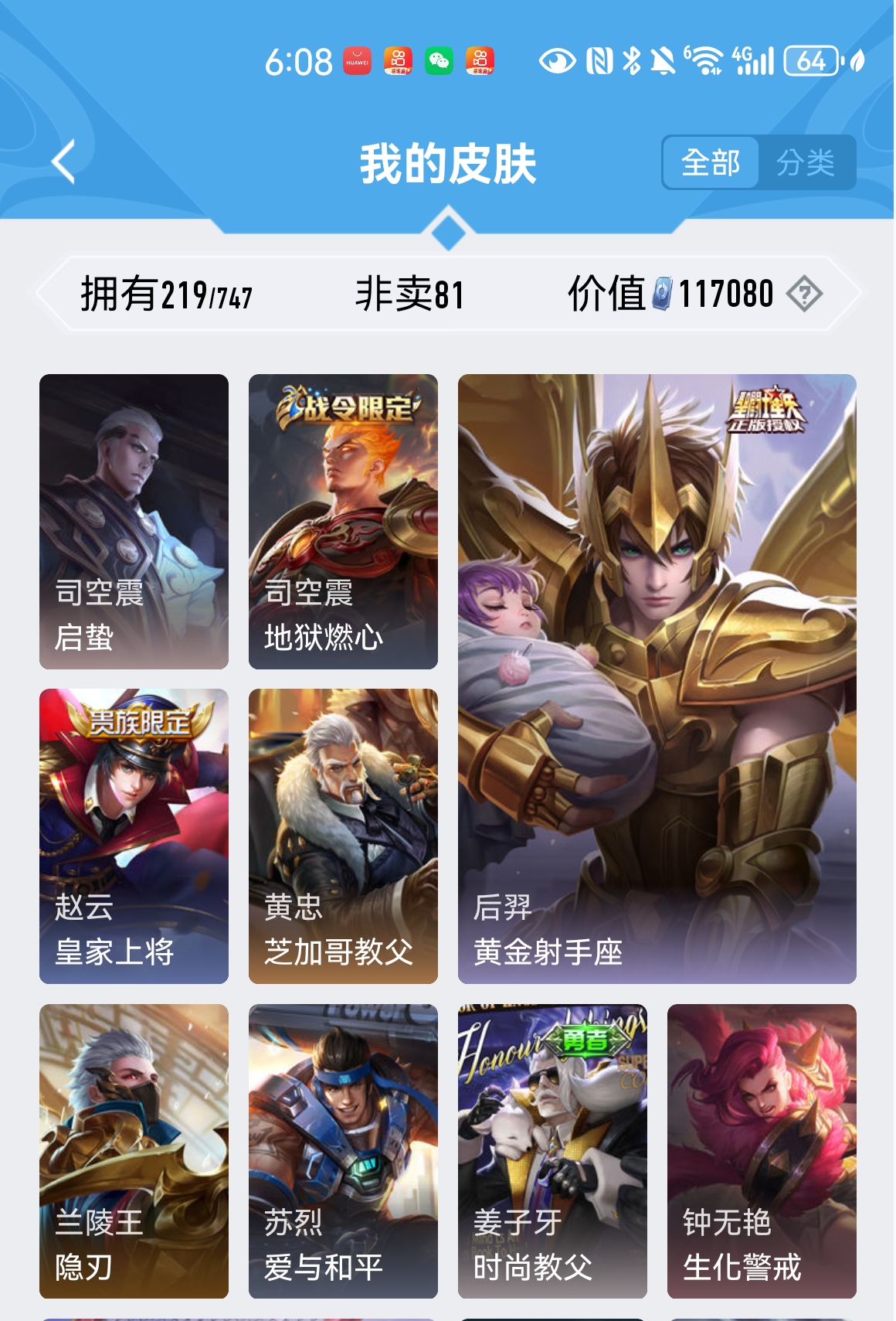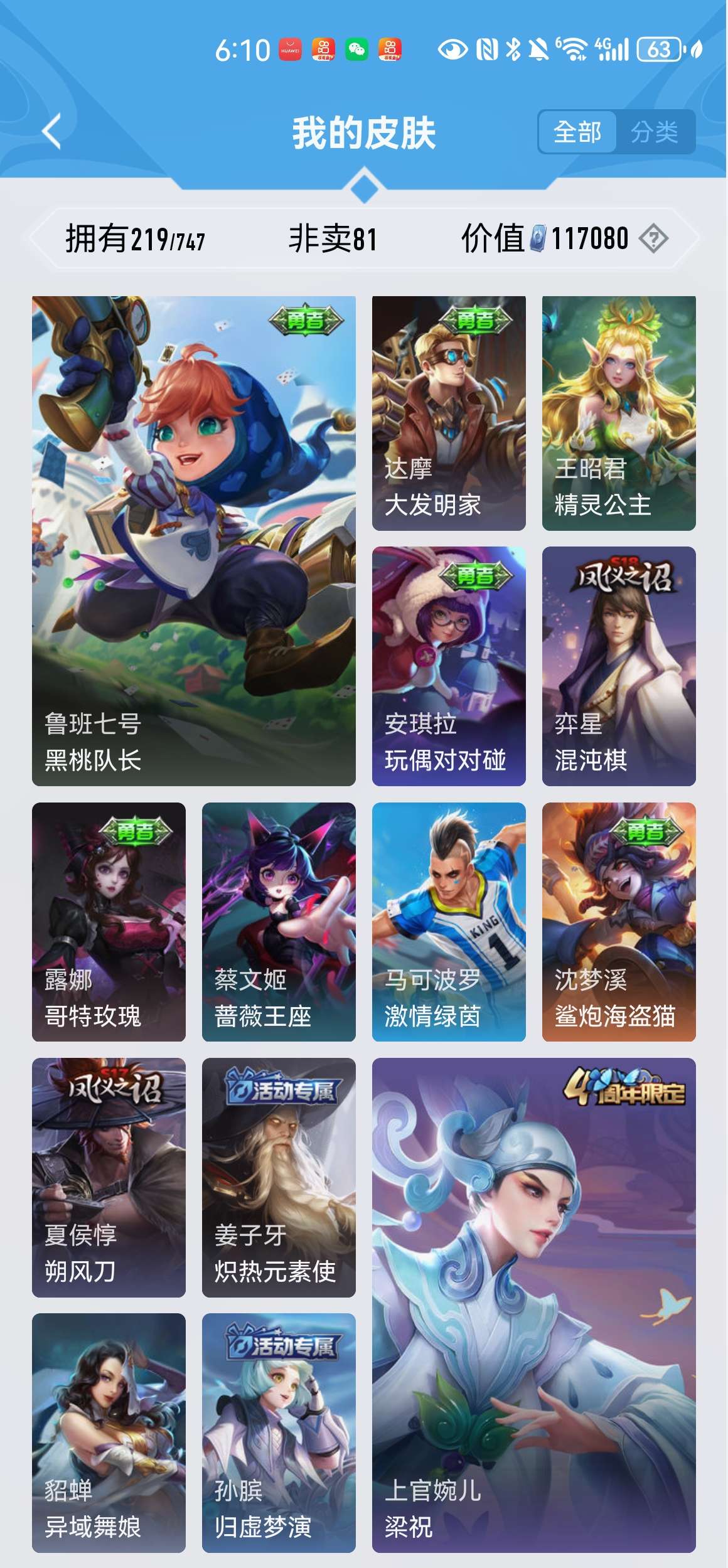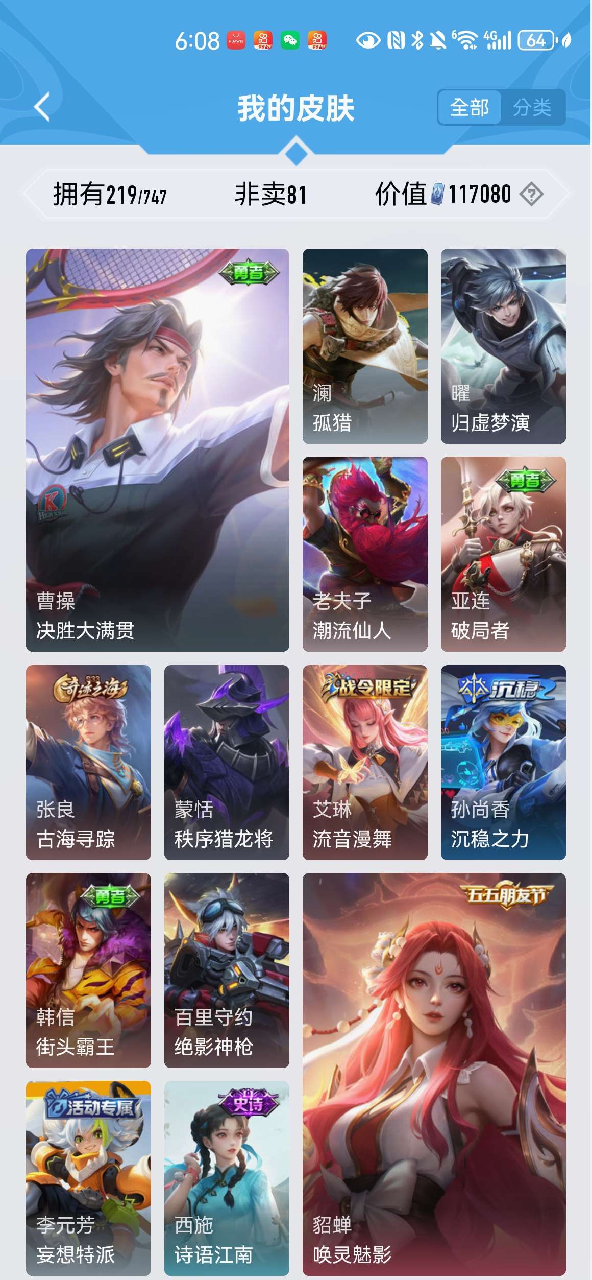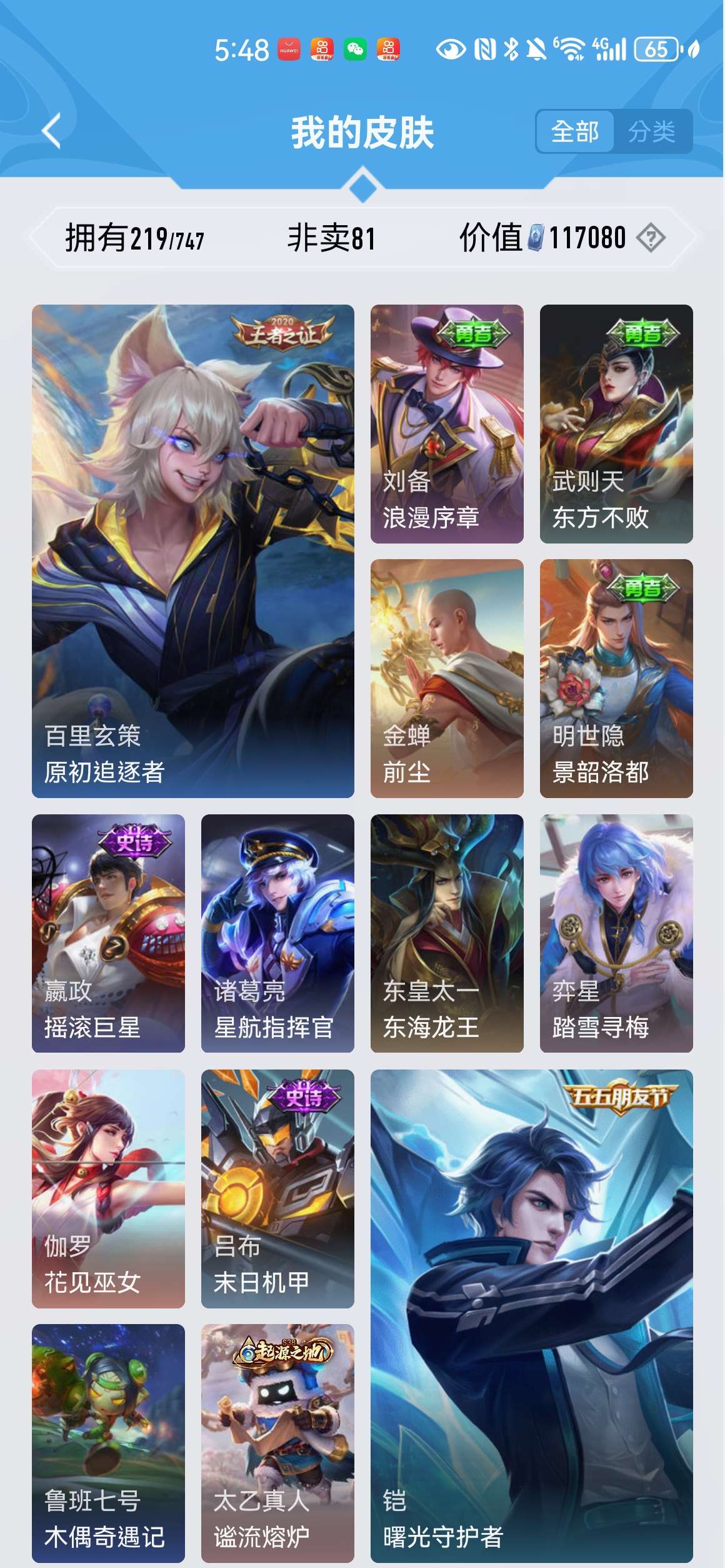 王者荣耀【安卓QQ】皮肤219,英雄127(没武则天),最强王者