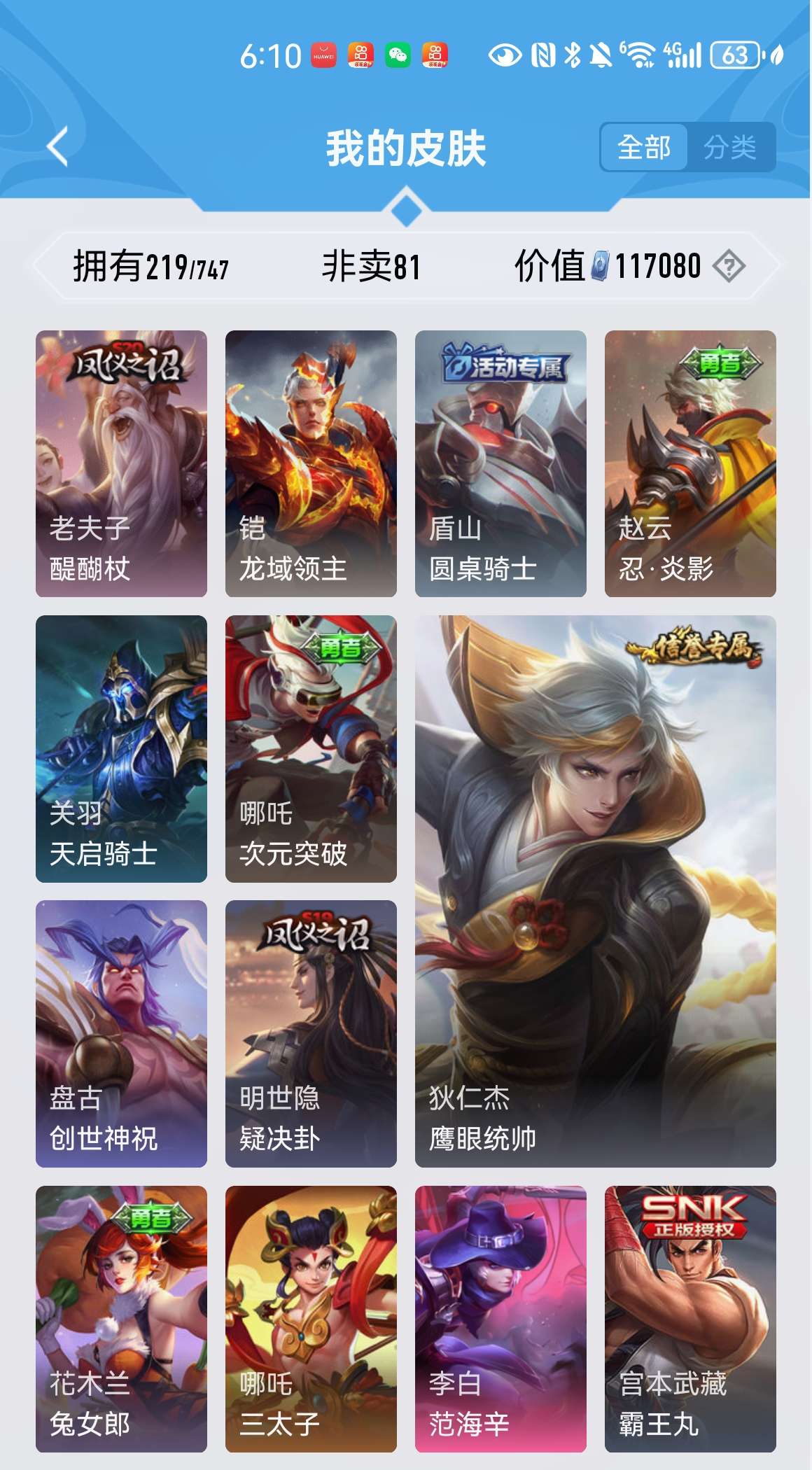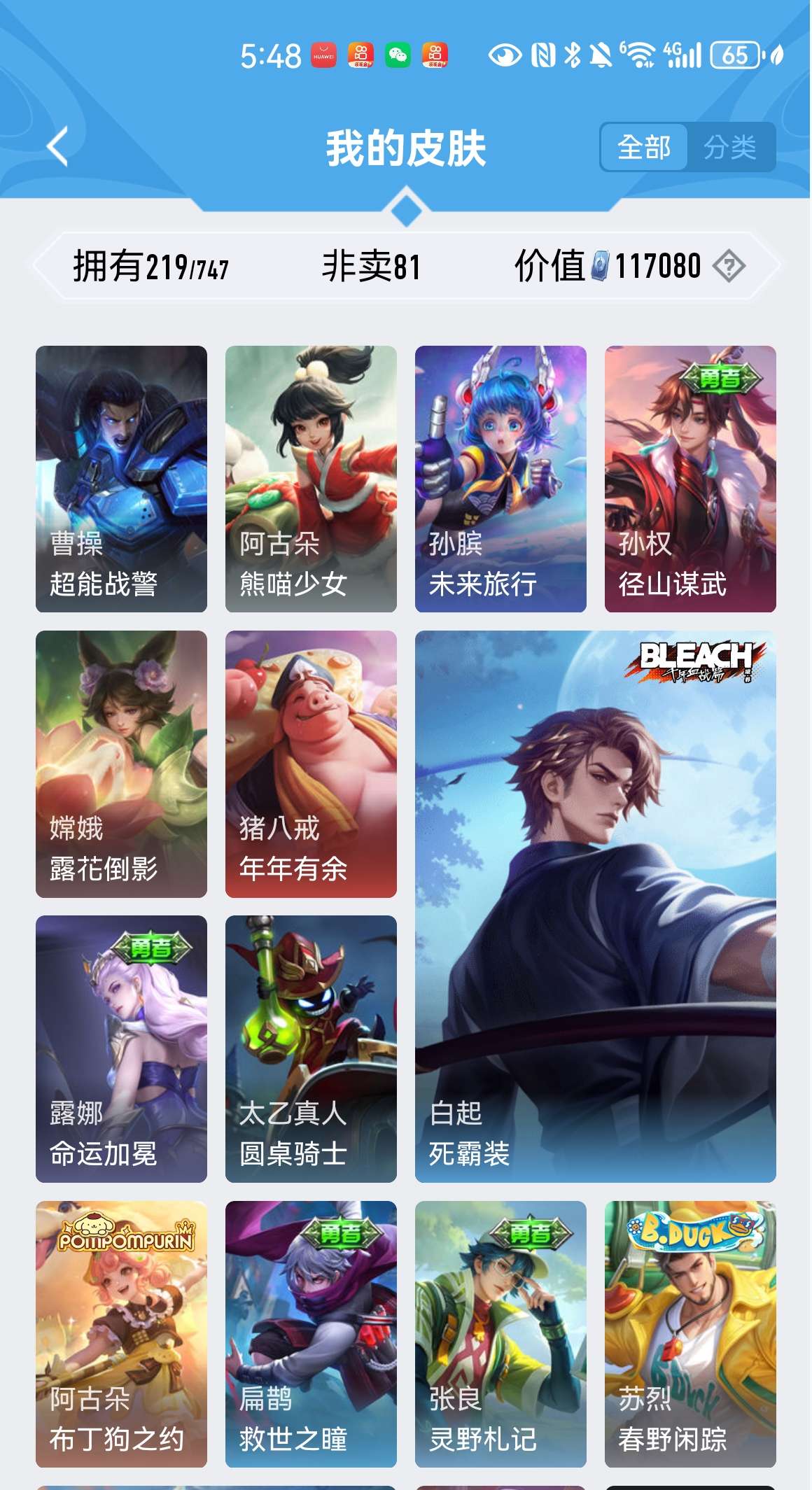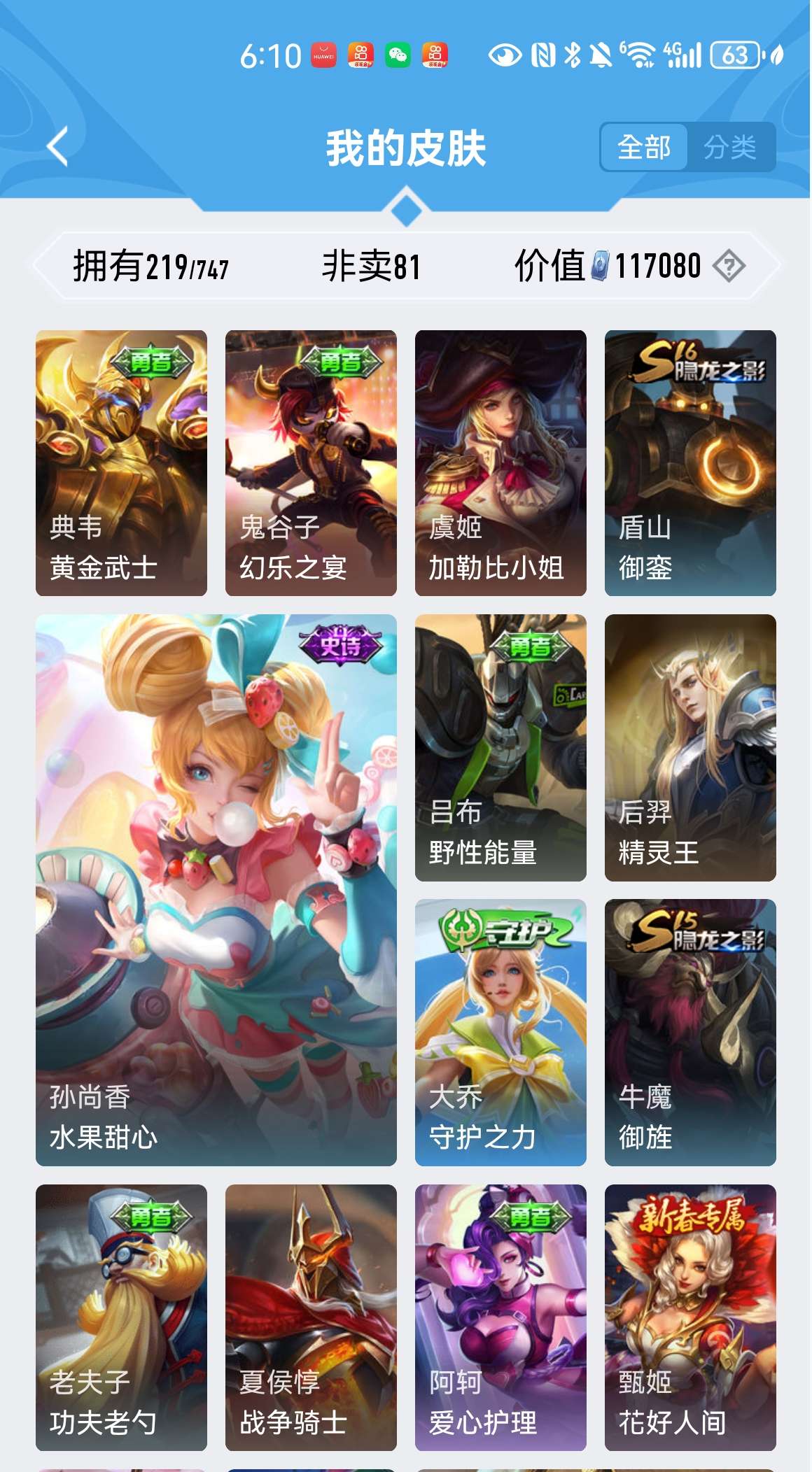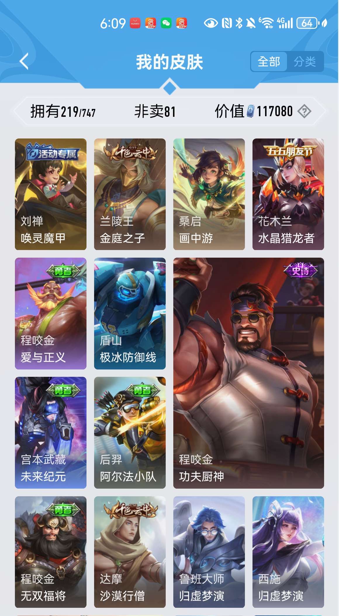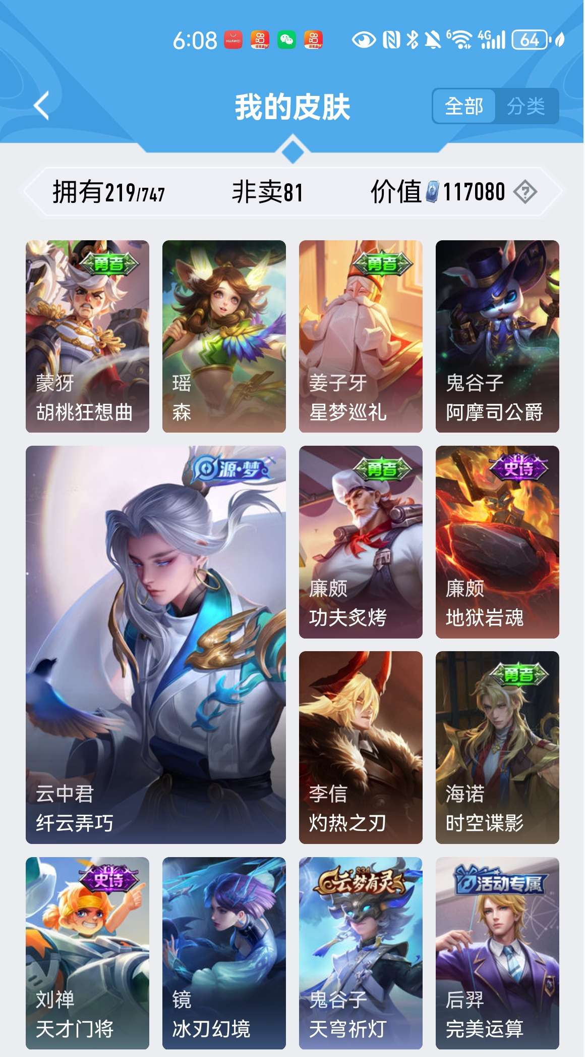 王者荣耀【安卓QQ】皮肤219,英雄127(没武则天),最强王者