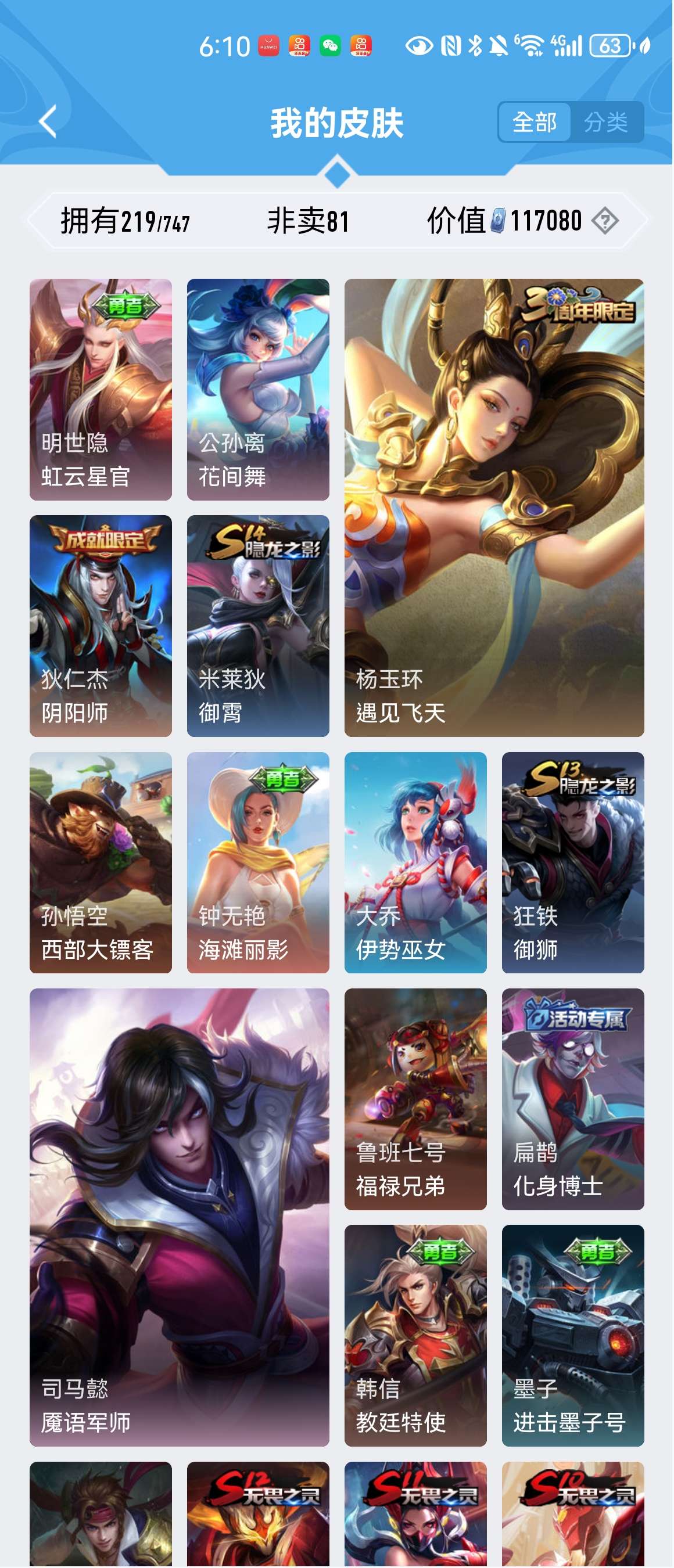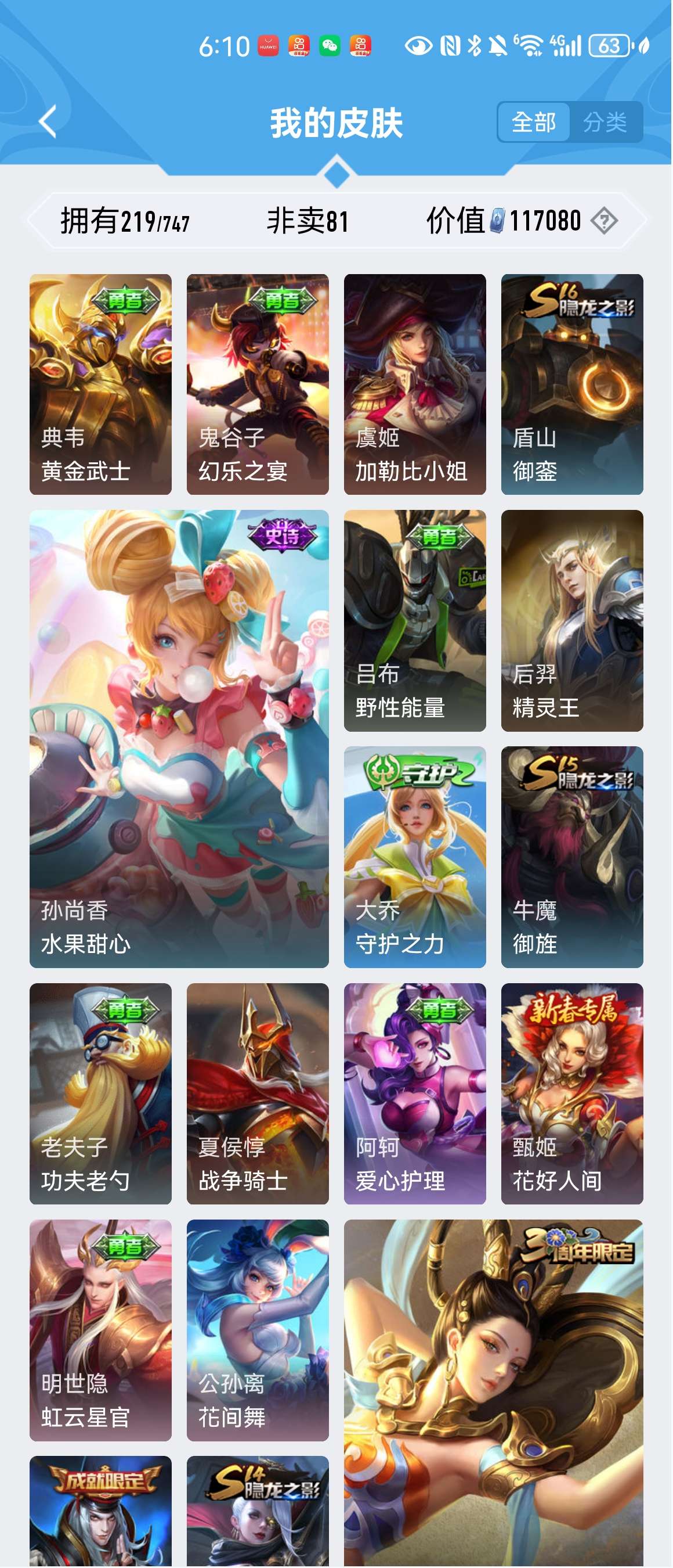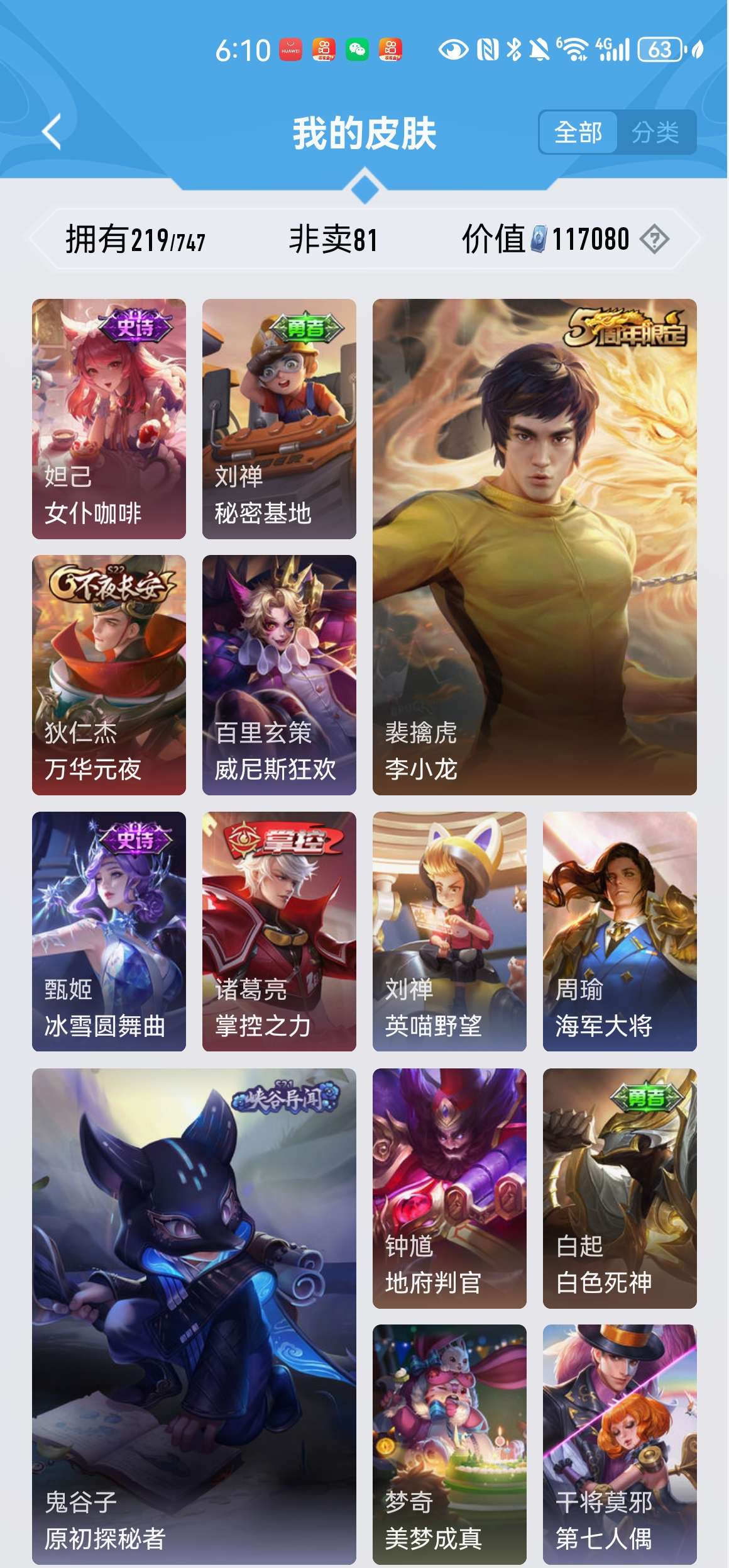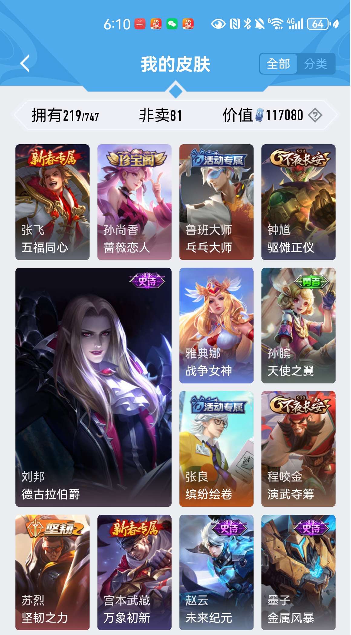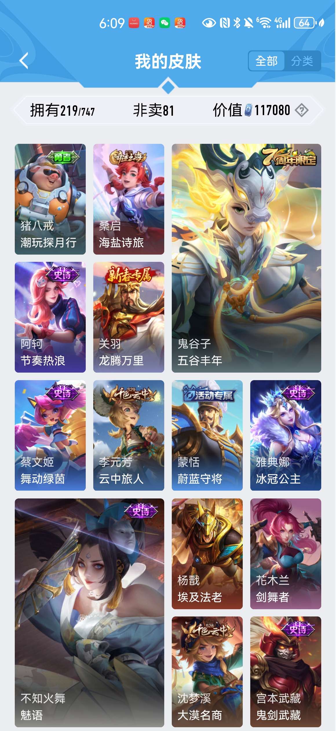 王者荣耀【安卓QQ】皮肤219,英雄127(没武则天),最强王者