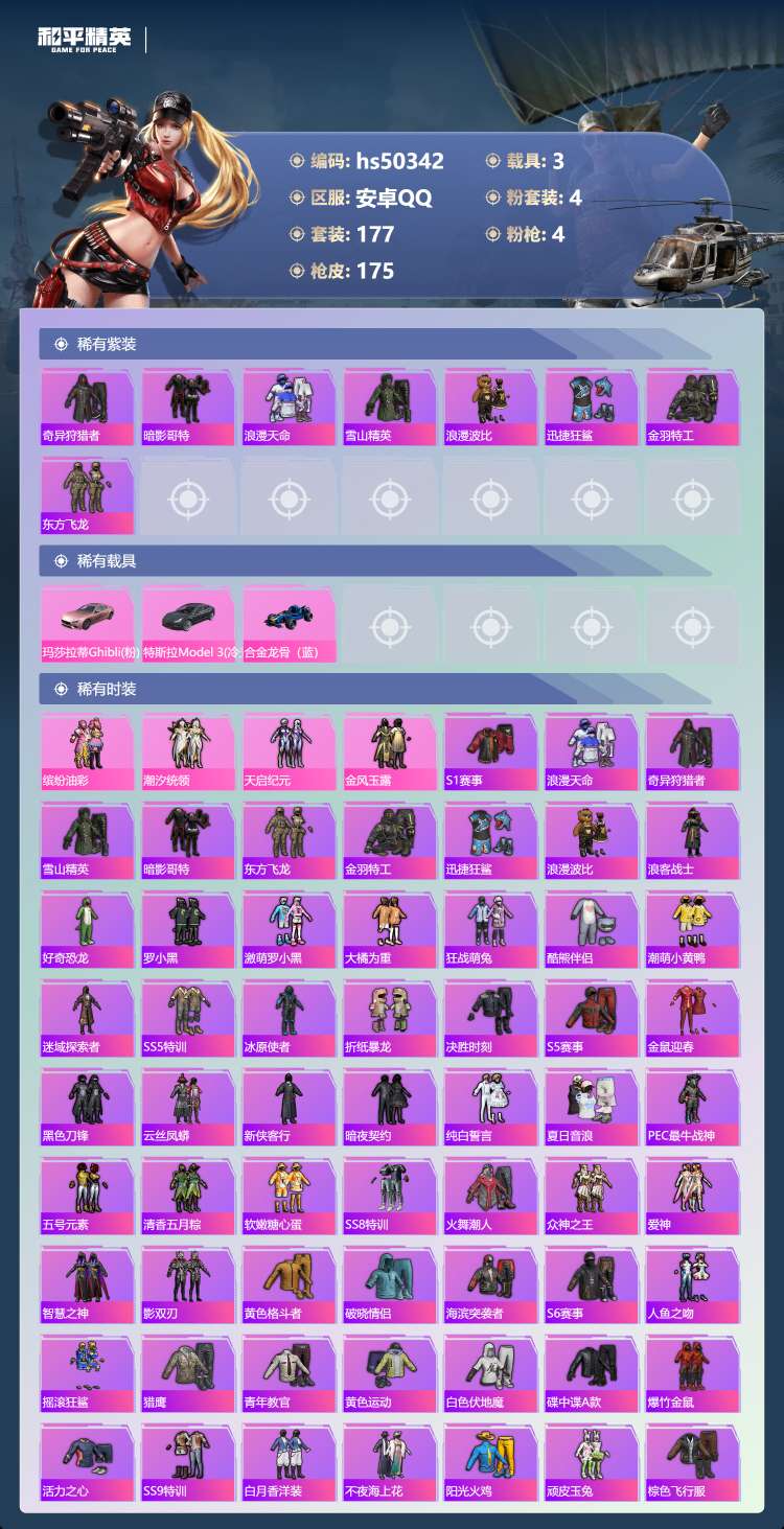 hs50342 安卓手Q-16王牌印记-有战神框-4粉装-4特效枪-3载具-65723热力值-177