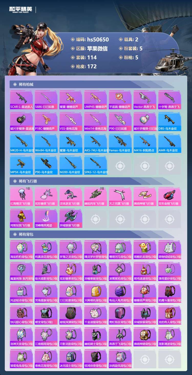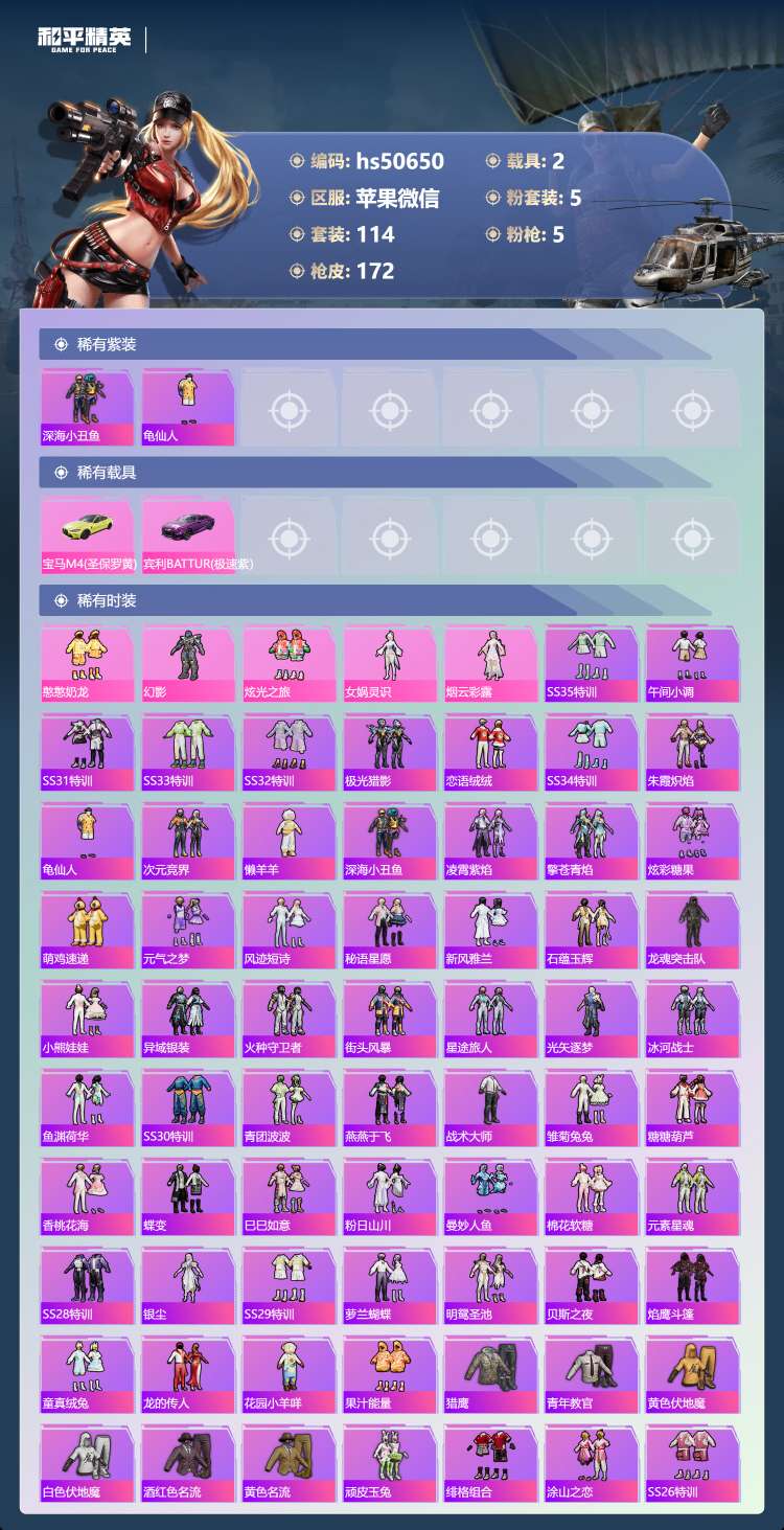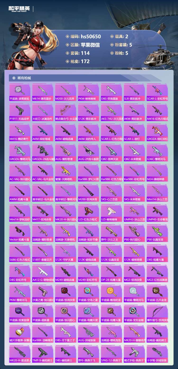 hs50650 苹果微-8王牌印记-5粉装-5特效枪-2载具-59778热力值-114套装-172