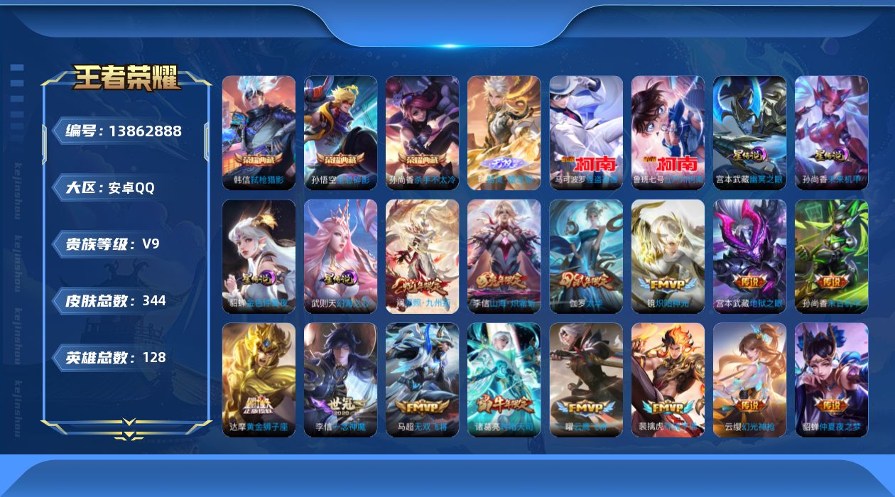 营地账号:536378416/【13862888】[13862888]实名: 不可修改 性别: 男号 贵族等级: V9 英雄数: 128 皮肤数: 344 荣耀水晶: 武则天,杀手不太冷,全息碎影,弑枪猎影 无双皮: 器灵·螭龙剑 珍品传说: 江户川柯南,怪盗基德 星传说: 幻海之心,未来机甲,幽冥之眼,金色仲夏夜 传说皮: 黄金狮子座,冠军飞将,云鹰飞将,绛天战甲,猫影幻舞,久胜战神,炽阳神光