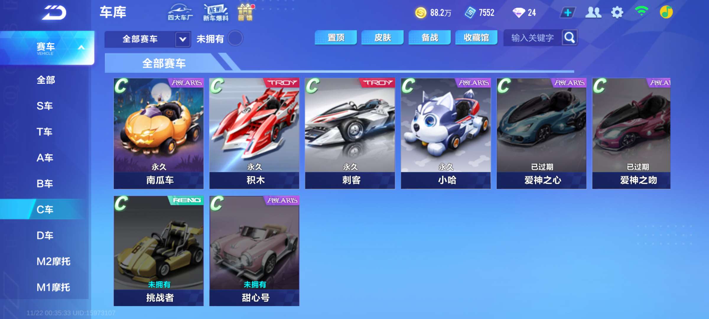 一口价,有永久T车,联赛车有破晓者荣耀,悬浮车也有,还有阿斯达马丁,幽水之渊新皮肤,冰魄、时序皮肤,