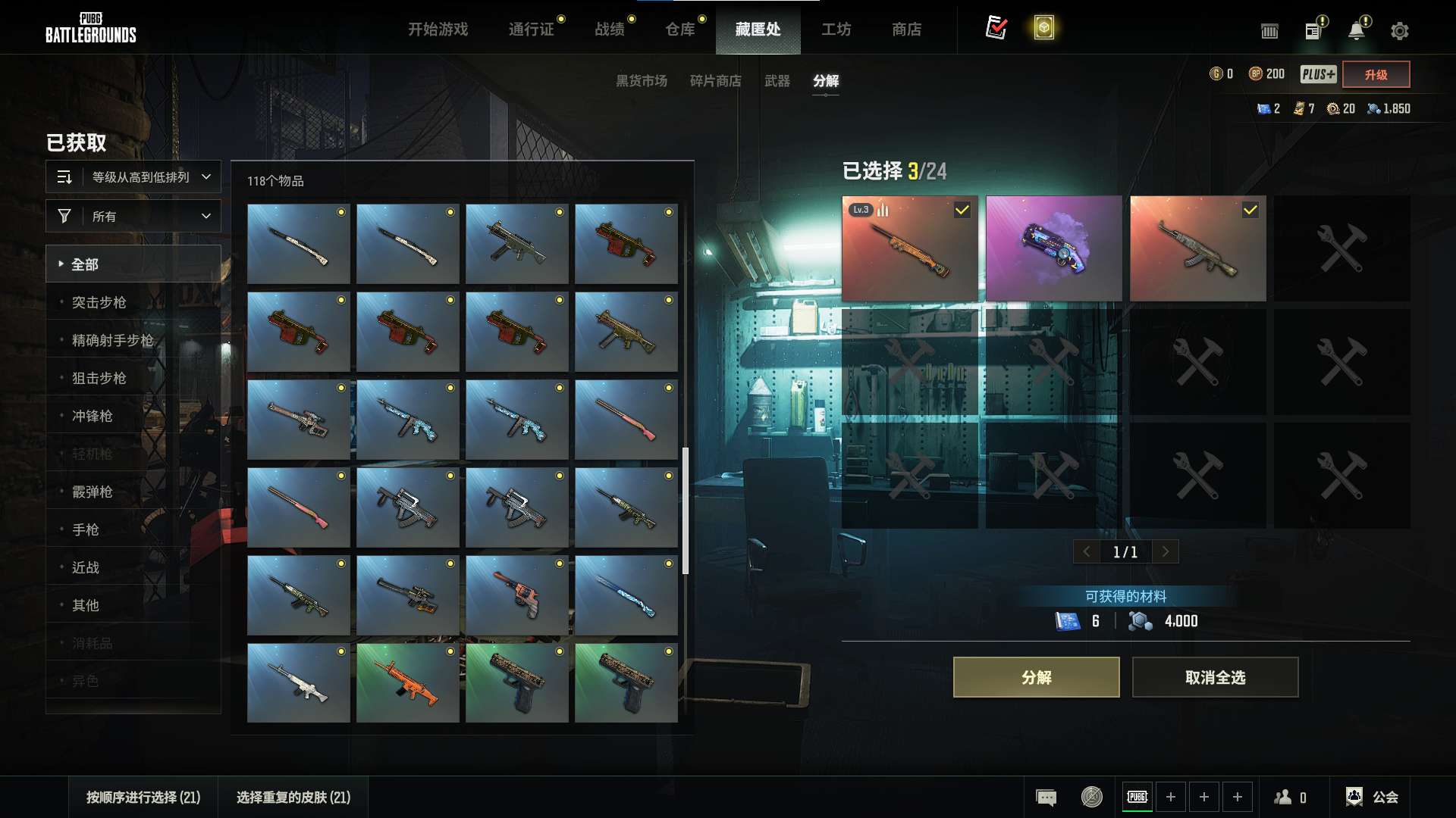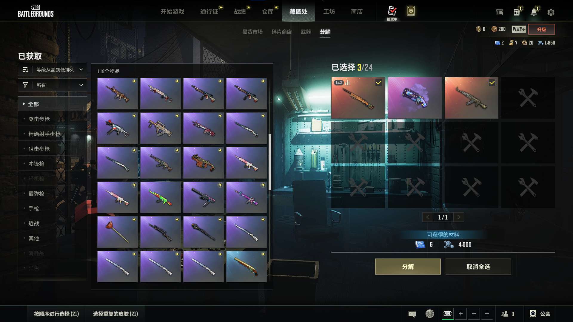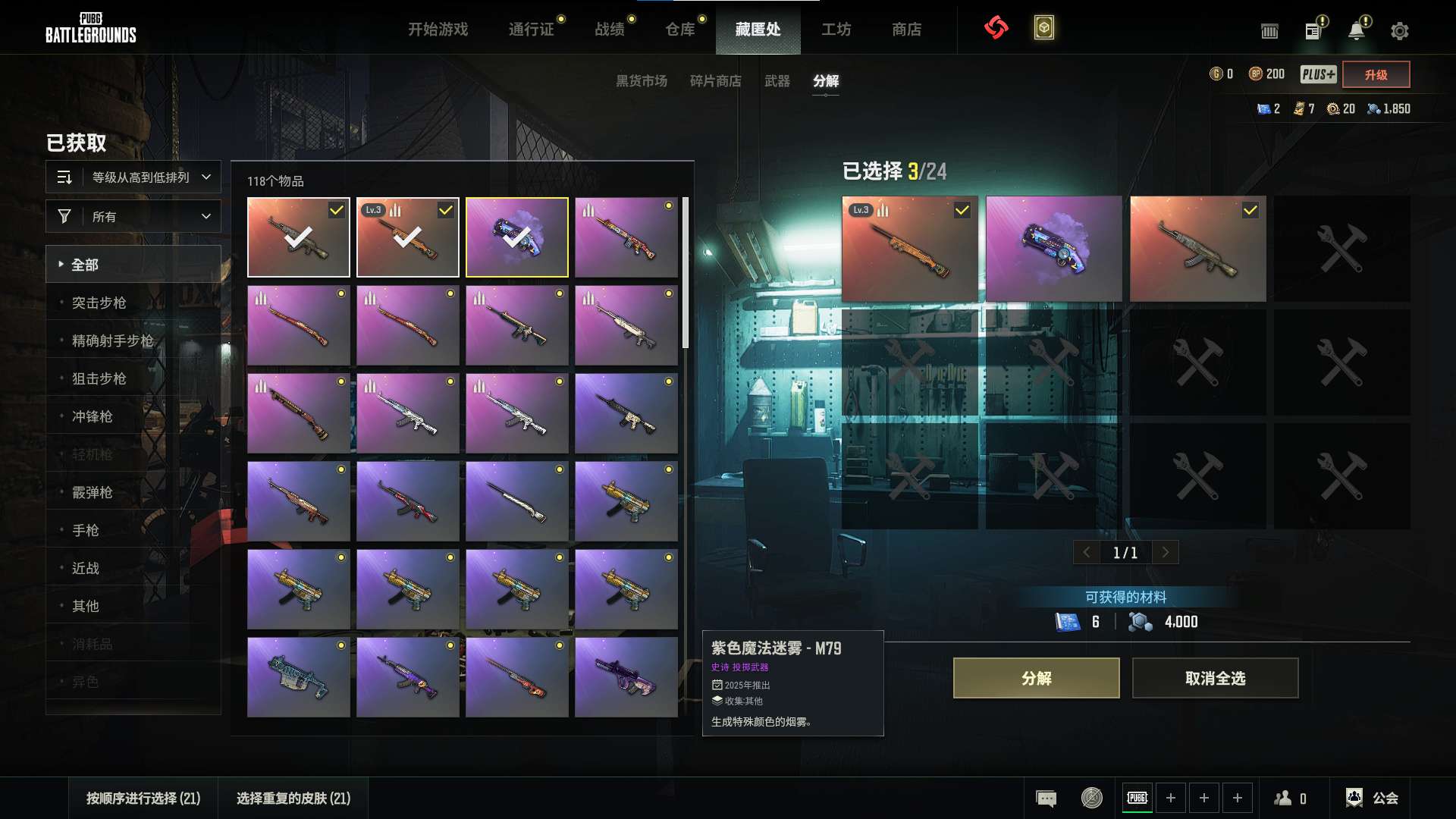 3级M24-最后的小夜曲,2图纸118枪皮肤2载具8记数枪,紫色大烟枪,AKM-暗影缠身,美人鱼套