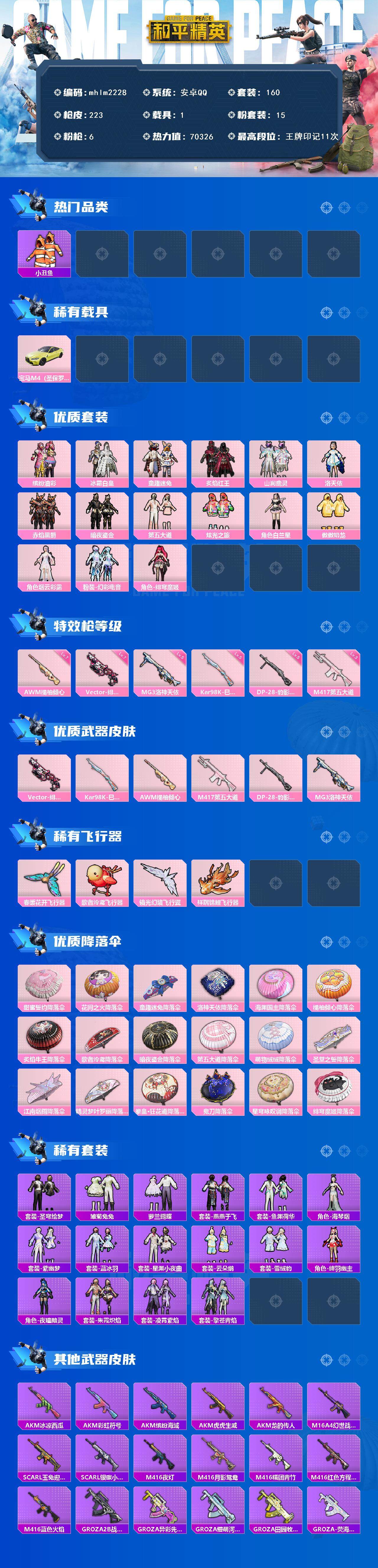 【mhlm2228】安卓 手Q-15粉装-6特效枪-1载具-4粉色飞行器-70326热力值-11王牌印记-160套装-223枪皮
