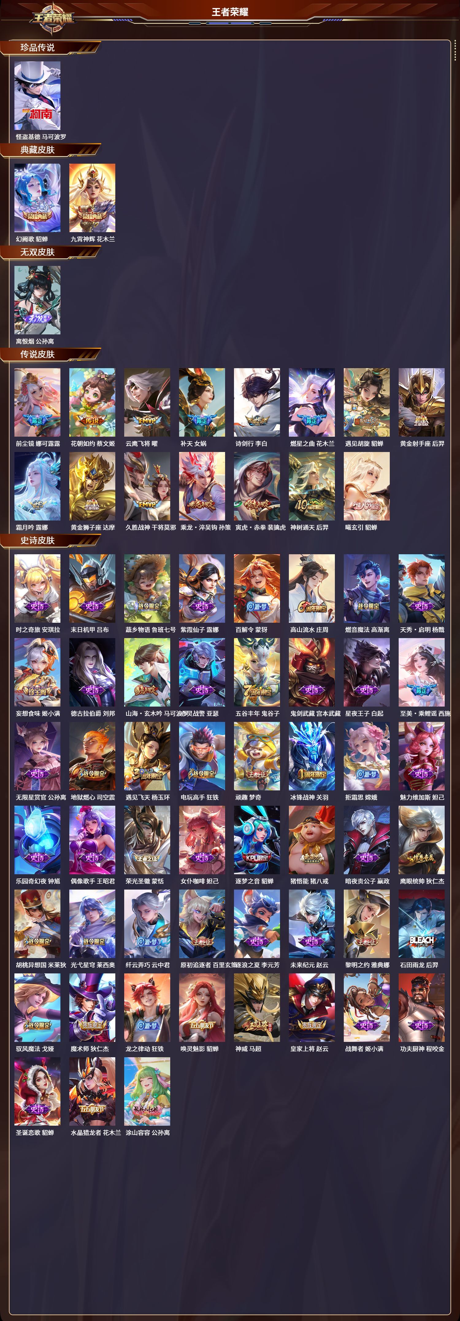 王者荣耀【安卓微信】安卓v/至尊星耀/247皮肤/127英雄/2典藏/0珍品无双/1无双/1珍品传说/15传说/73史