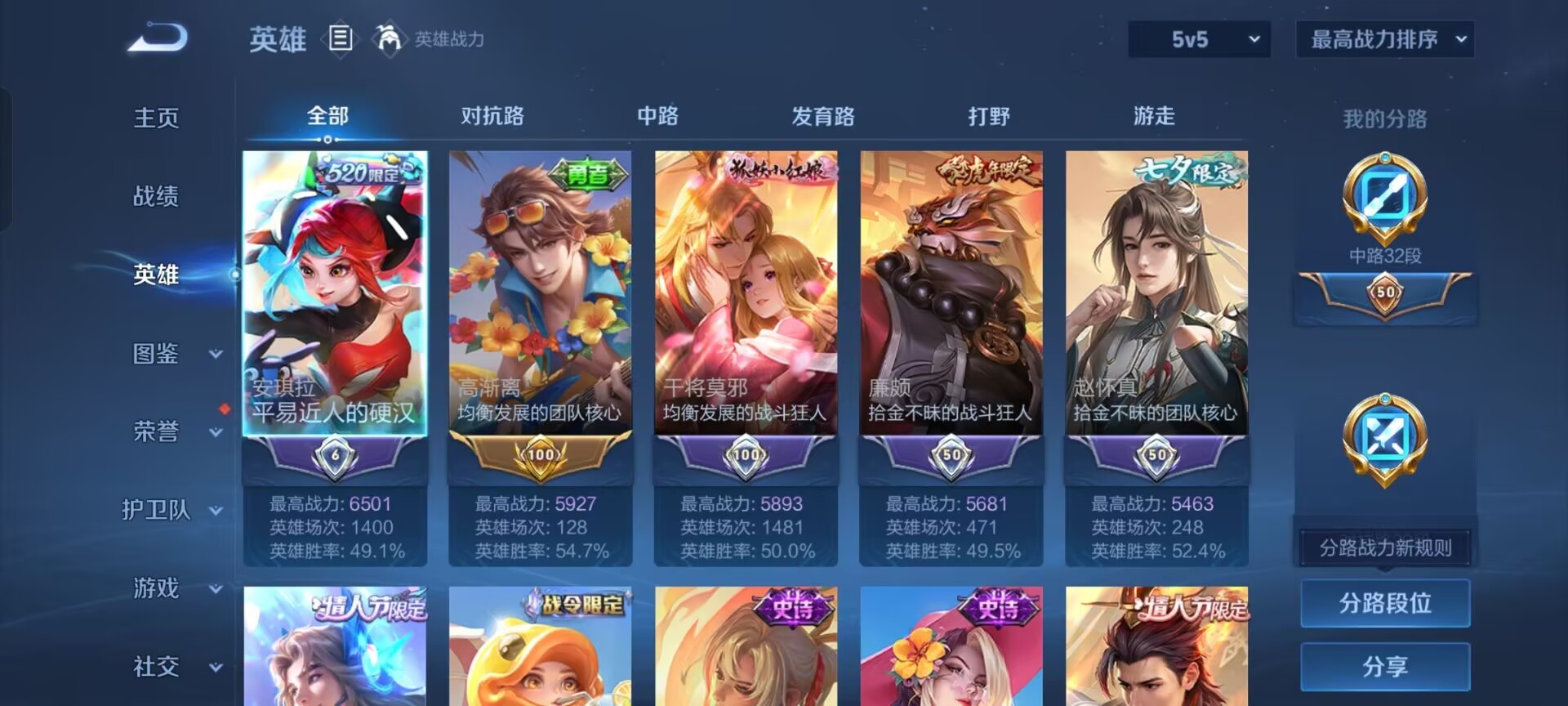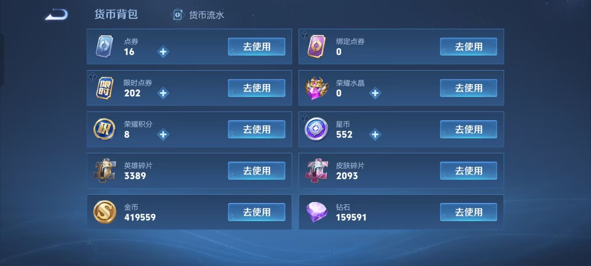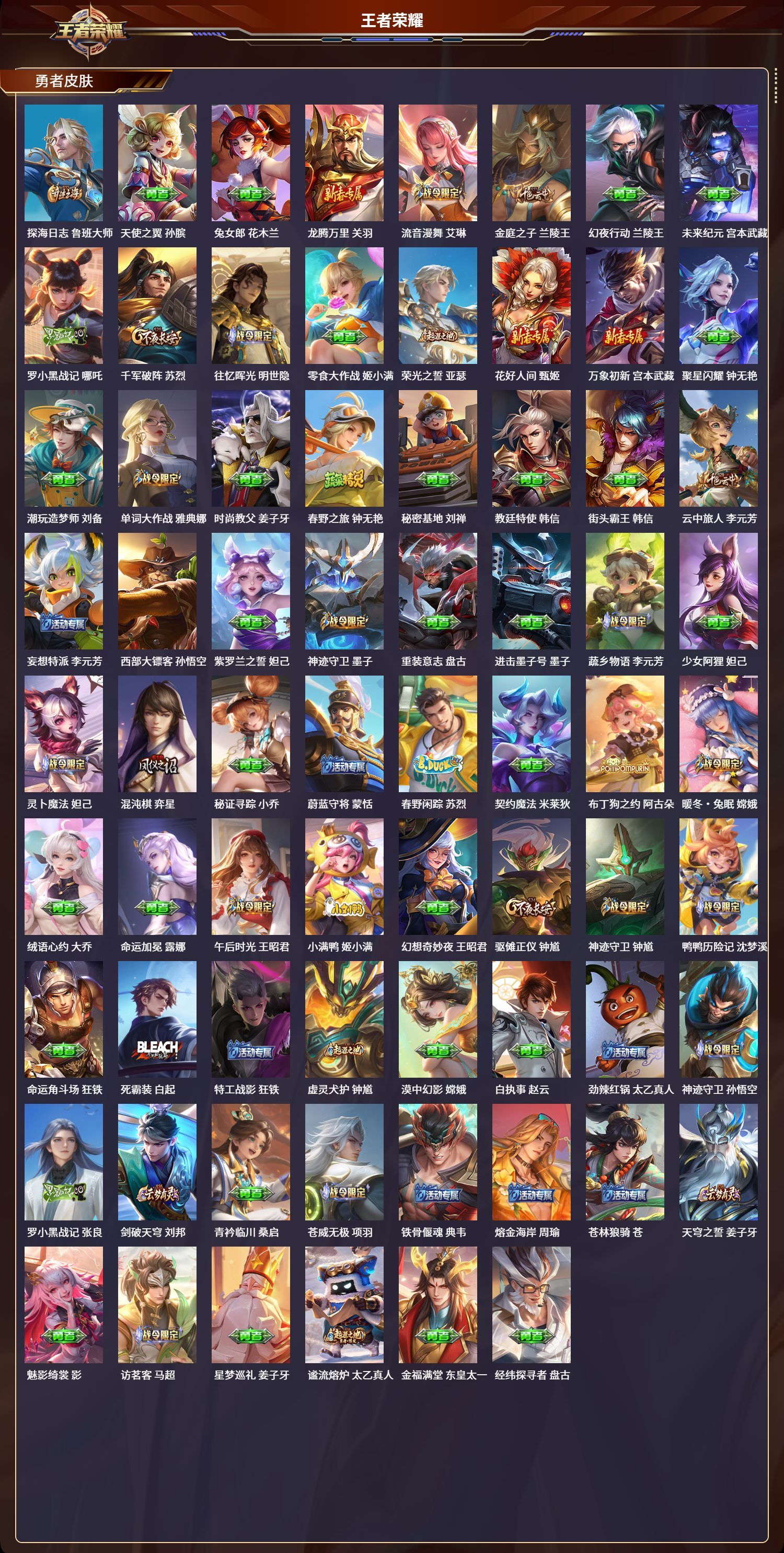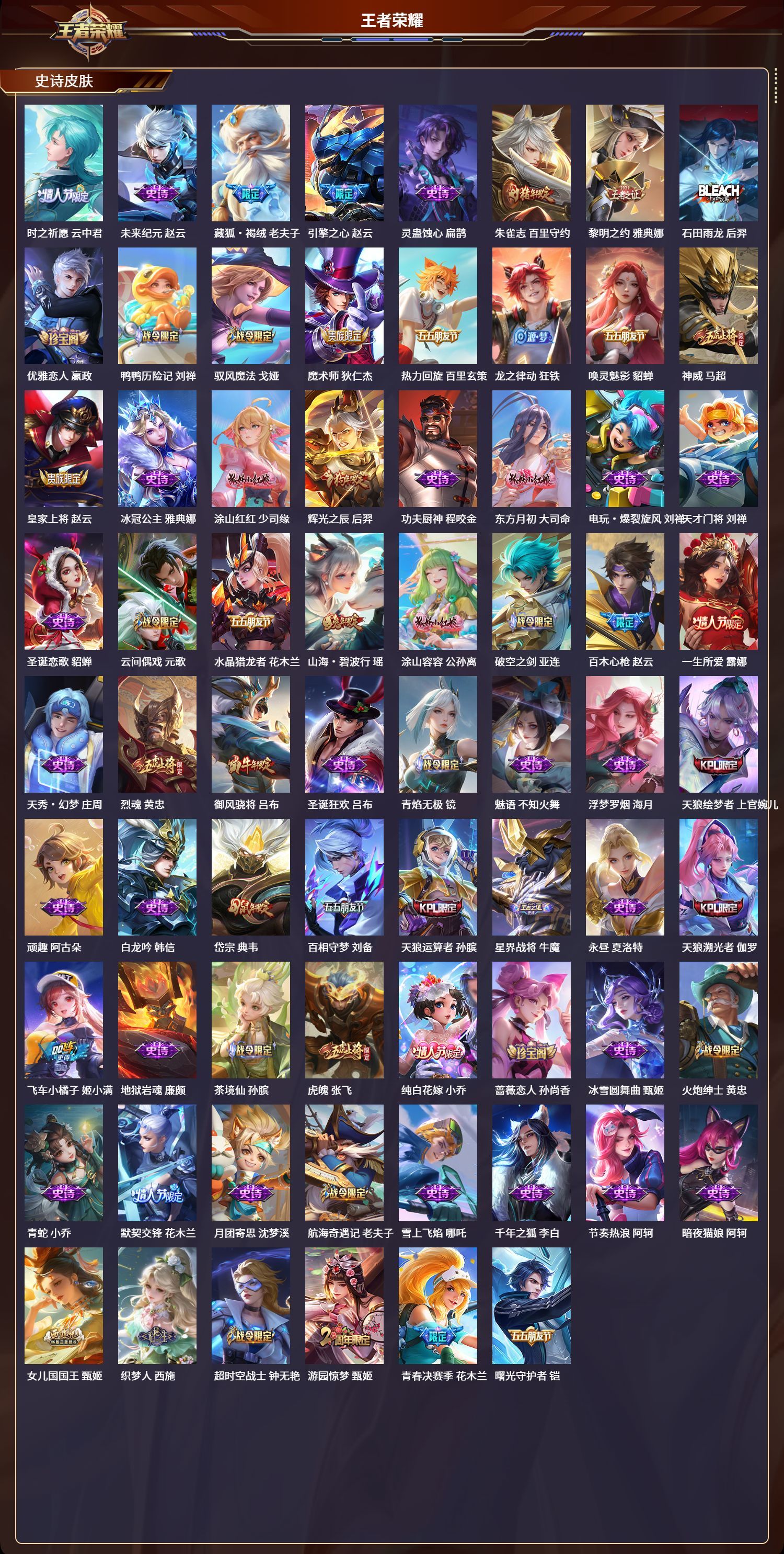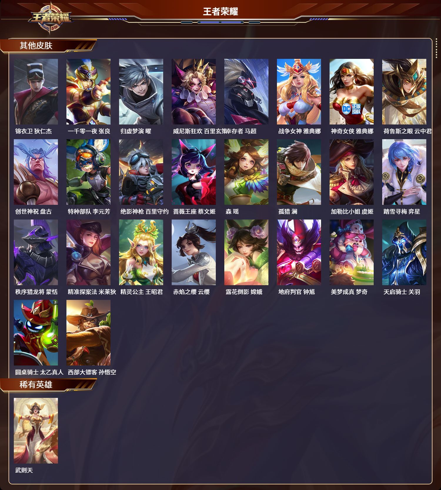 安卓微/至尊星耀/584皮肤/128英雄/8典藏/0珍品无双/1无双/0珍品传说/93传说/208