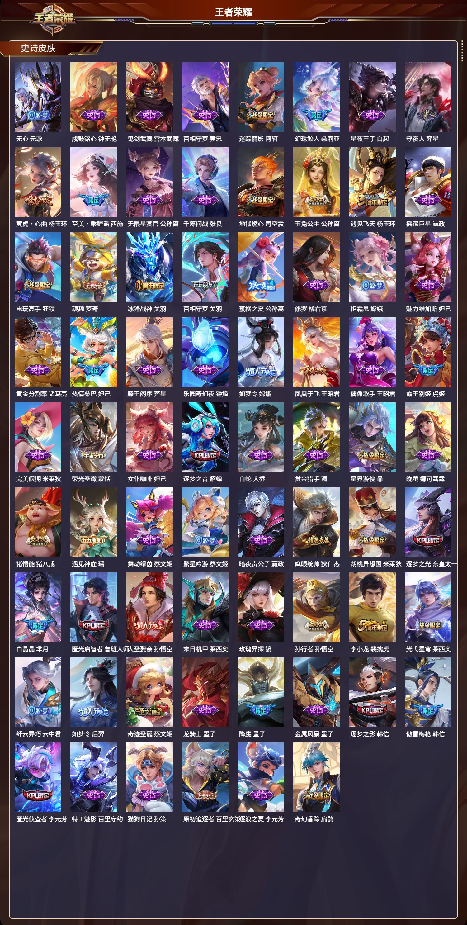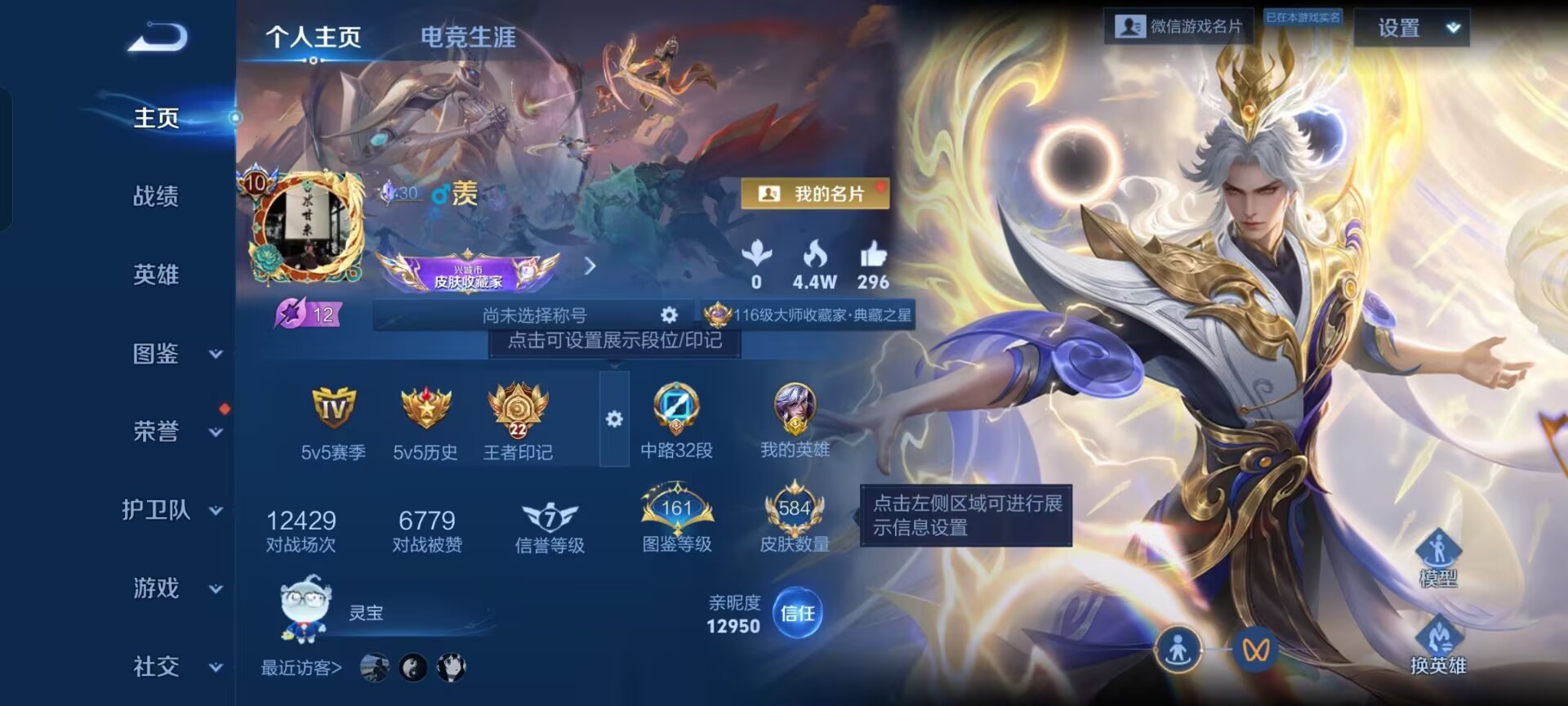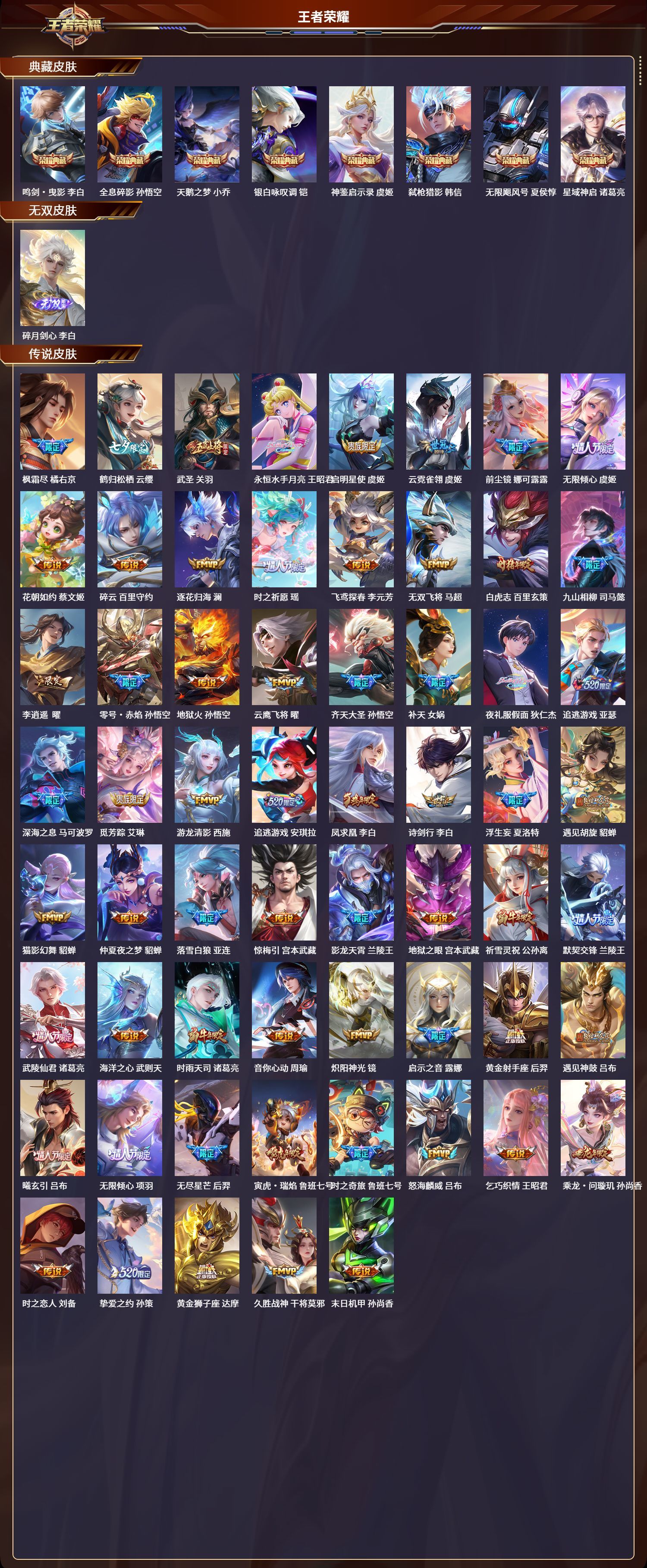 王者荣耀【安卓微信】安卓v/至尊星耀/584皮肤/128英雄/8典藏/0珍品无双/1无双/0珍品传说/93传说/208
