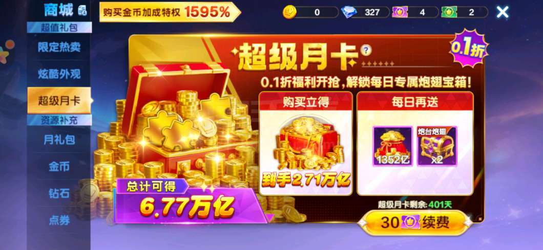 捕鱼大咖超级贵族二OPPO版本9天神四级秦始皇月卡400天一天可以领取1万5亿左右