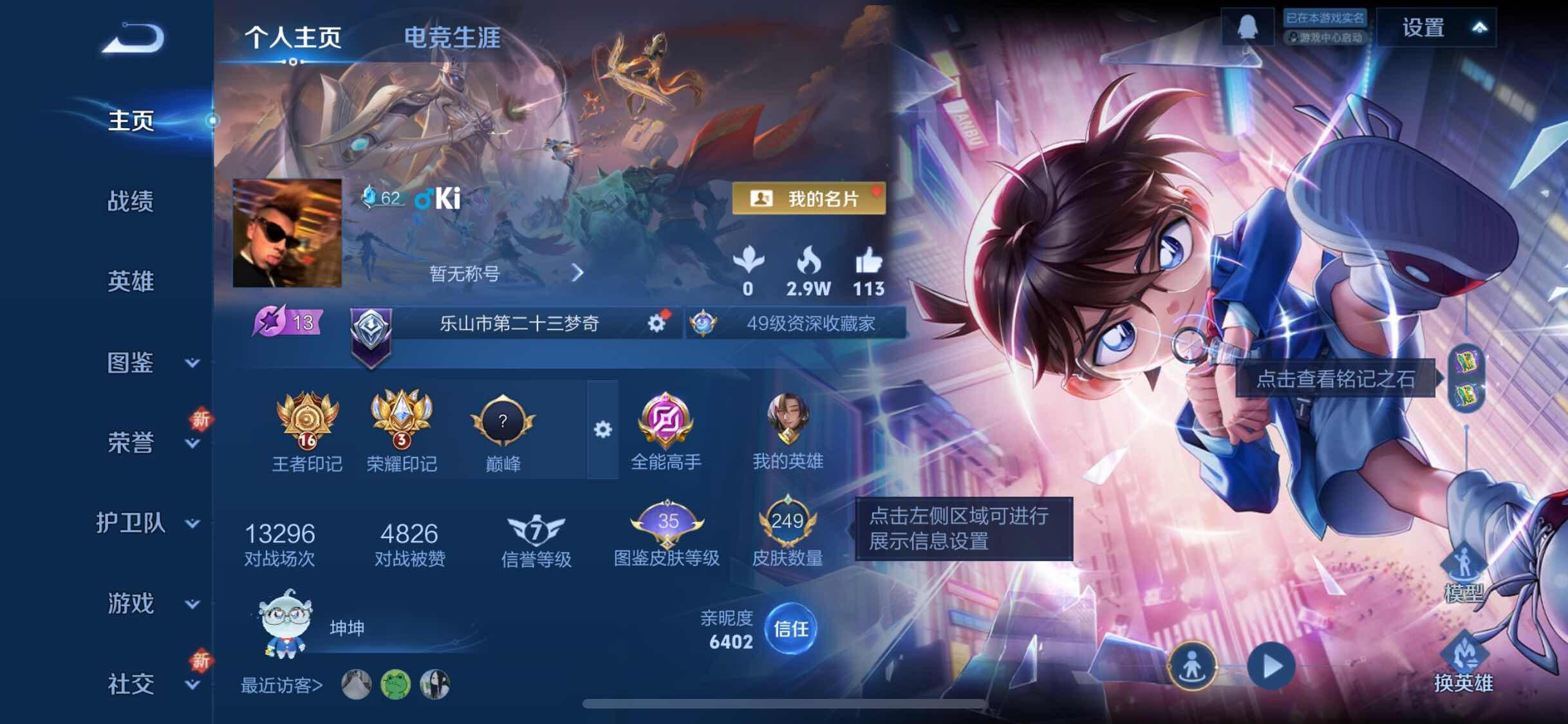 【249皮1典藏4珍品11传说 怪盗基德 江户川柯南 时之奇旅 黑崎一护 画中仙】苹果Q-V7-最强王者段位-125英雄-249皮肤-1典藏-0珍品无双-0无双-4珍品传说-11传说-66史诗
