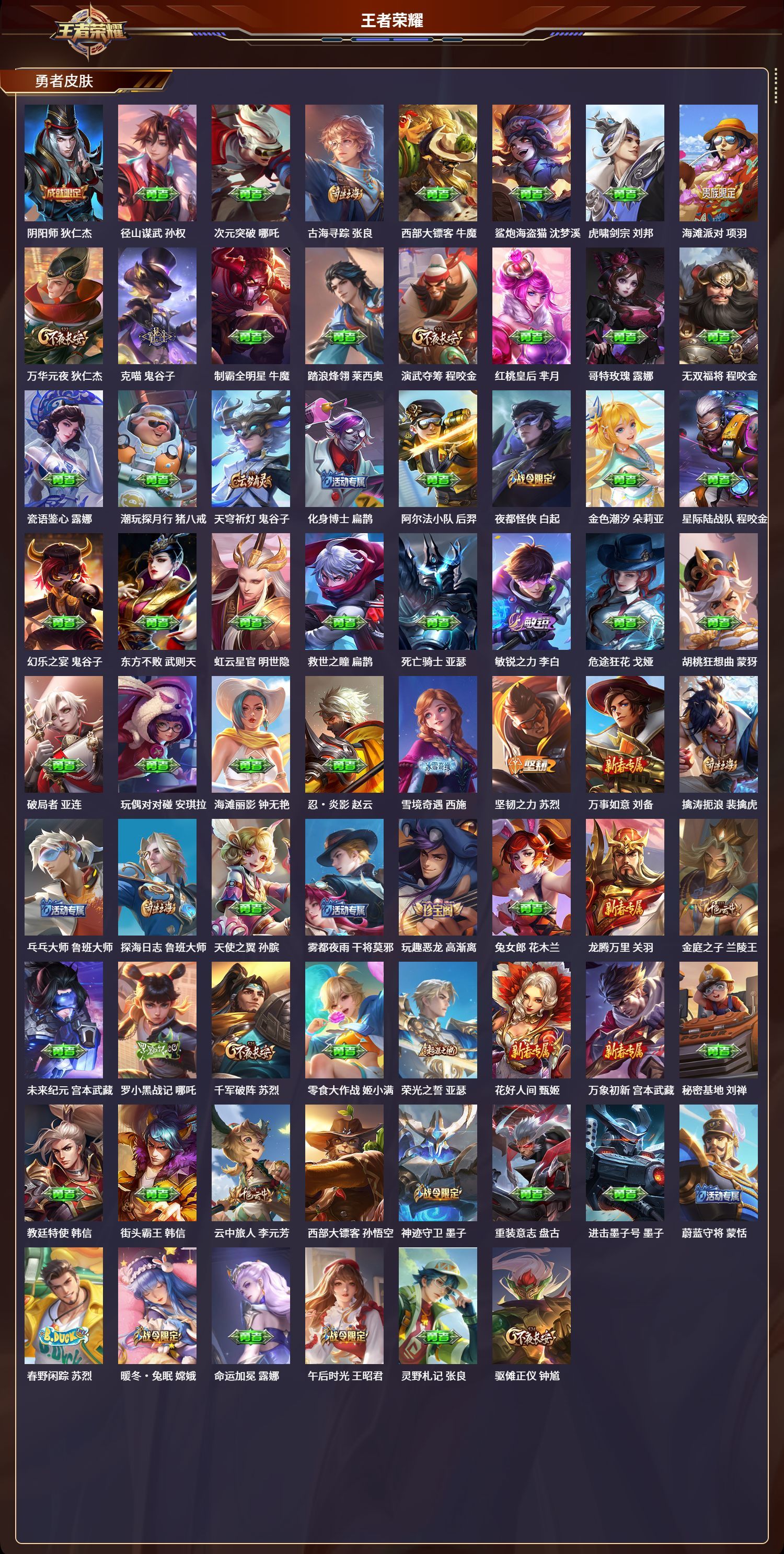 苹果v/绝世王者/281皮肤/128英雄/2典藏/0珍品无双/1无双/2珍品传说/26传说/89史