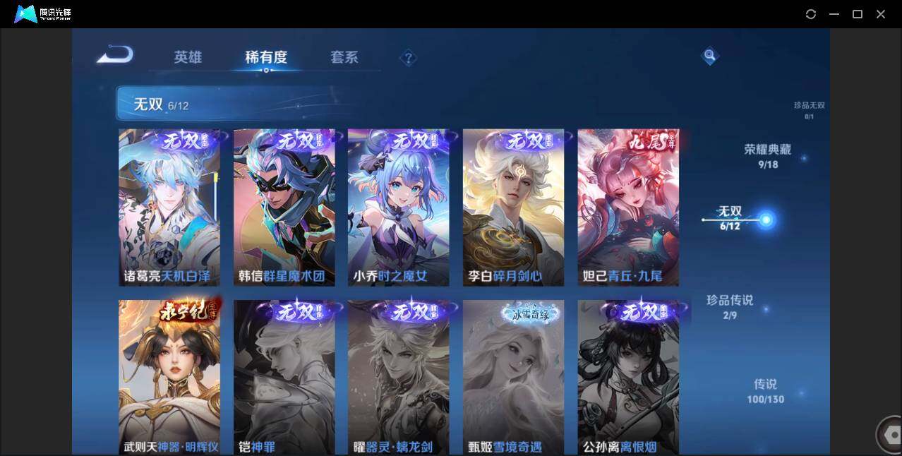 无二次-贵10-127英雄-521皮肤-11典藏(1水晶/武则天)-6无双-2珍品传说-100传说-3天幕-5星元-41按键-460戳戳