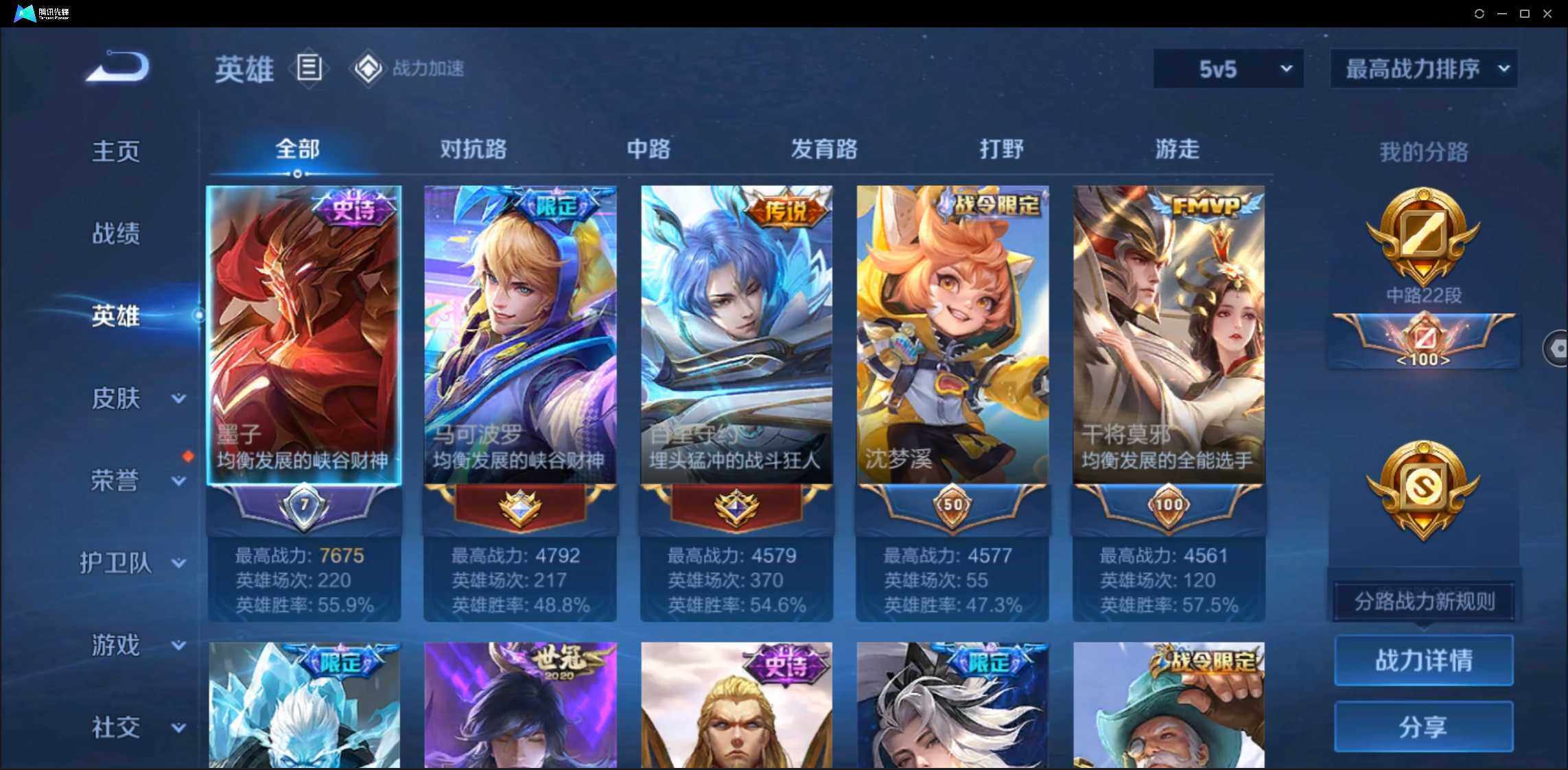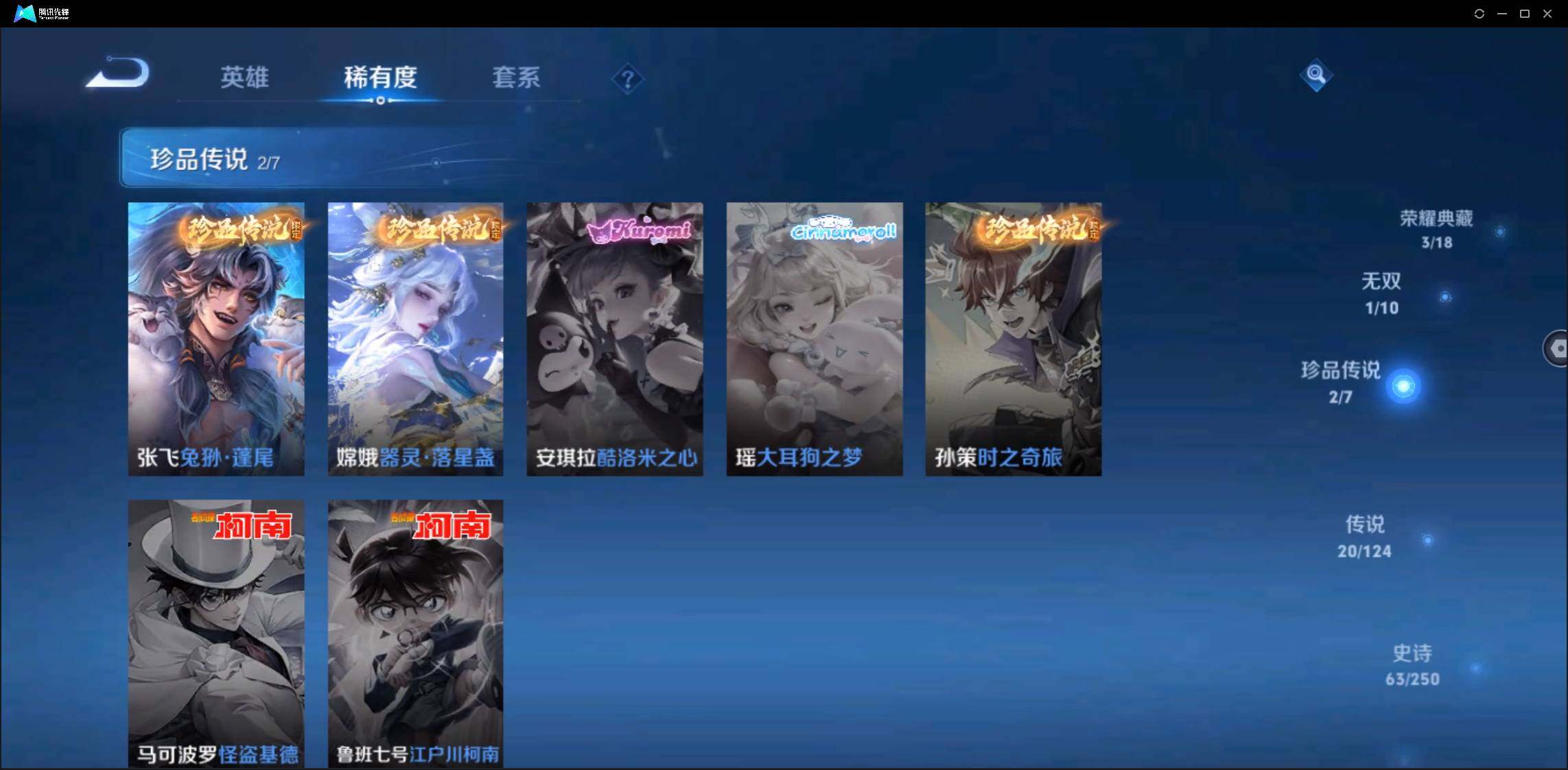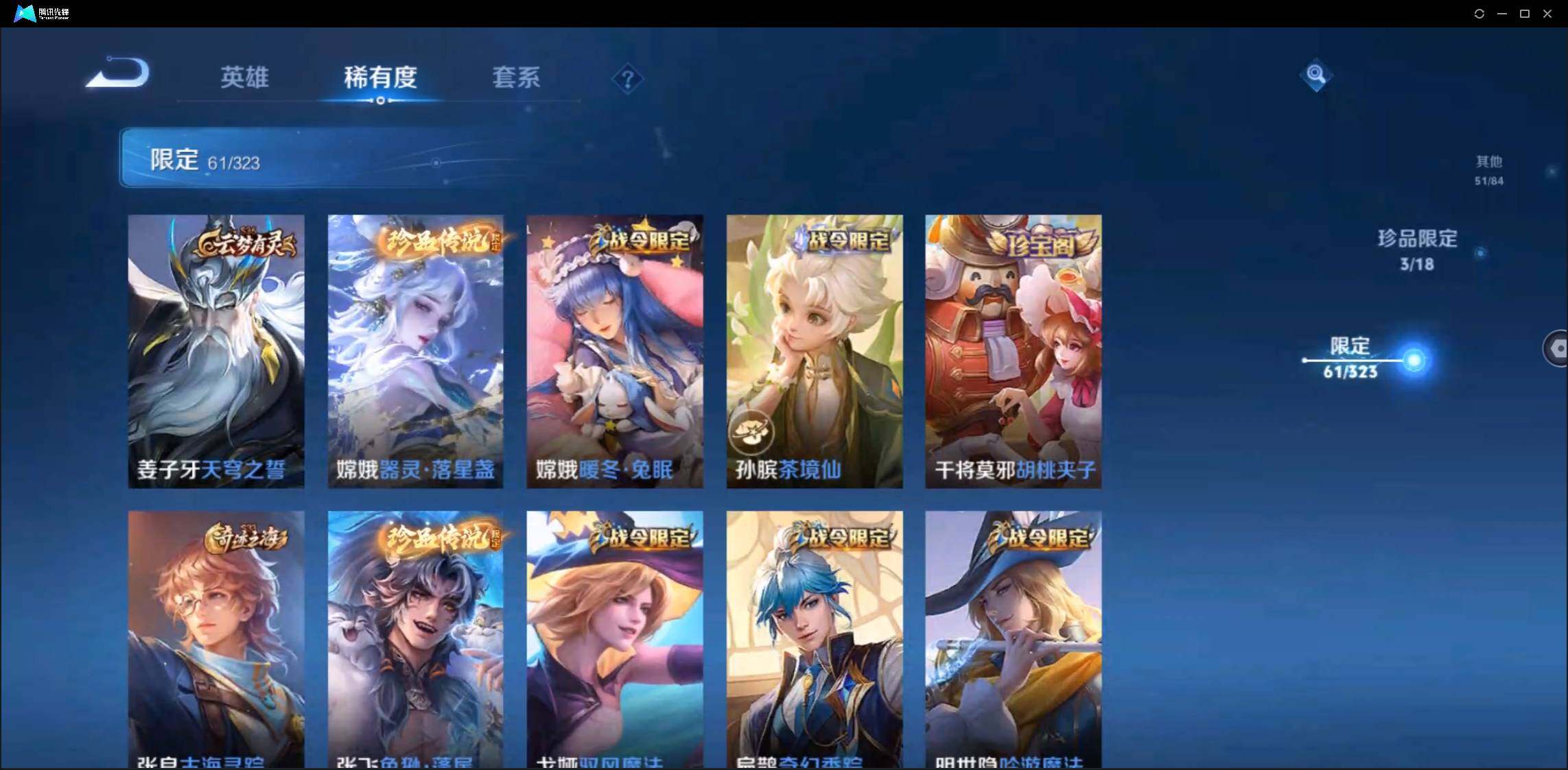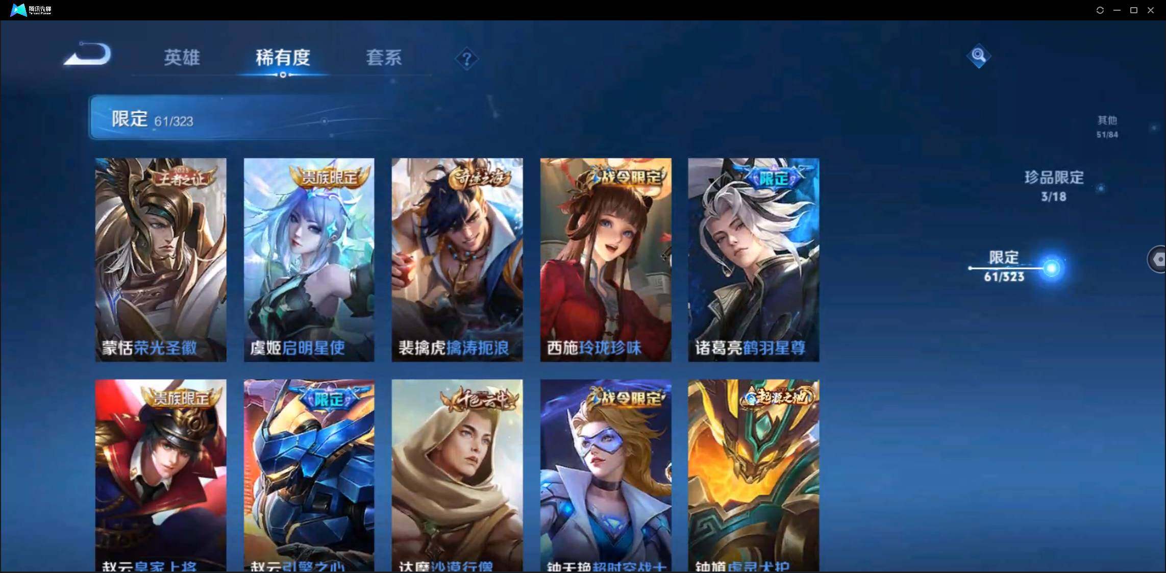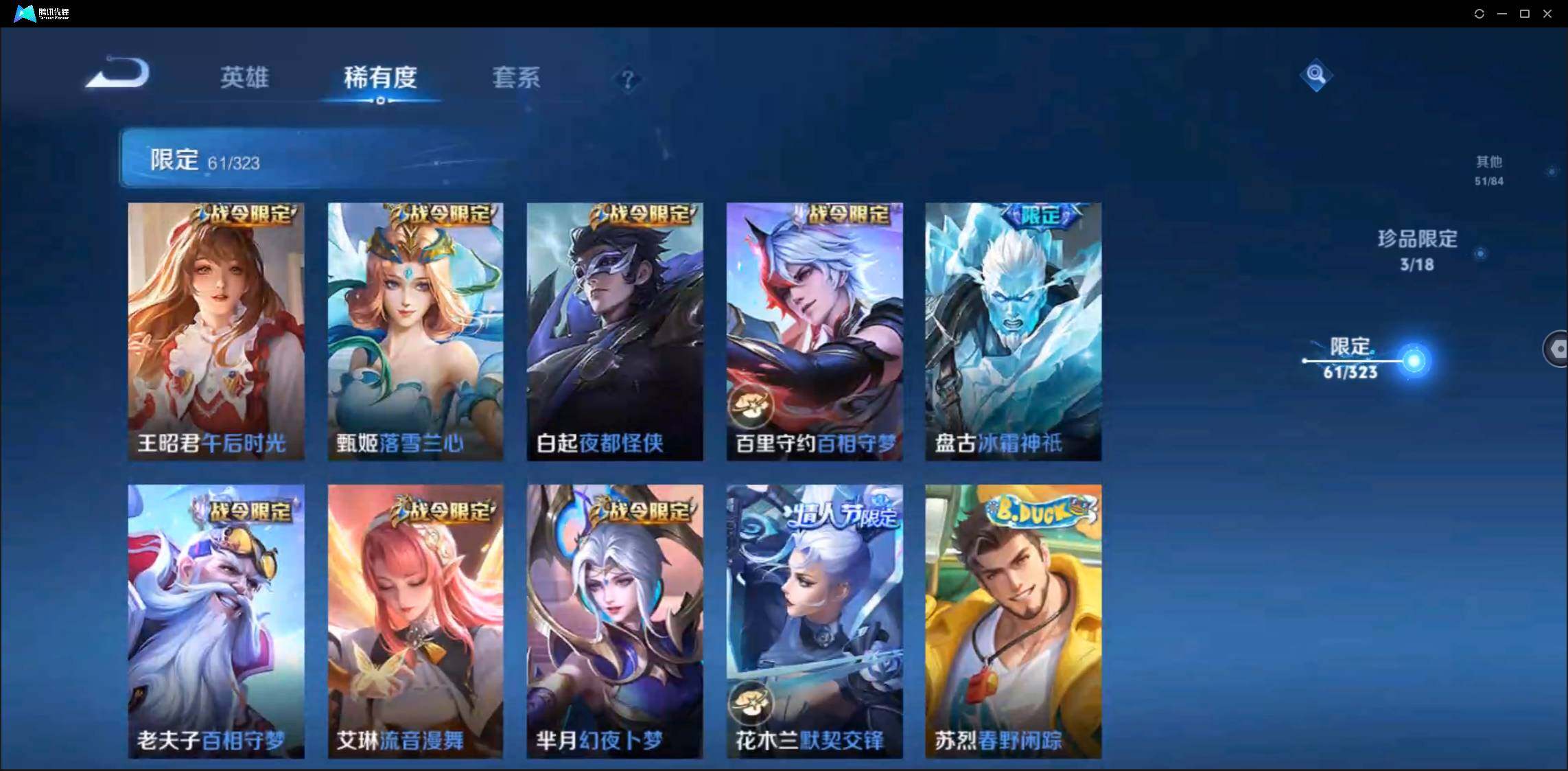 有二次-贵8-123英雄-234皮肤-3典藏-1无双-2珍品-1星元-20传说-61限定-3按键