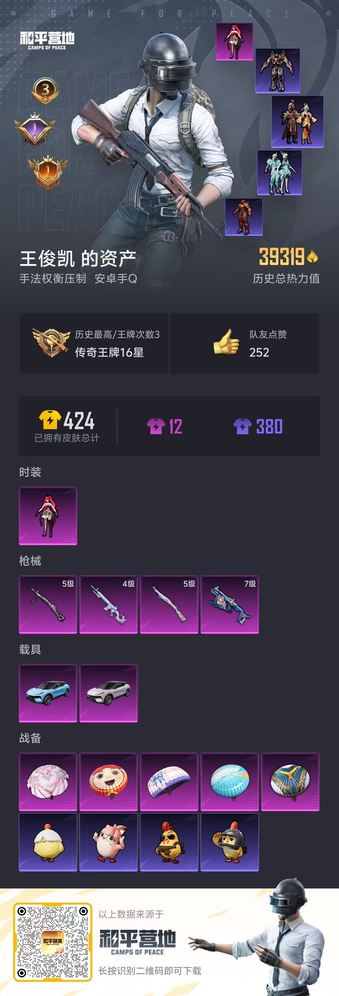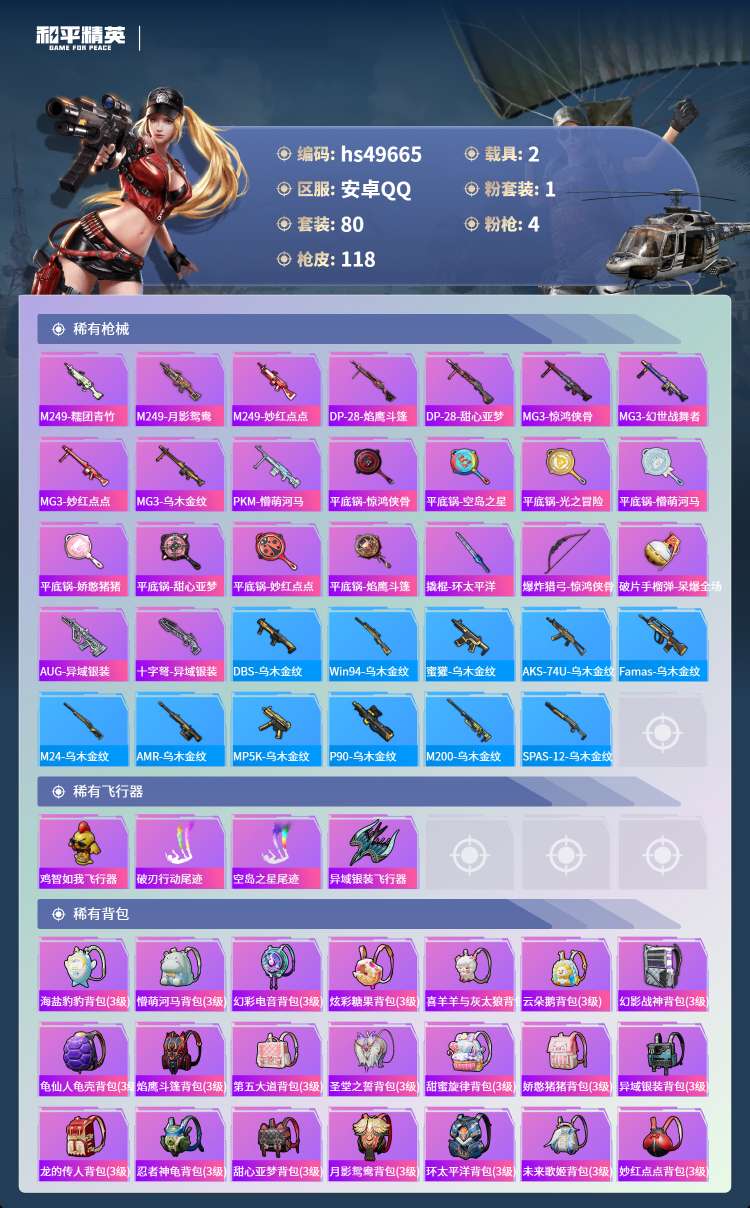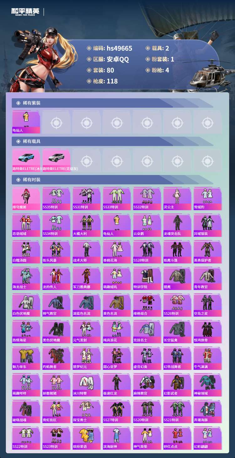 hs49665 安卓手Q-3王牌印记-1粉装-4特效枪-2载具-39319热力值-80套装-118枪