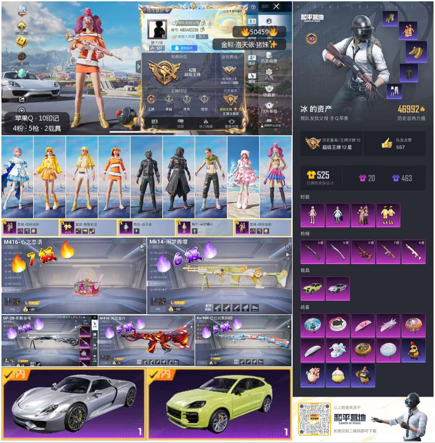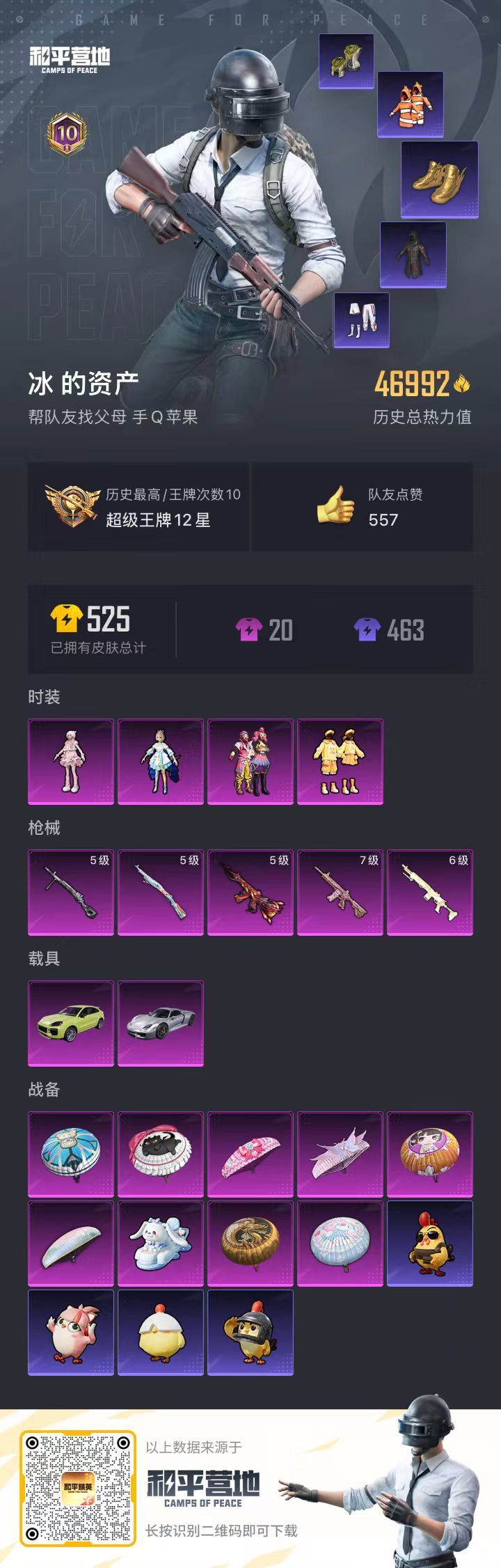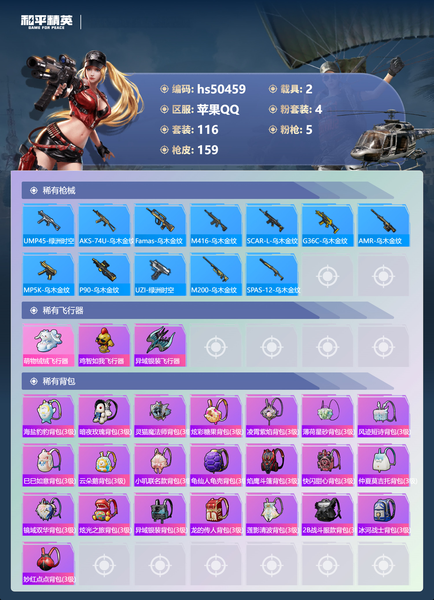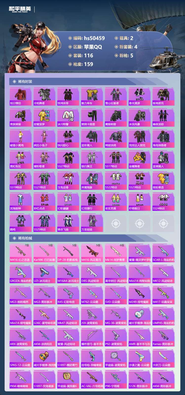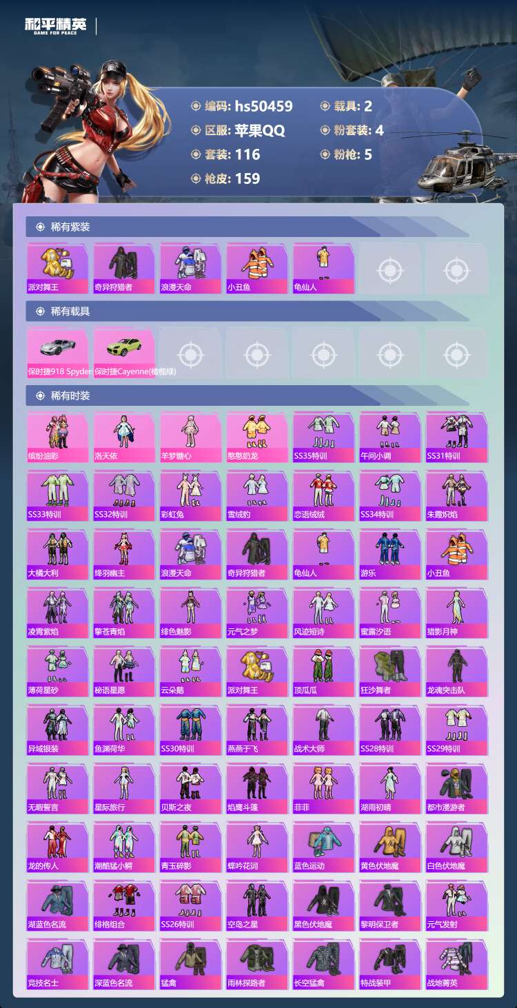 hs50459 苹果手Q-10王牌印记-4粉装-5特效枪-2载具-46992热力值-116套装-15