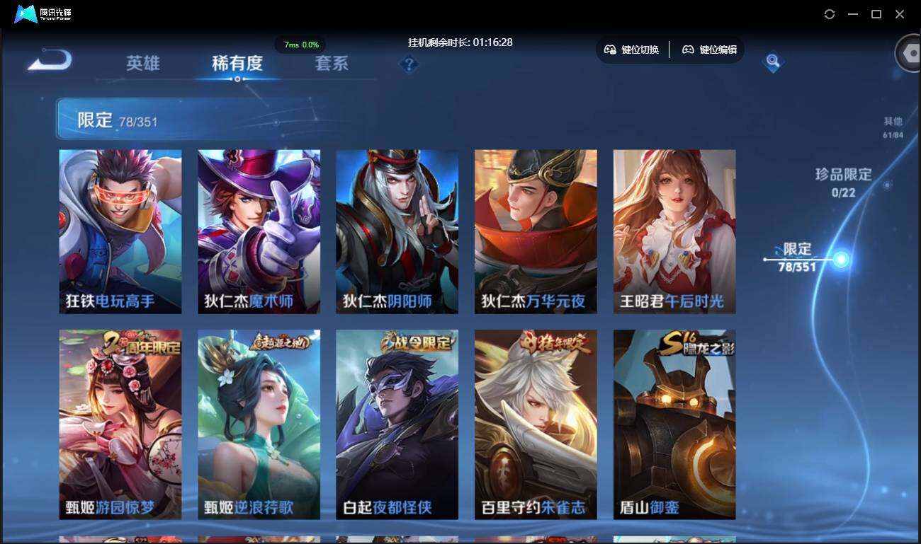 无二次-贵8-125英雄-244皮肤-1典藏-1星元-10传说-78限定-4按键-贵族积分5.2w