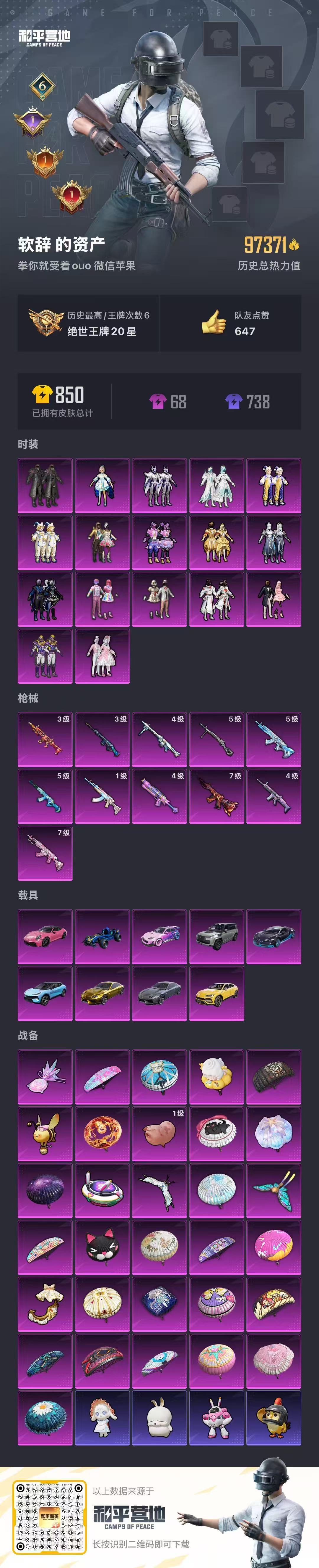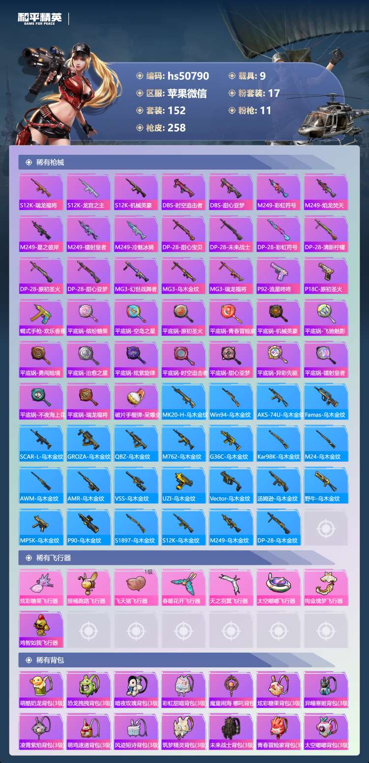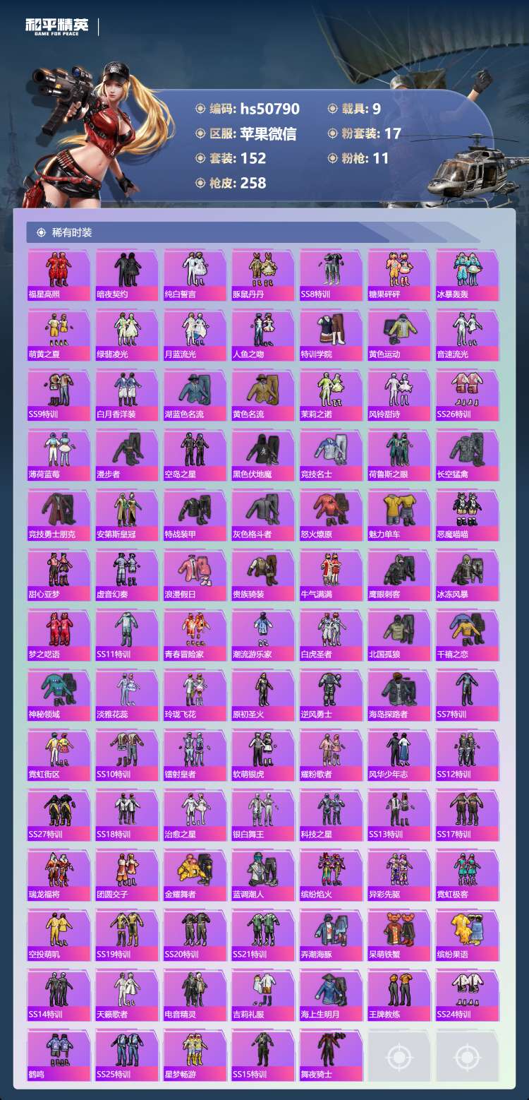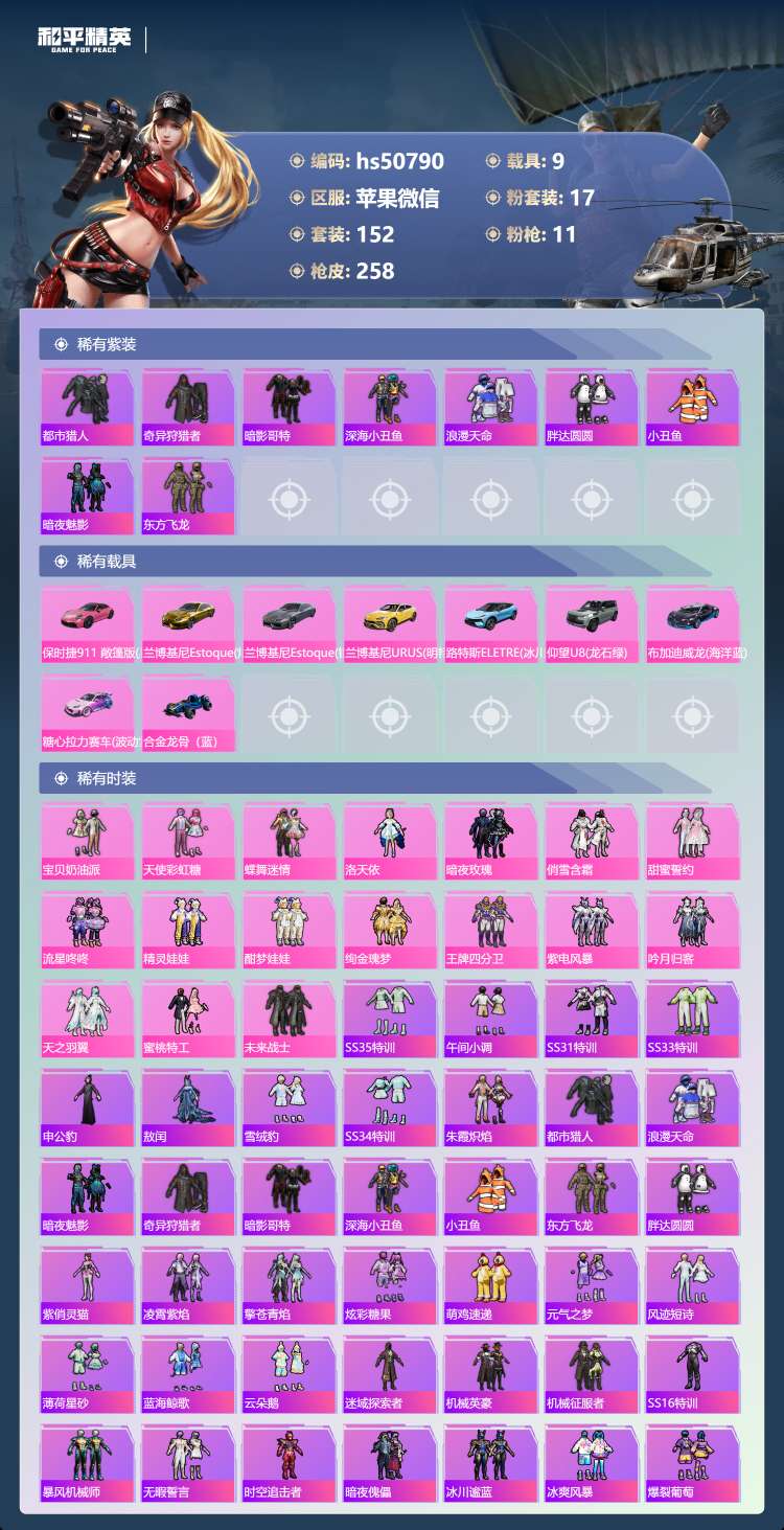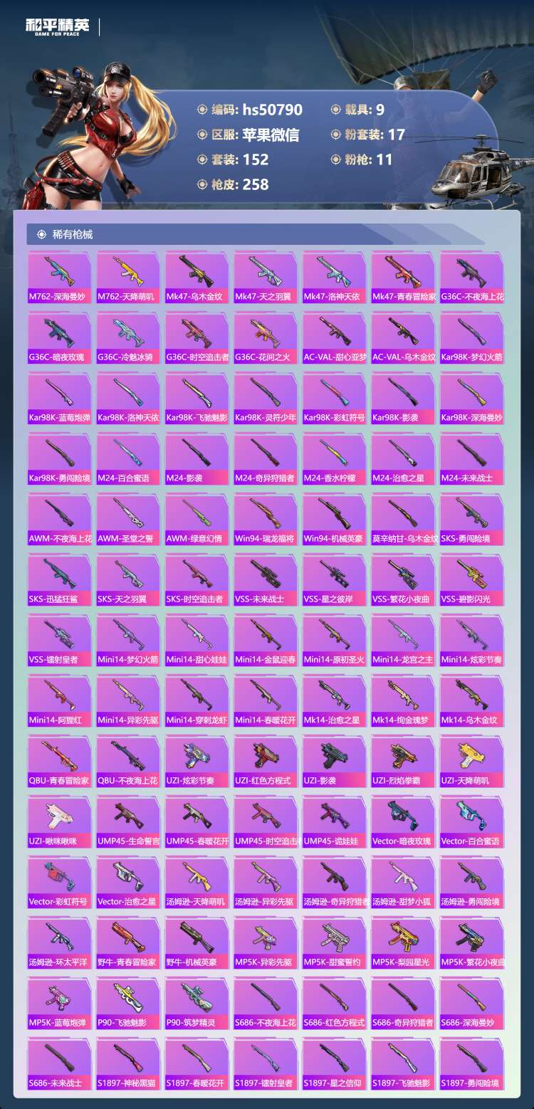 hs50790 苹果微-6王牌印记-17粉装-11特效枪-9载具-97371热力值-152套装-2