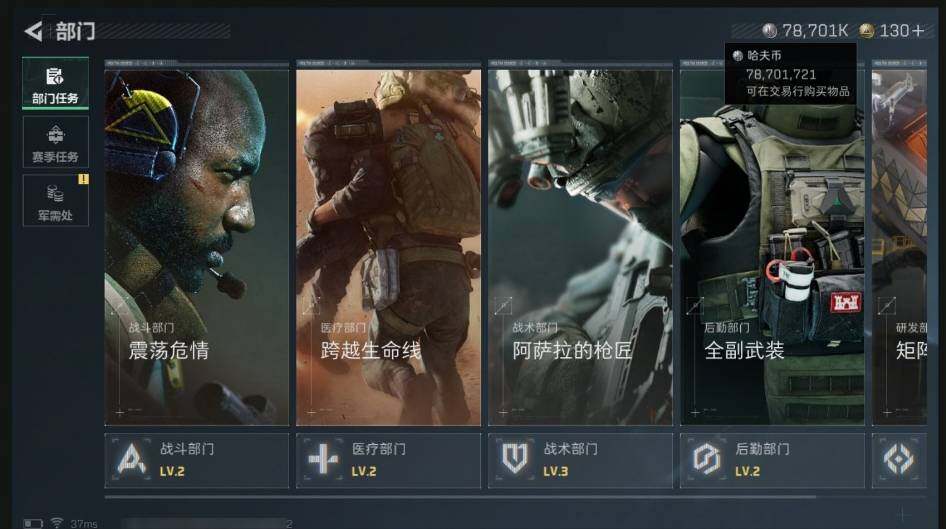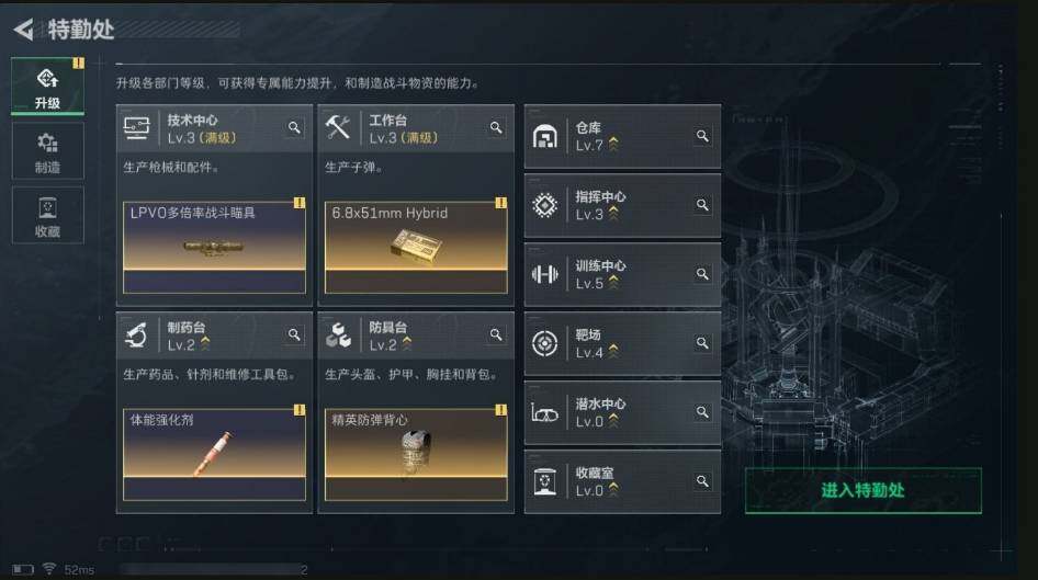 【特勤处】制药台Lv.2/工作台Lv.3/仓库Lv.7/防具台Lv.2/训练中心Lv.5/靶场Lv.4/技术中心Lv.3/指挥中心Lv.3