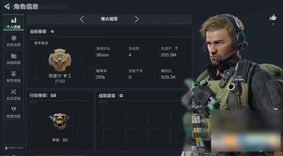 【个人信息】战场等级:1 无军衔,行动等级:60 铂金