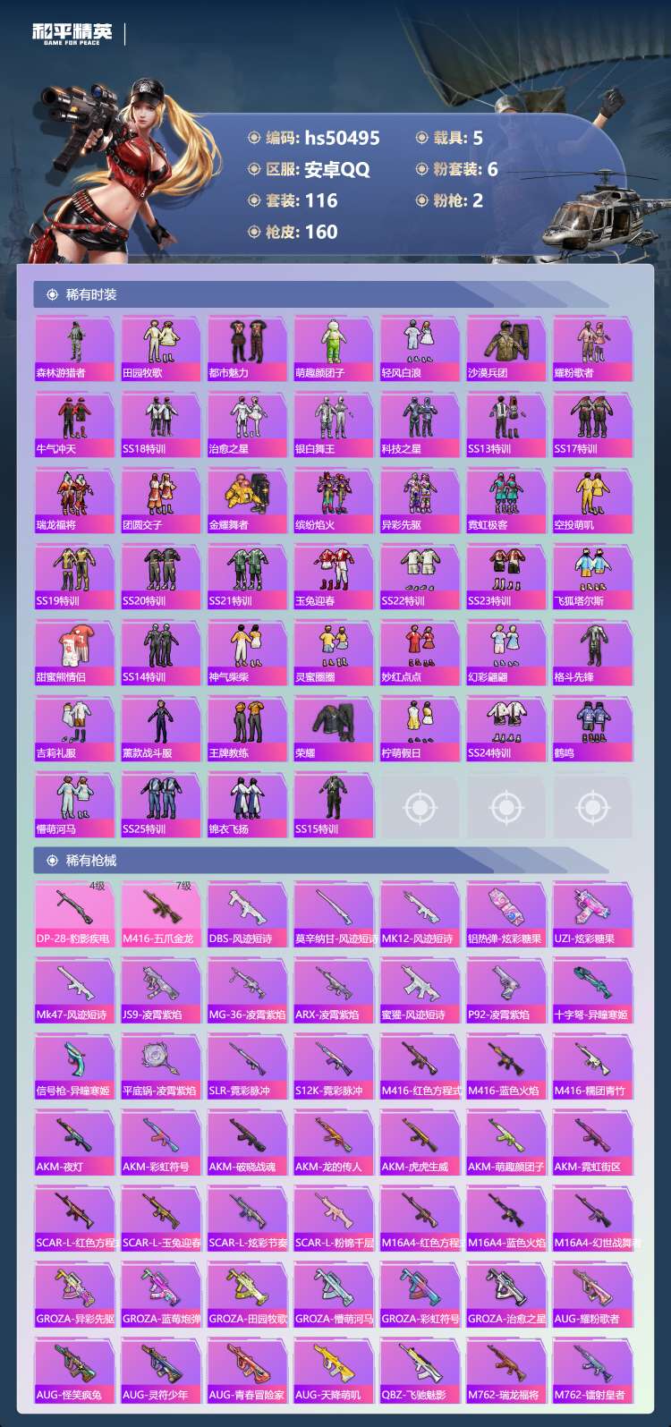 hs50495 安卓手Q-6王牌印记-6粉装-2特效枪-5载具-50965热力值-116套装-160