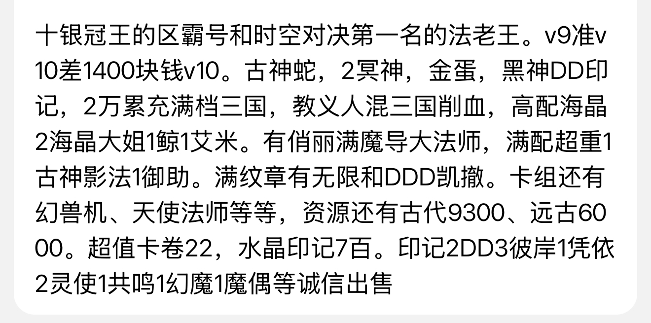 十银冠王区霸v9准v10差1400块钱v10。古神蛇,2冥神,金蛋,黑神DD印记,2万累充满档三国,教义人混三国削血,高配海晶2海晶大姐。有俏丽满魔导法师,满超重,满纹章古代9千,远古6千,卡卷22。
