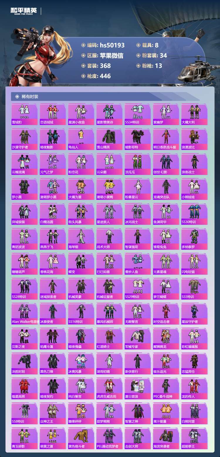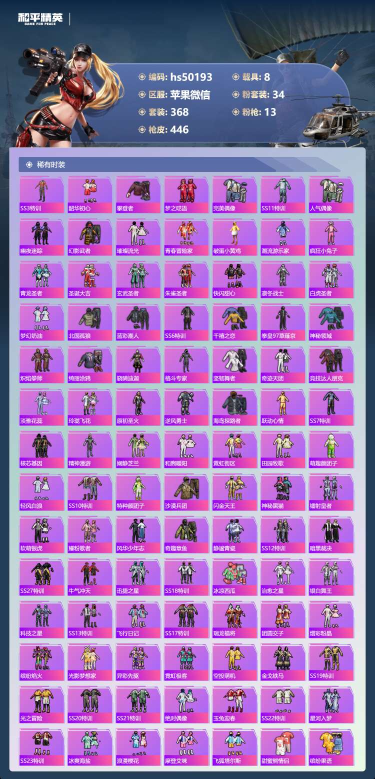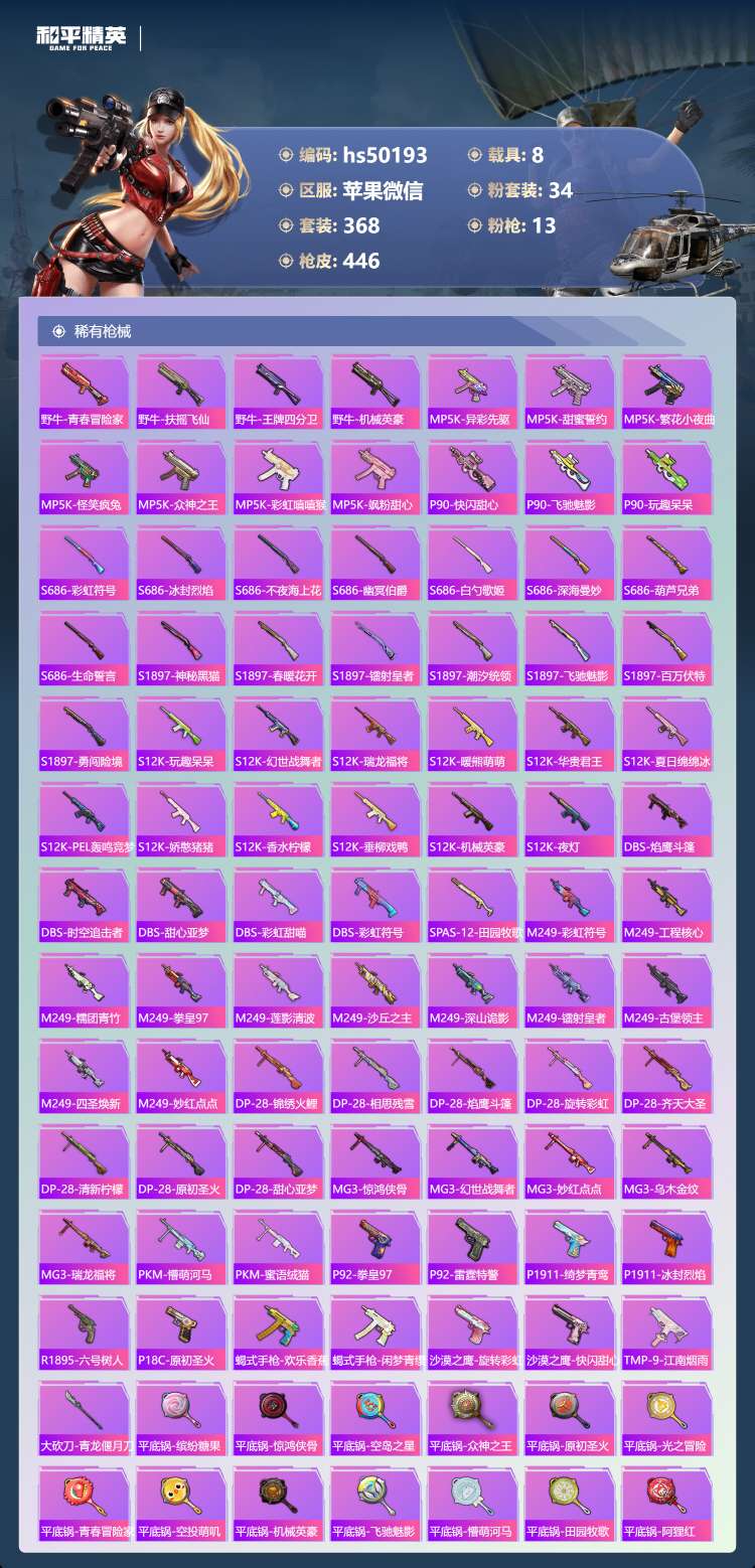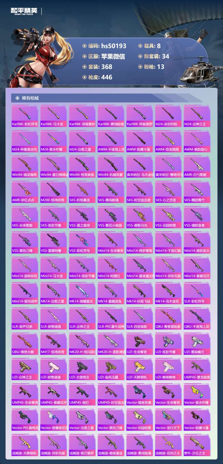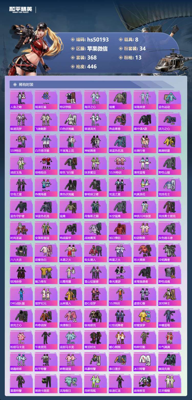 hs50193 苹果v-29王牌印记-1红装-34粉装-13特效枪-8载具-196694热力值-3