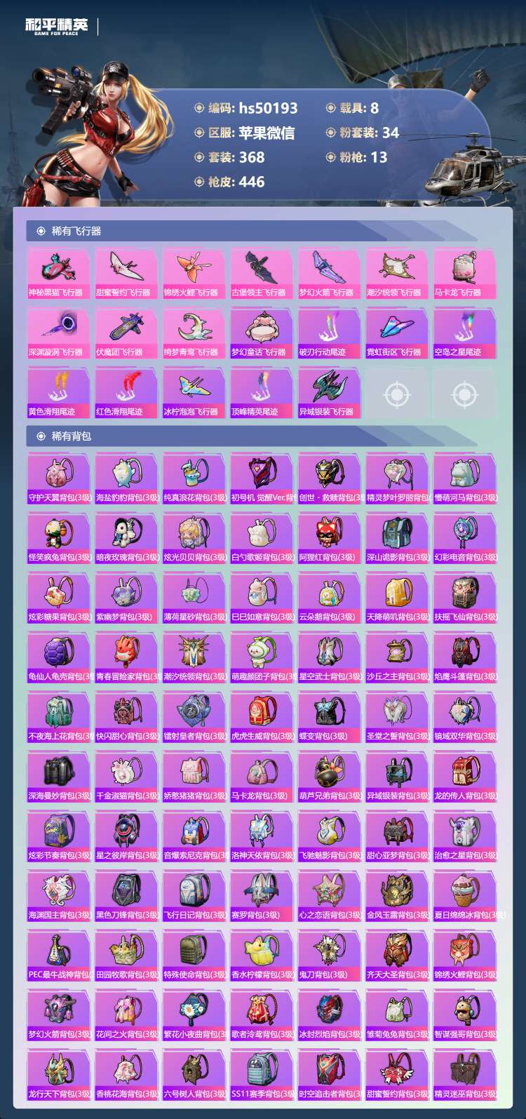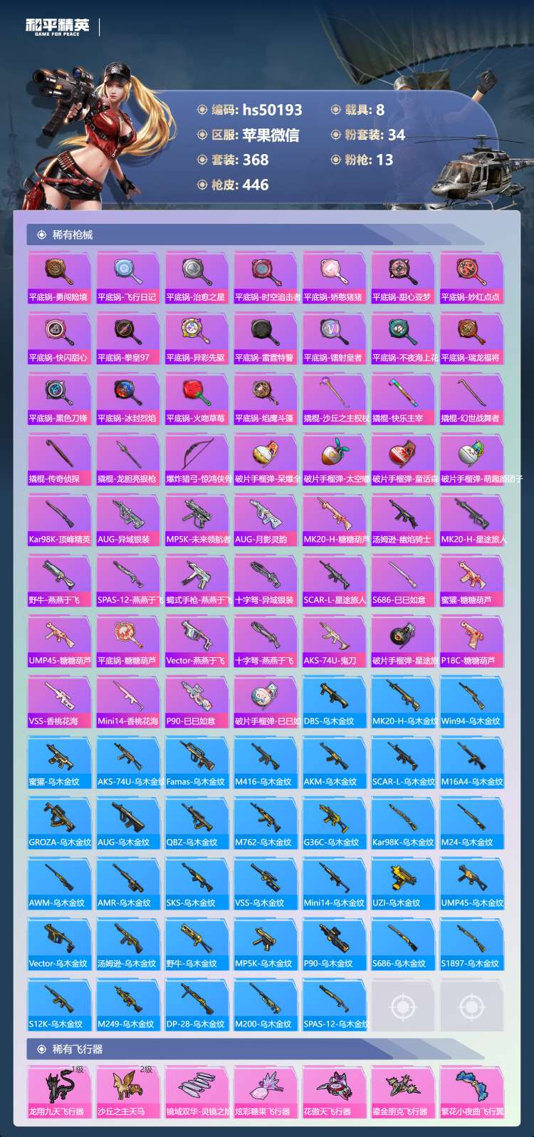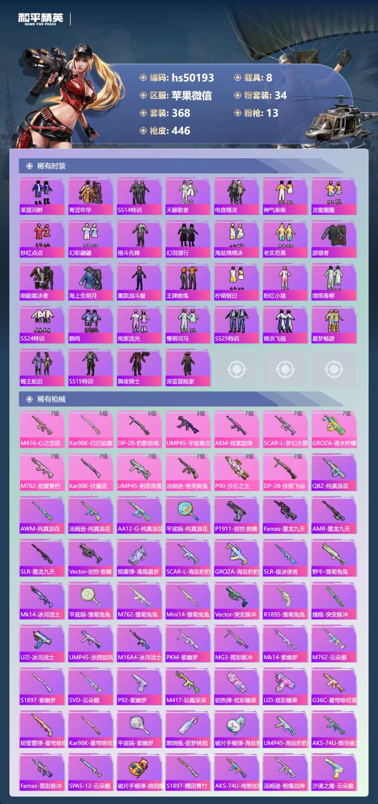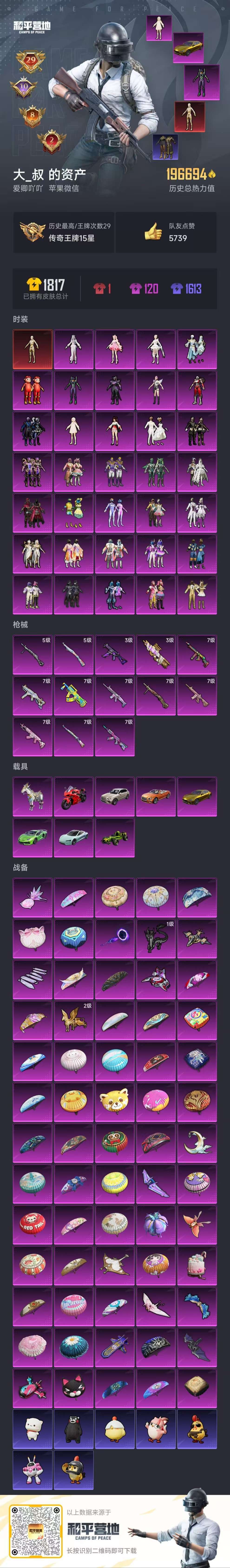 hs50193 苹果v-29王牌印记-1红装-34粉装-13特效枪-8载具-196694热力值-3