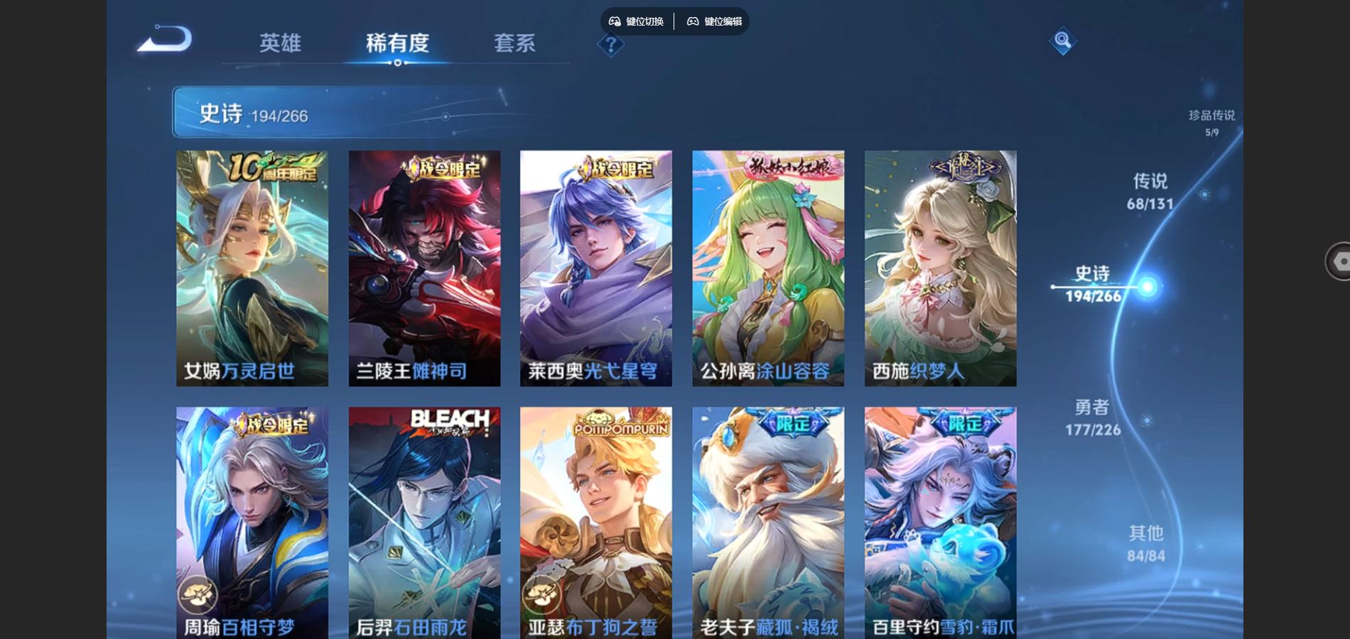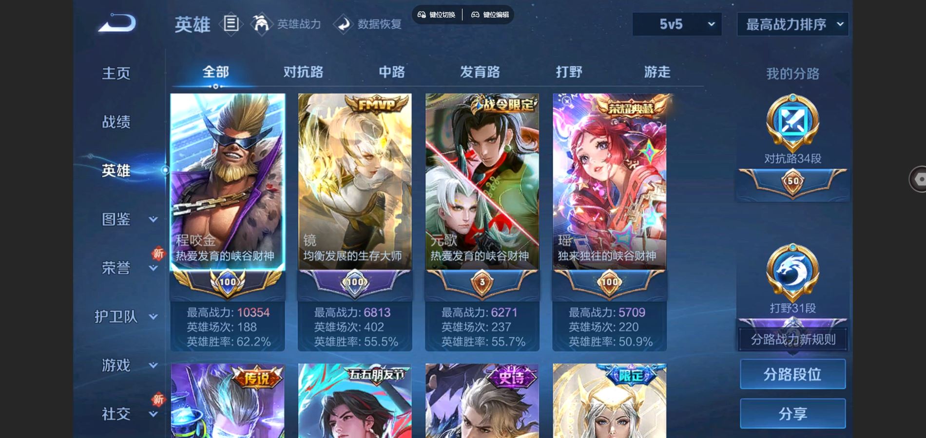 万战小国服程咬金 V10-535皮肤7典藏1无双5珍品传说68传说 对抗路34段 打野31段 6星传