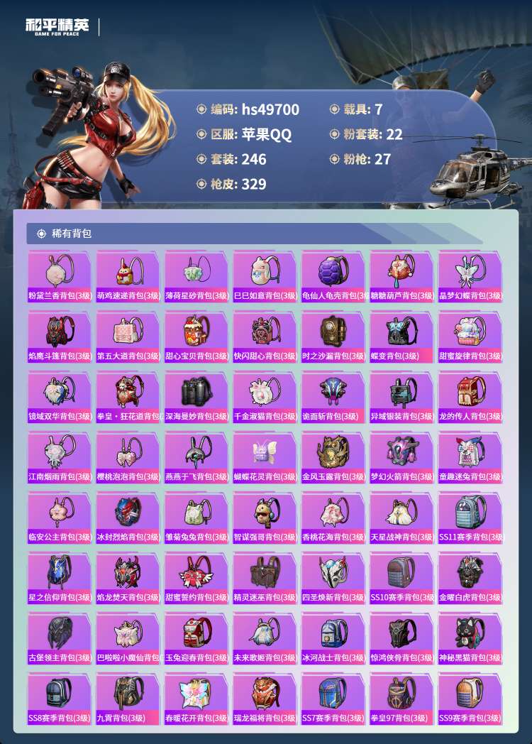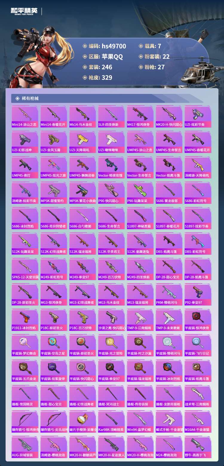 hs49700 苹果手Q-20王牌印记-有战神框-22粉装-27特效枪-7载具-134914热力值-