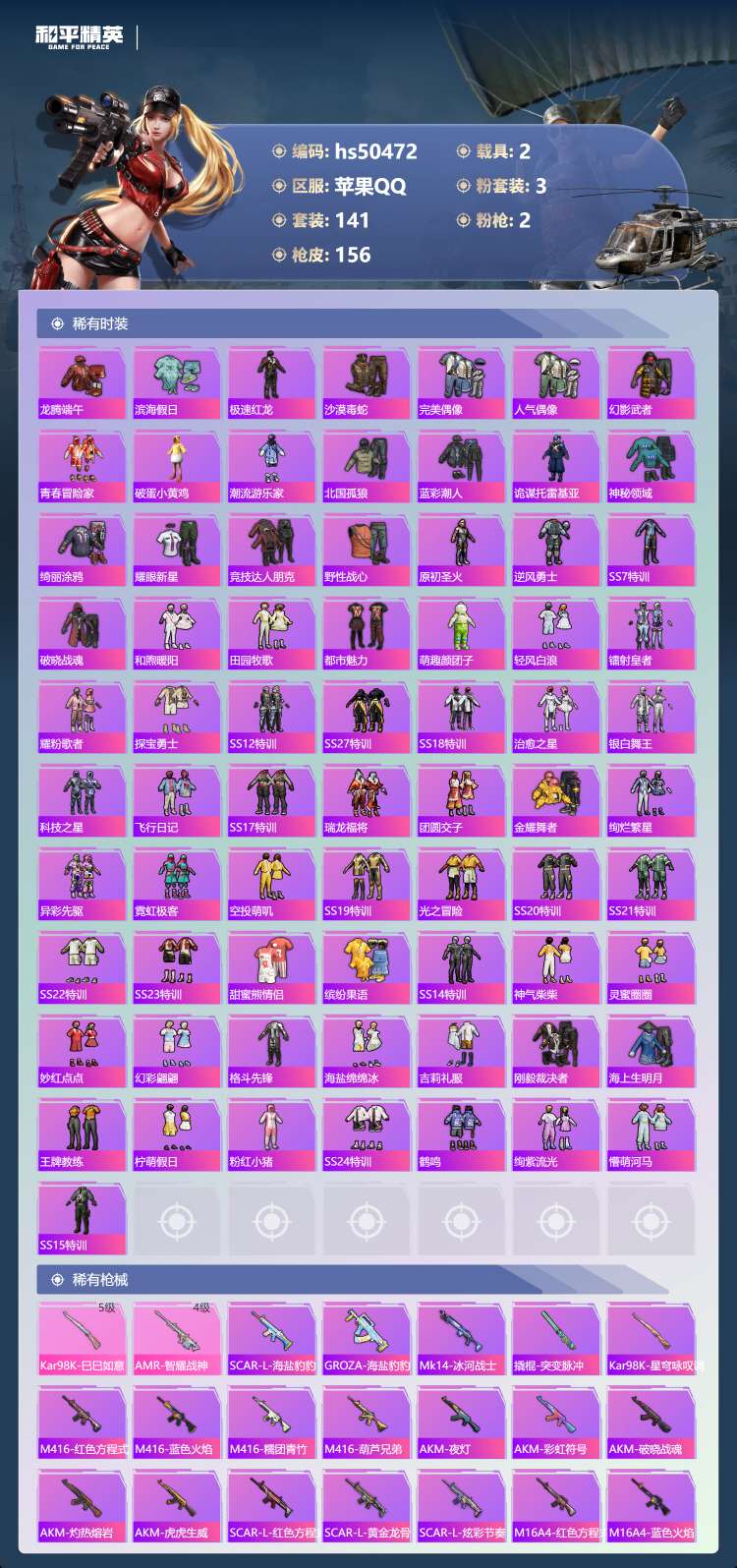 hs50472 苹果手Q-5王牌印记-3粉装-2特效枪-2载具-50417热力值-141套装-156