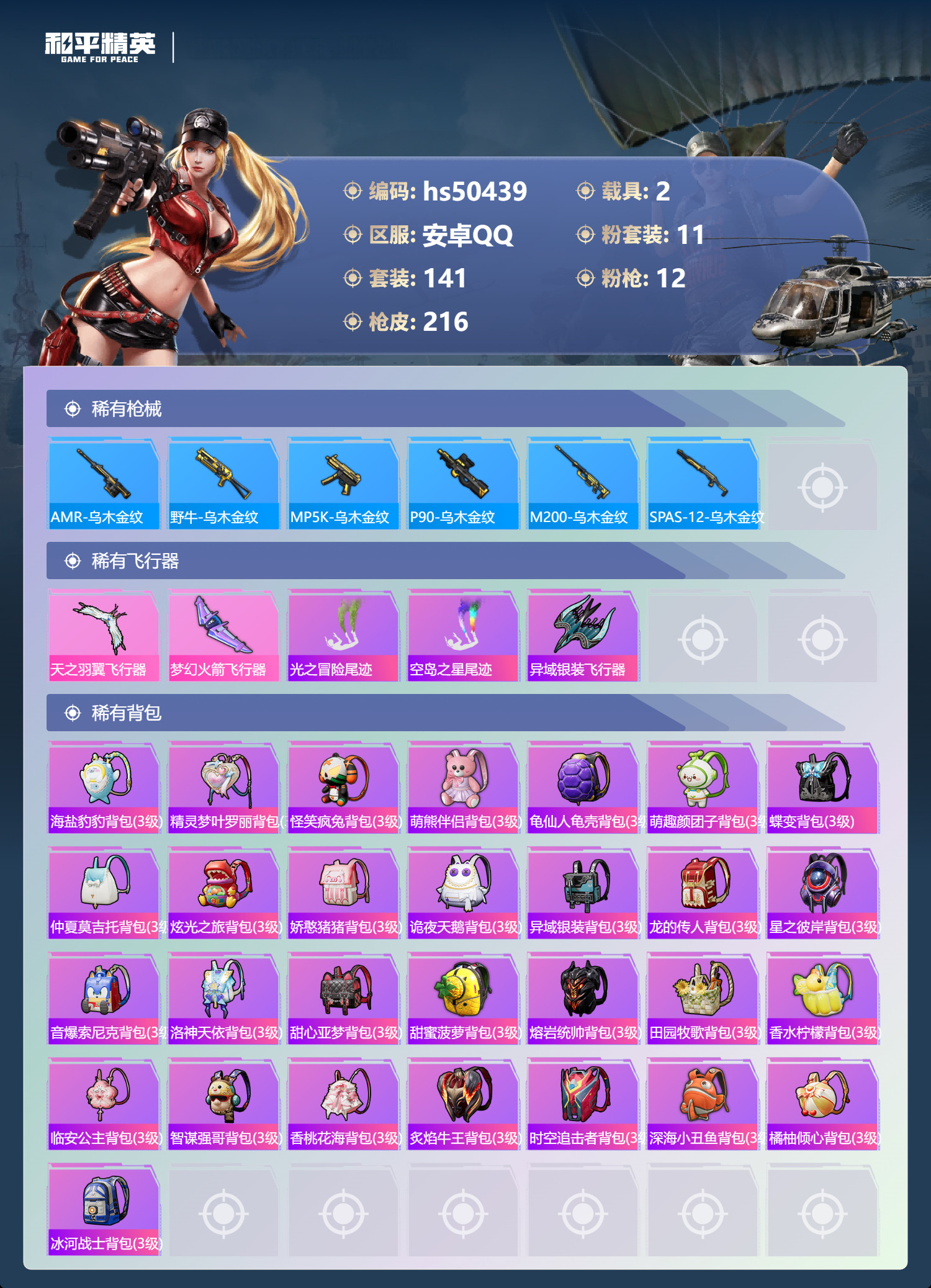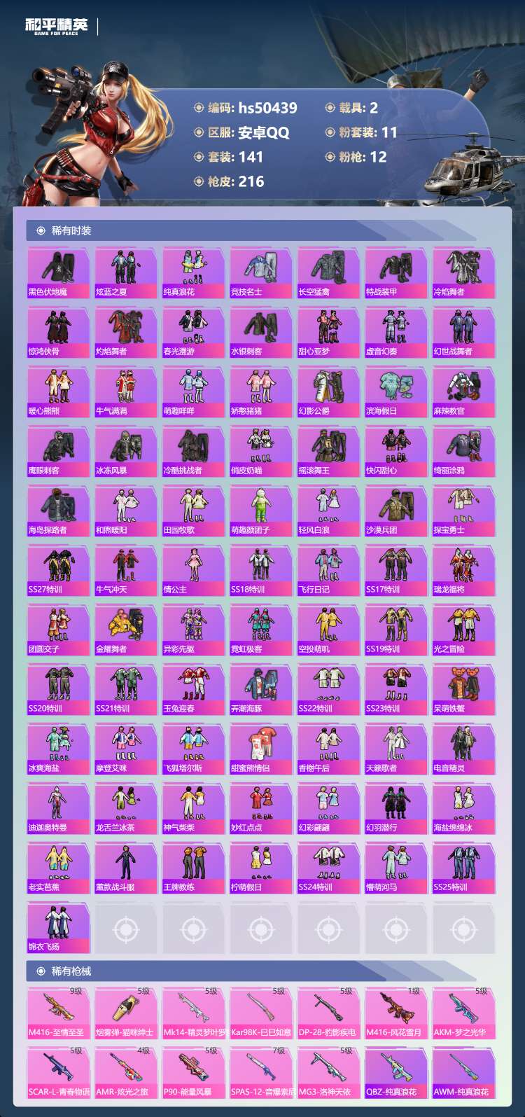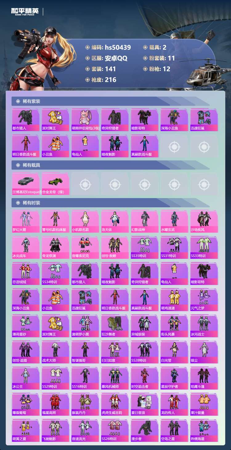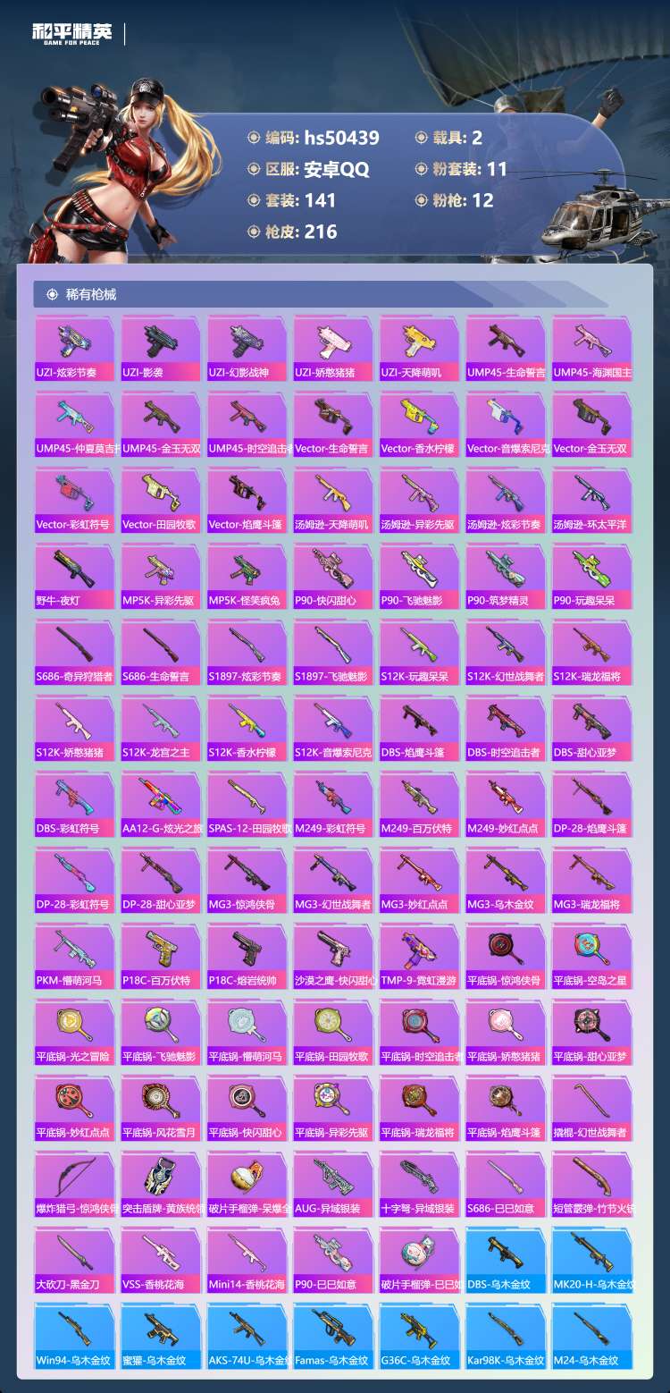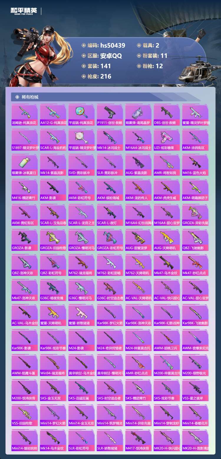hs50439 安卓手Q-10王牌印记-11粉装-12特效枪-2载具-76061热力值-141套装-