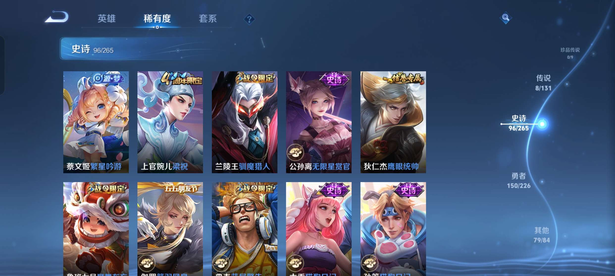 账号有7个荣耀水晶,已兑换武则天、凯、夏侯惇皮肤,另外有335个皮肤。