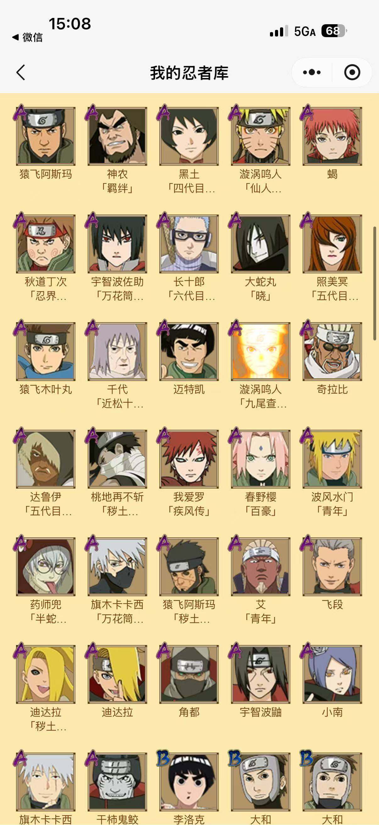 【24S38A】S级:长门「秽土转生」(3星),猿飞日斩「秽土转生」(3星),波风水门「秽土转生」(3星),千手扉间「秽土转生」(3星),宇智波带土「忍界大战」(3星),宇智波鼬「须佐能乎」(4星),宇智波斑「木叶创立」(3星),艾「四代目雷影」(3星),鬼灯幻月「二代目水影」(3星),自来也(3星),自来也「舞之豪杰」(3星),大蛇丸(5星),纲手(4星),纲手「百豪」(3星),千手柱间(3星