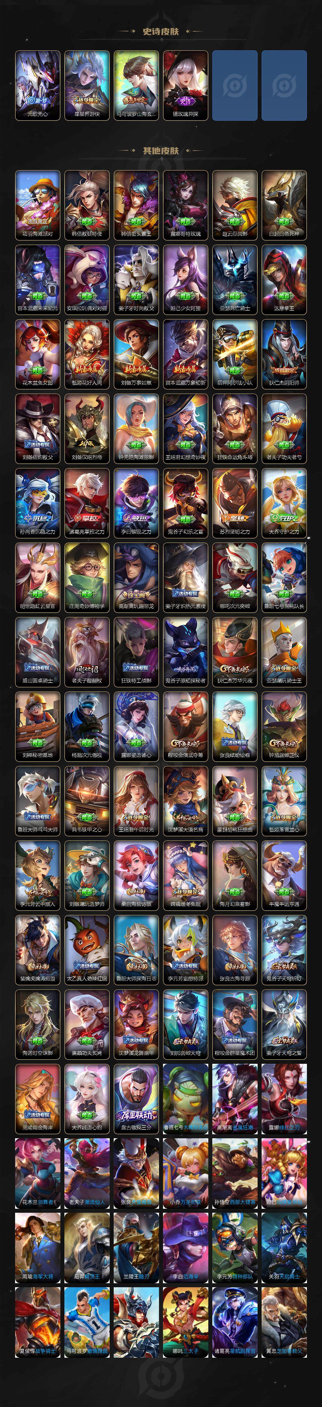 【限定皮肤】:大乔绒语心约,姜子牙天穹之誓,狄仁杰阴阳师,赵云皇家上将,高渐离玩趣恶龙,钟无艳超时空战士,元歌云间偶戏,元歌无心,甄姬落雪兰心,马可波罗山海玄木吟,狄仁杰魔术师,狄仁杰万华元夜,项羽海滩派对,老夫子醍醐杖,程咬金演武夺筹,王昭君午后时光,亚瑟潮玩骑士王,李元芳云中旅人,钟馗驱傩正仪,蔡文