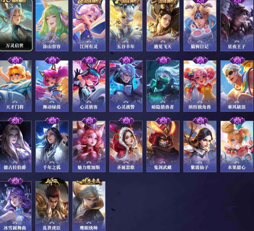 【史诗皮肤】25 女娲_万灵启世 公孙离_涂山容容 阿古朵_江河有灵 鬼谷子_五谷丰年 杨玉环_遇见飞天 孙策_猫狗日记 白起_星夜王子 刘禅_天才门将 蔡文姬_舞动绿茵 安琪拉_心灵骇客 亚瑟_心灵战警 兰陵王_暗隐猎兽者 小乔_缤纷独角兽 夏侯惇_乘风破浪 刘邦_德古拉伯爵 李白_千年之狐 妲己_魅力维加斯