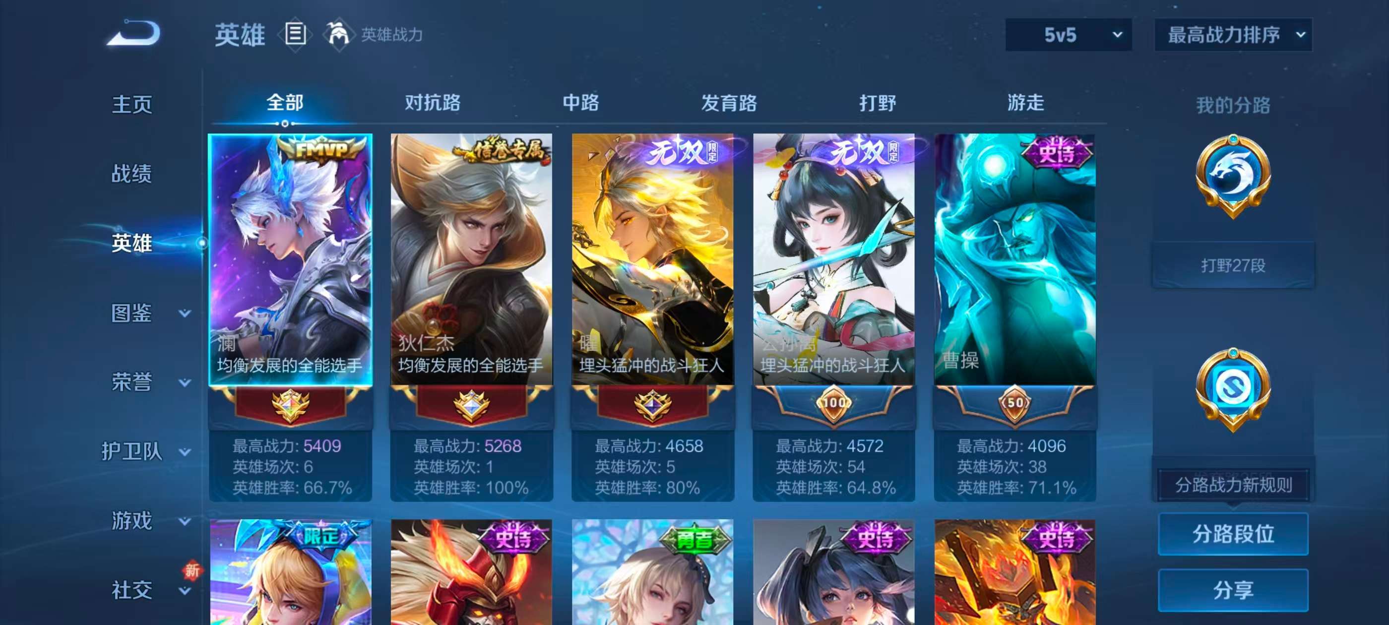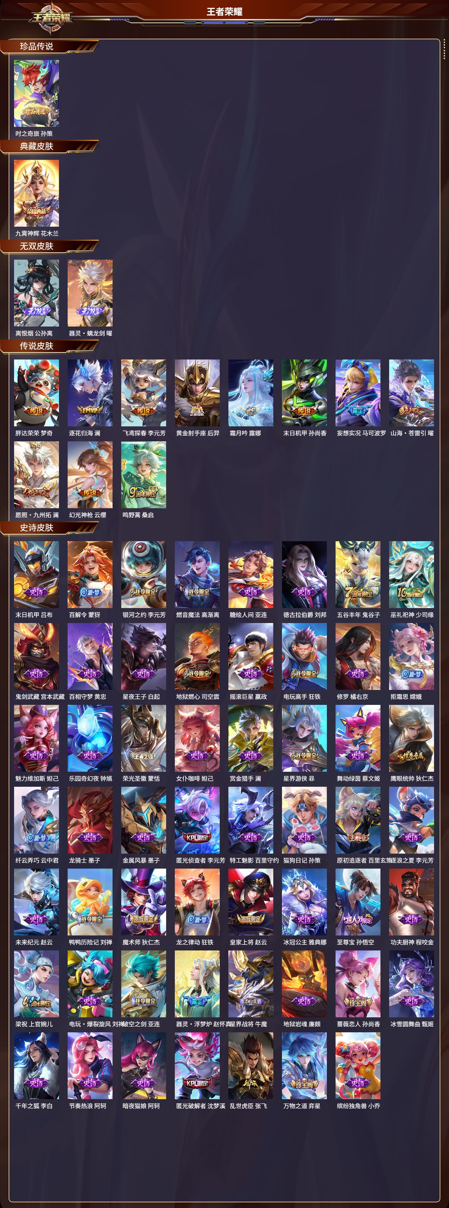 安卓QQ/绝世王者/232皮肤/127英雄/1典藏/0珍品无双/2无双/1珍品传说/11传说/63史